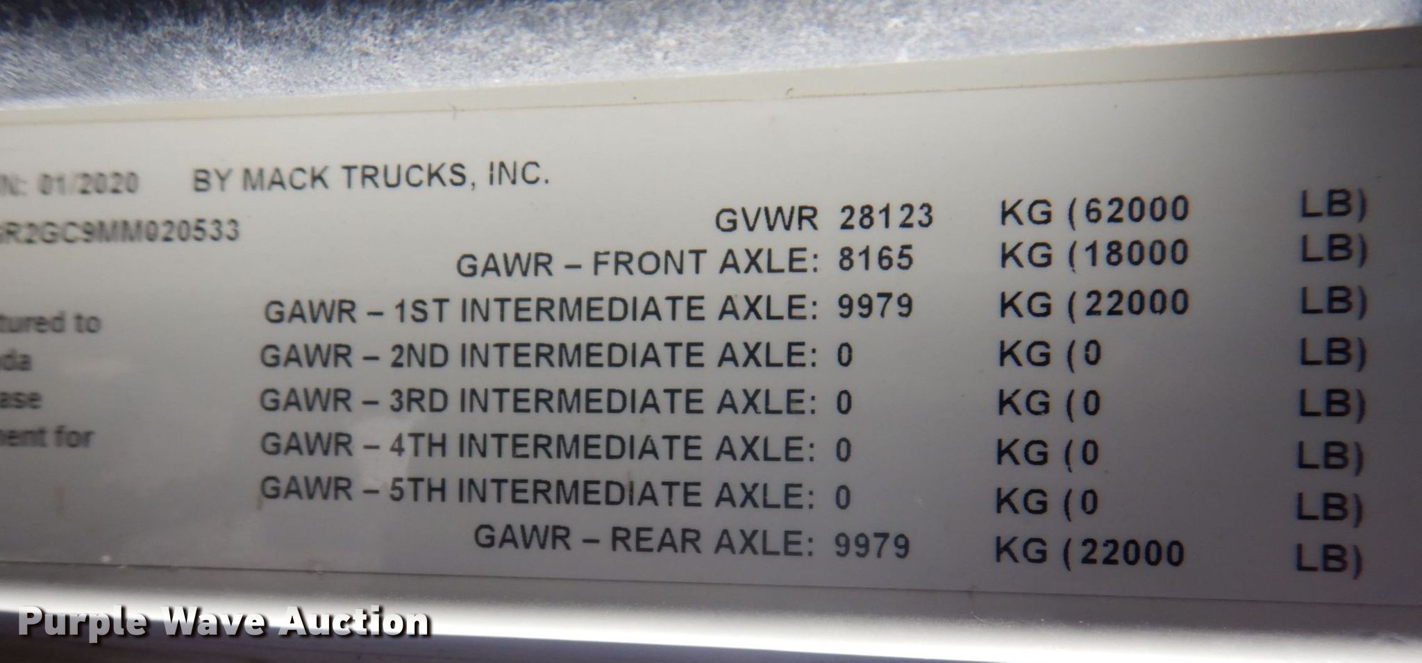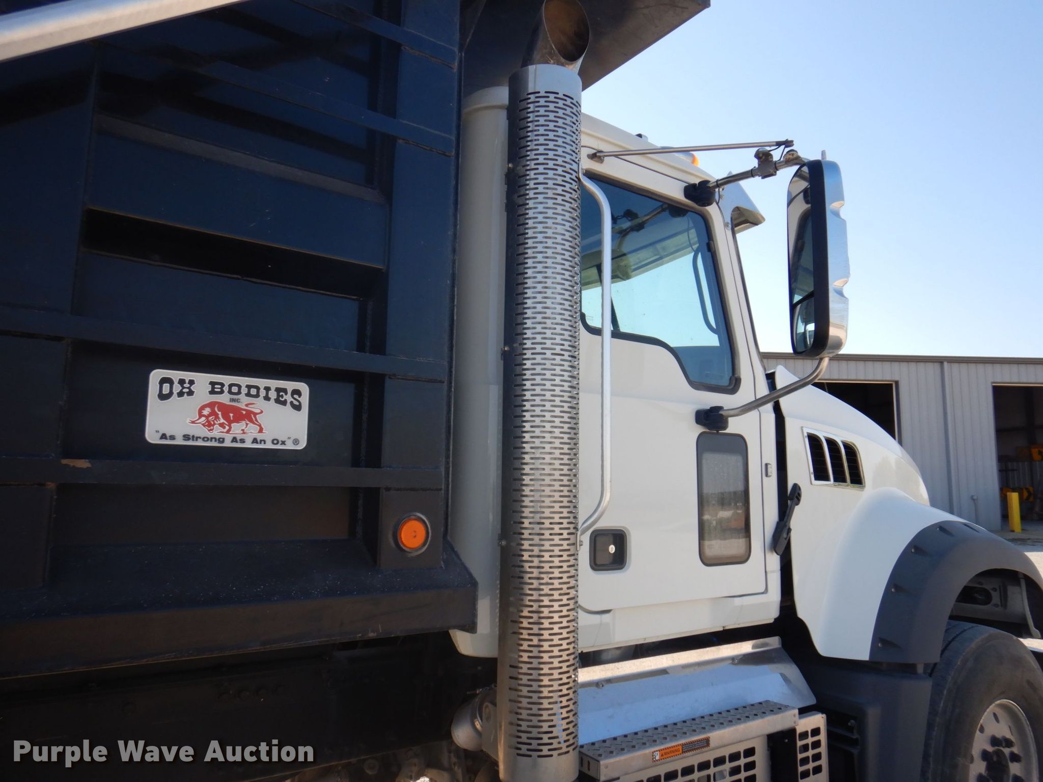 2021 Mack Granite GR64F dump truck. Miles: 53,869 on odometer, Hours: 2,251 on meter, VIN: 1M2GR2GC9MM020533. Engine Mack MP7-425M, Serial: 620324, Displacement: 10.8L, Cylinders: 6, Fuel type: Diesel, HP: 425, Engine brake. Transmission Mack M Drive, Automatic. Chassis Axles: Tandem, Differential lock: Inter-axle, Suspension: Camelback, Brakes: Air, PTO, GVWR: 62,000 lbs FAWR: 18,000 lbs, IAWR: 22,000 lbs, RAWR: 22,000 lbs. Interior AC, Heat, Heated mirrors, Power windows, Cruise control. Features Dump bed Ox Bodies 1 6FT 19/19YD, 16' L x 8' W, Side height: 63", Bed type: Steel, Roll tarp, Ram: Single , End gate: Air operated. Tires Front: 425/65R22.5, Rear: 11R24.5. Notes Front tires will be replaced prior to auction. Missouri title. Seller is a government entity who will be assigning and distributing the title. Please contact the seller for distribution questions. Andrew County Missouri. 15950 County Road 322. Savannah, MO 64485