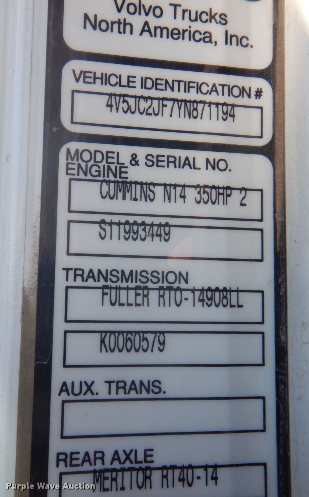2000 Volvo WG dump truck. Miles: 246,734 on odometer, Hours: 4,528 on meter, VIN: 4V5JC2JF7YN871194. Engine Cummins N14-350EI, Serial: 11993449, Displacement: 14.0L, Cylinders: 6, Fuel type: Diesel, HP: 350. Transmission Eaton Fuller 8LL, Manual, Speed: 10. Chassis Axles: Tandem, Differential lock: Inter-axle, Suspension: Spring over walking beam, Brakes: Air, PTO, FAWR: 18,000 lbs. Interior AC, Heat, Cruise control. Features Dump bed HilBilt 15, 15' L x 8' W, Side height: 63", Bed type: Steel, Ram: Single , End gate: Air operated. Tires Size: 11R22.5. Notes Possible AC issues, may need charged, Windshield chipped or cracked. Missouri title. Seller is a government entity who will be assigning and distributing the title. Please contact the seller for distribution questions. Andrew County Missouri. 15950 County Road 322. Savannah, MO 64485