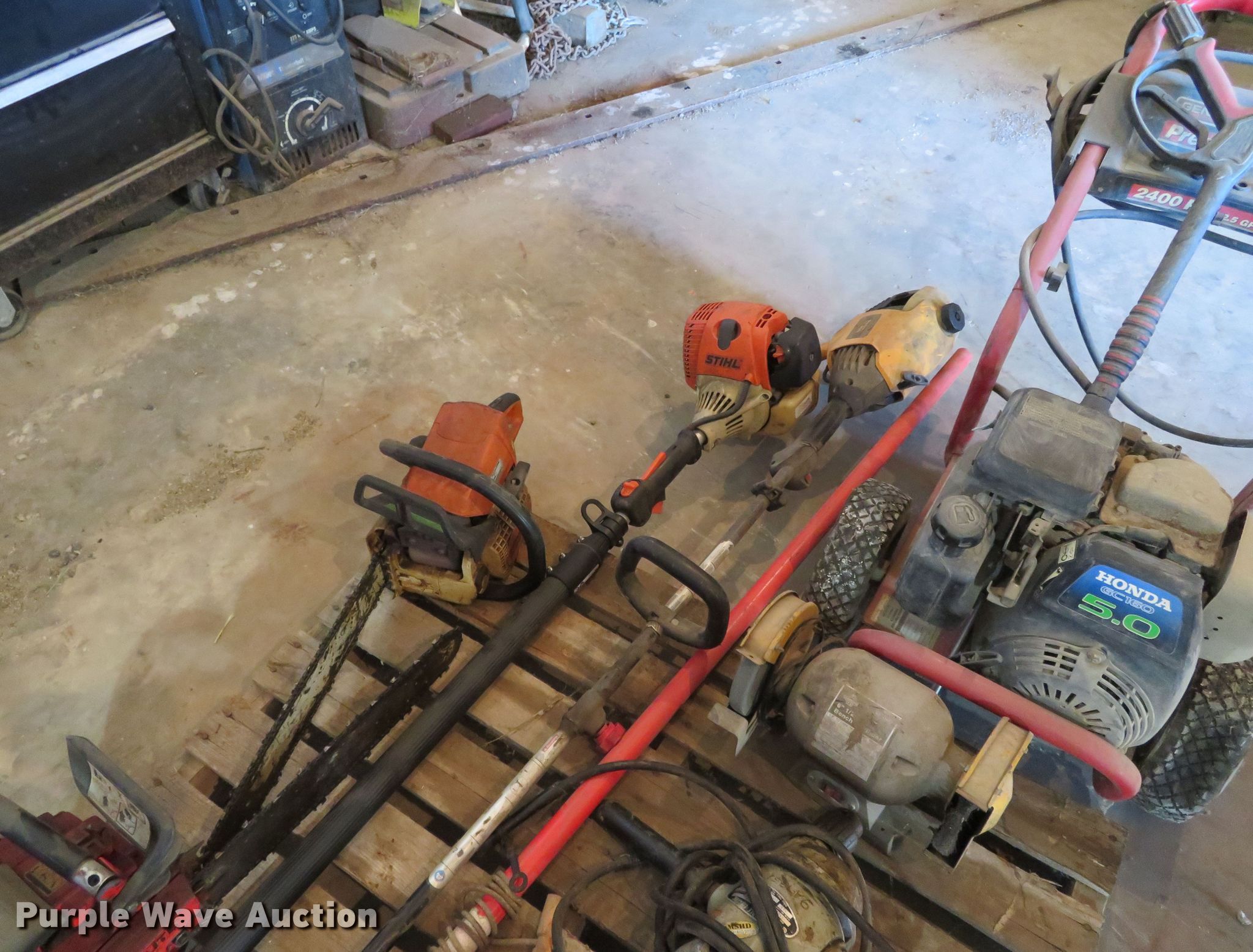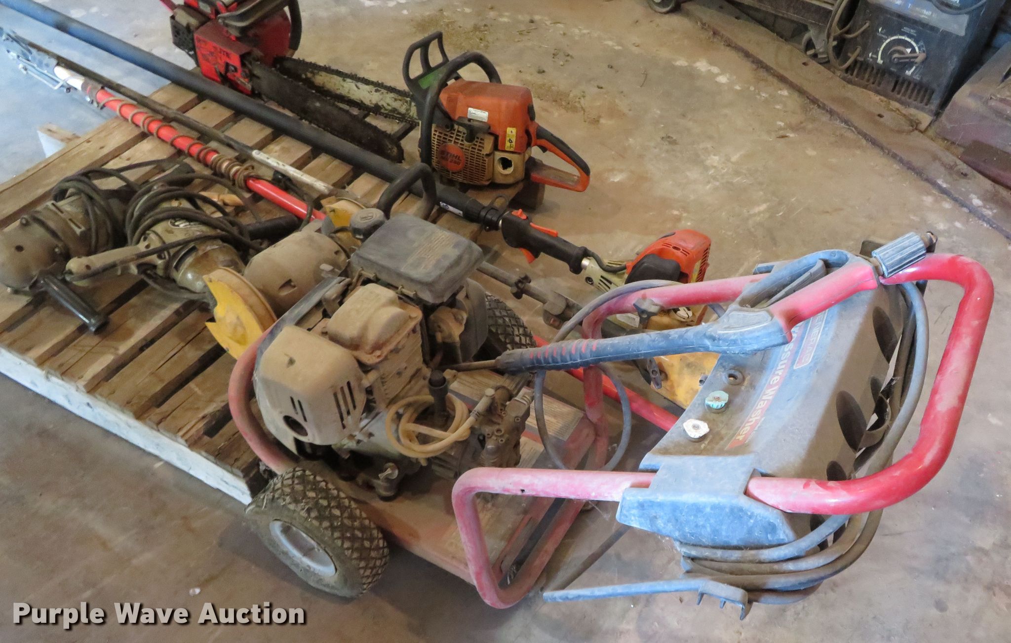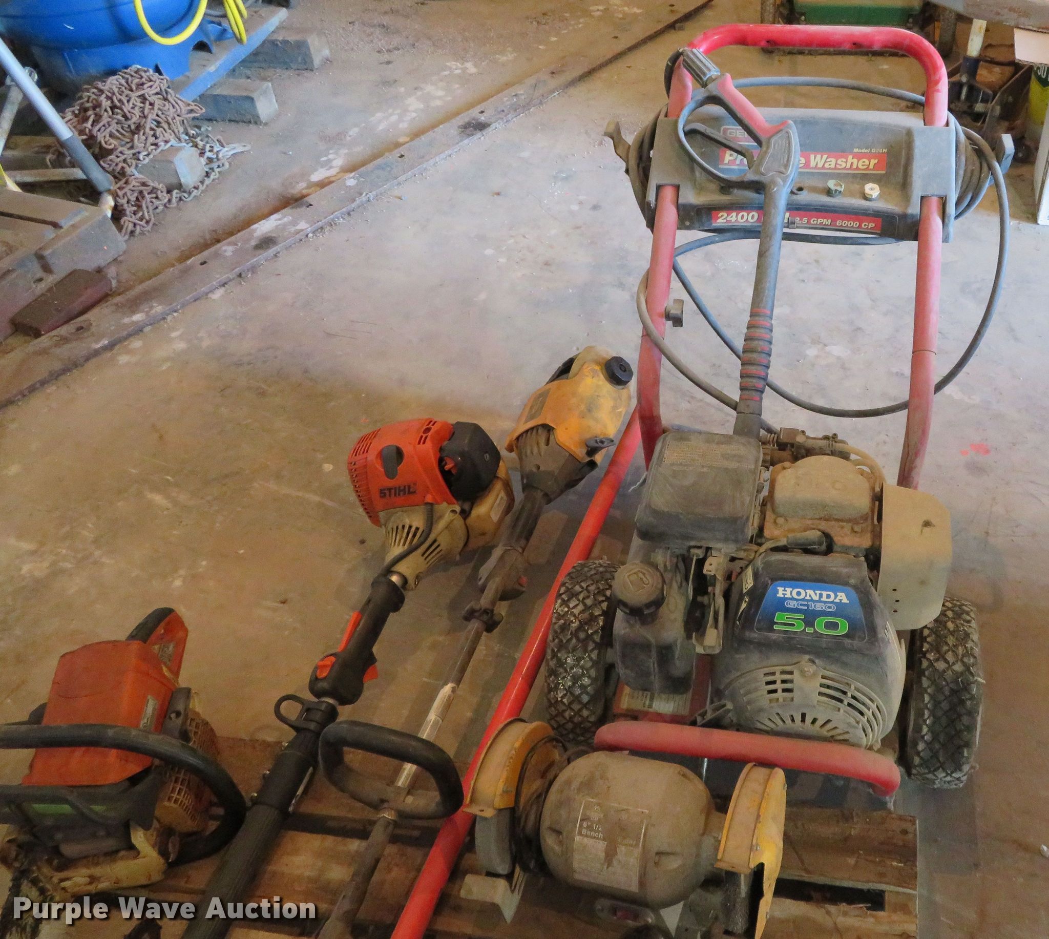 Purple Wave is selling a used Tools in Missouri. This item is a Tools with the following: Pressure washer, (2) chainsaws, (2) pole saws, Black & Decker angle grinder, Sioux 1/2" drill, Bench grinder, Unknown operating condition