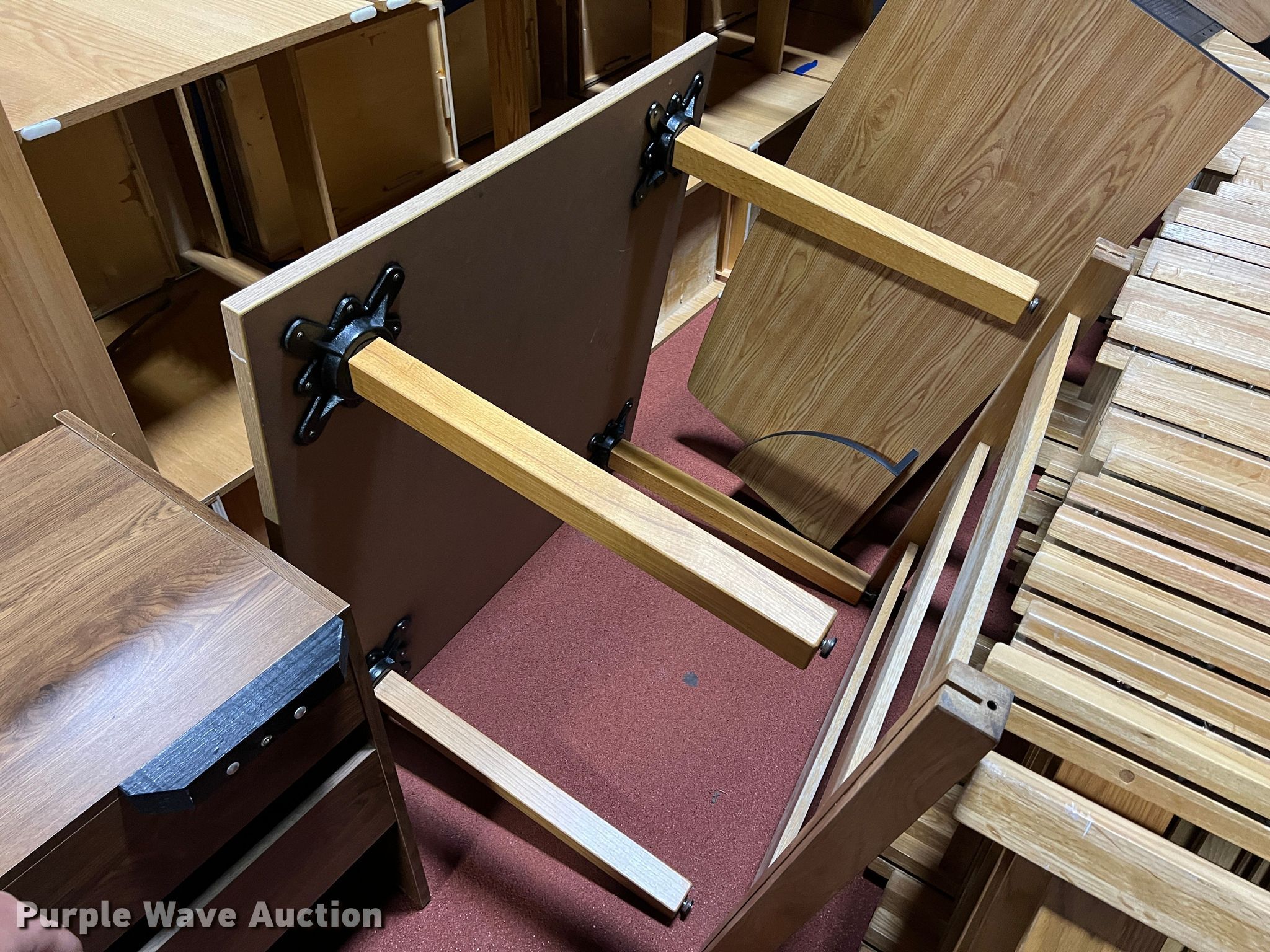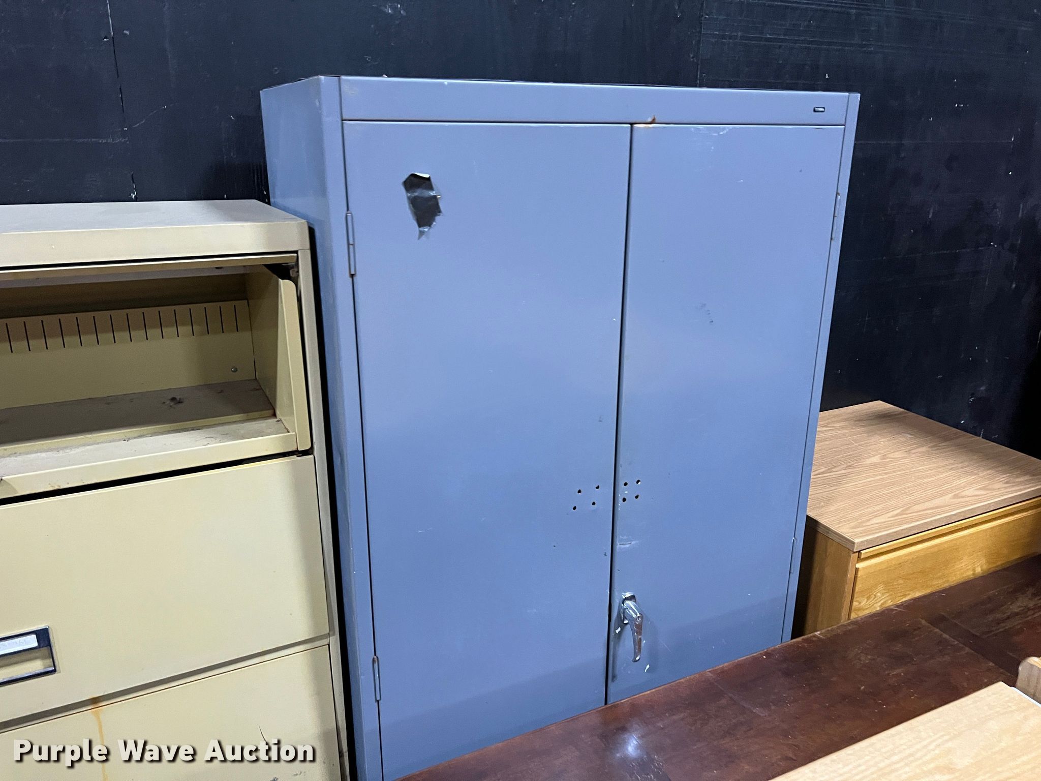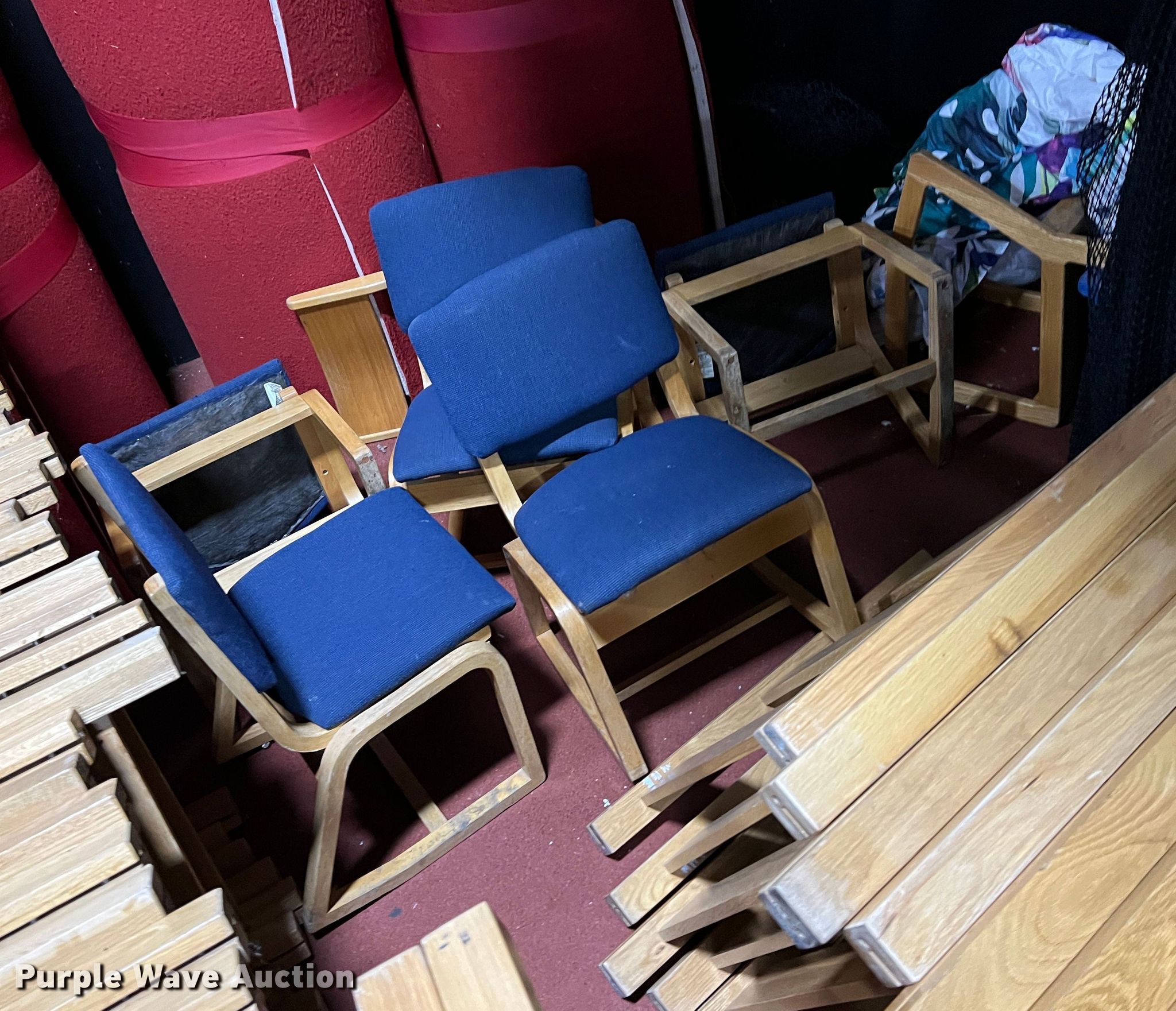 Purple Wave is selling a used Furniture in Kansas. This item is a Furniture with the following: (6) chairs, Approx. 55 headboards, Approx. 3 tables, Approx. 32 desks, Shelf, Metal cabinet and more