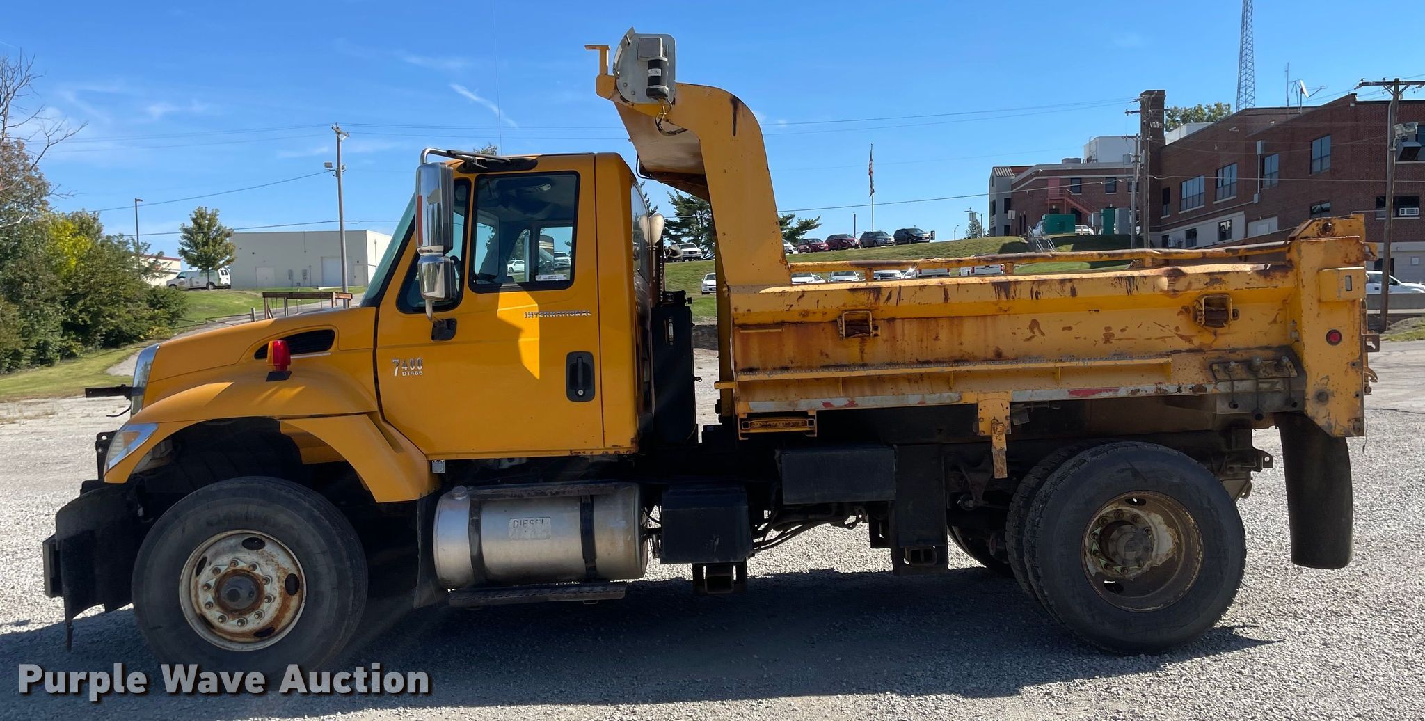 2005 International 7400 dump truck. Miles: 194,065 on odometer, Hours: 11,300 on meter, VIN: 1HTWDAAR15J144369. Engine International DT466, Displacement: 7.6L, Cylinders: 6, Fuel type: Diesel. Transmission Allison, Automatic. Chassis Axles: Single, Suspension: Spring, Brakes: Air, Front mount PTO, Wheelbase: 171". Interior AC, Heat, Heated mirrors, Power windows, Cruise control. Features Dump bed 10' L x 96" W, Side height: 24", Bed type: Steel, Ram: Single , End gate: Air operated. Tires Front: 315/80R22.5, Rear: 11R22.5. Notes Dash warning indicator: ABS. Missouri title. 3602 N Belt Hwy. Saint Joseph, MO 64506