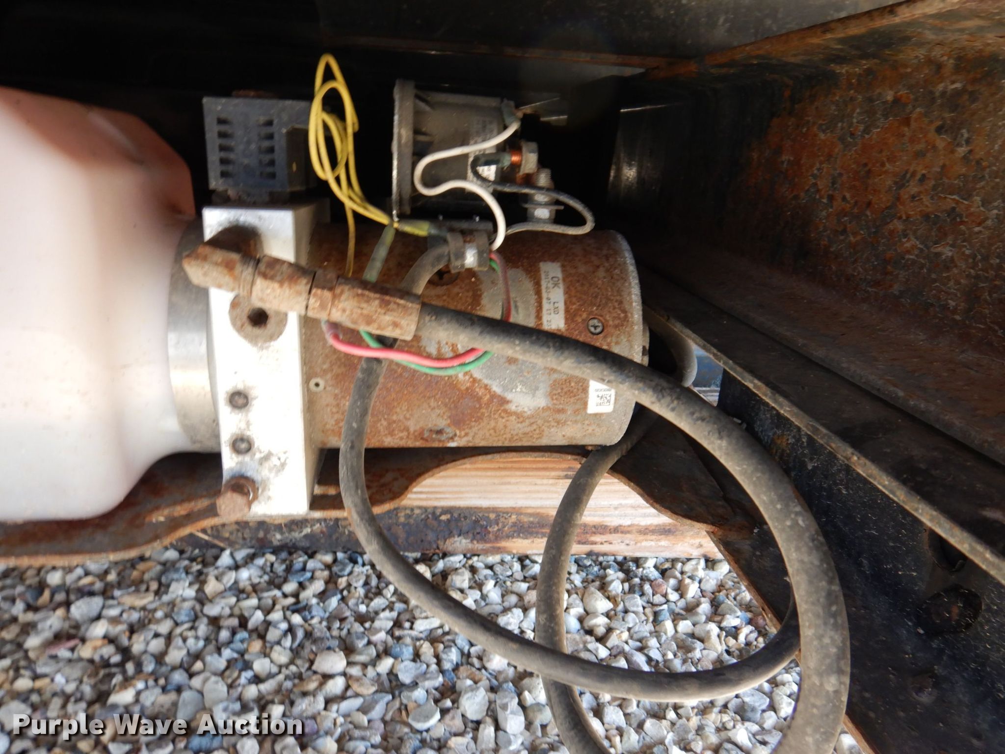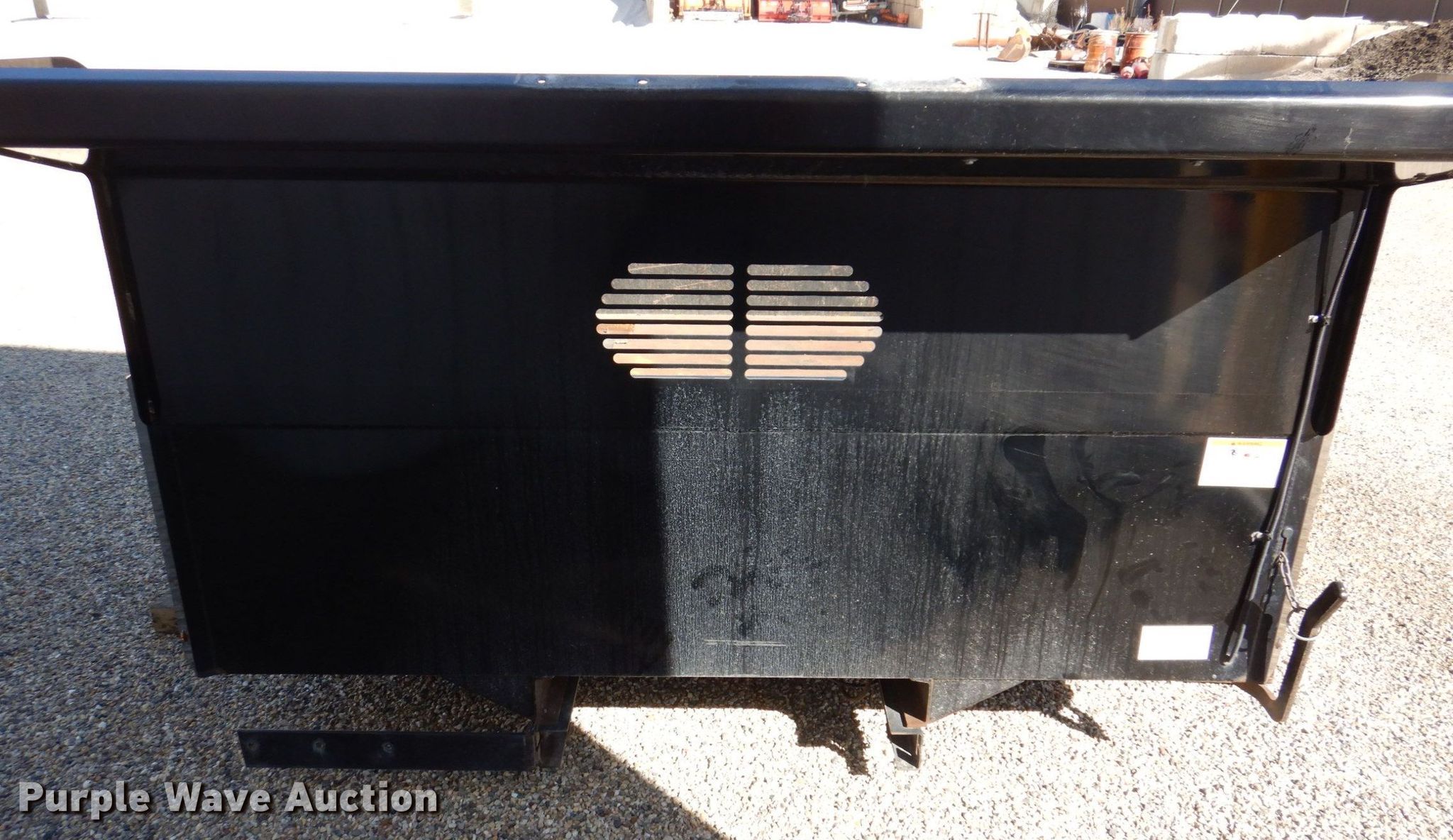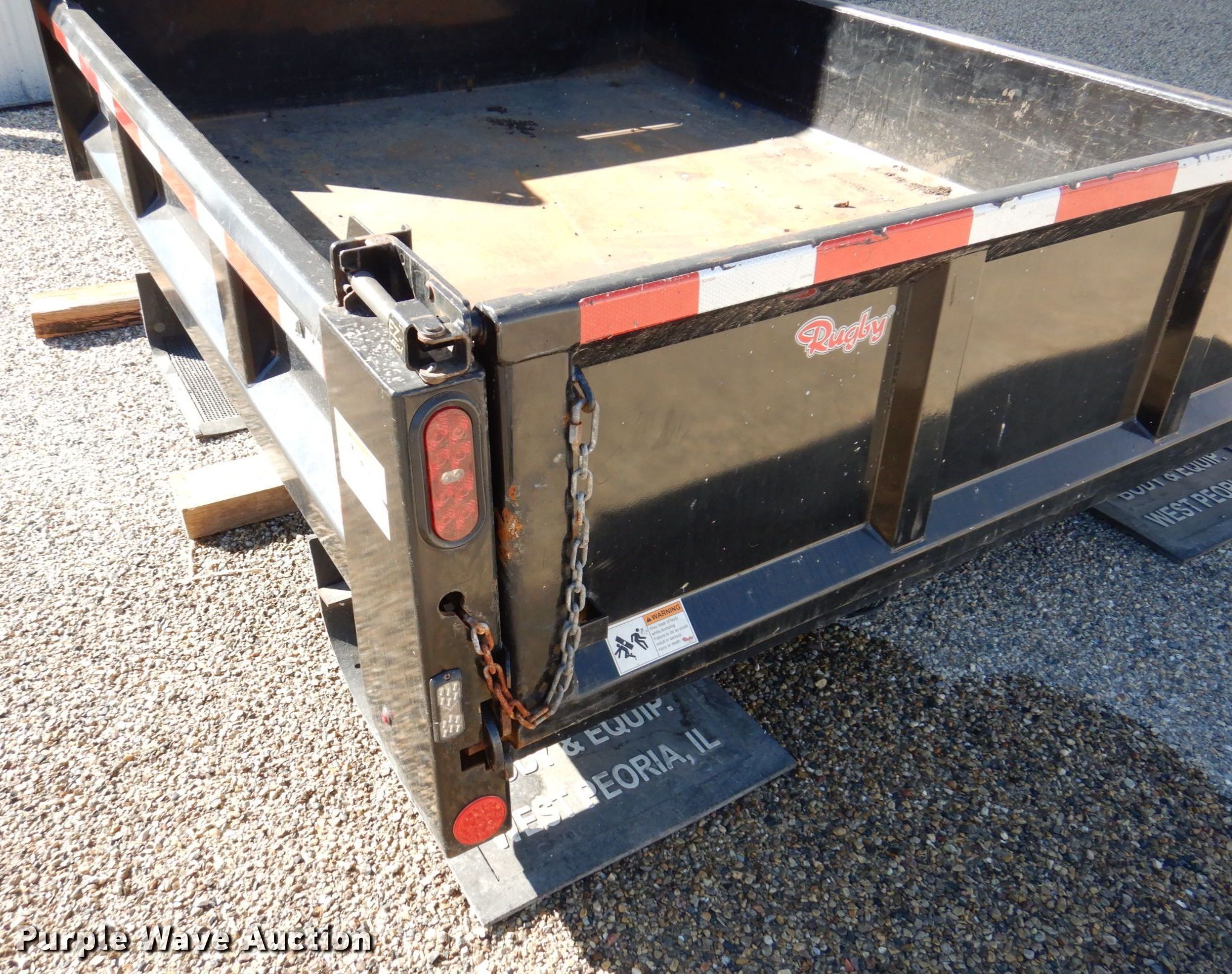 Rugby dump bed. Serial: 386923. Features 9' L x 96" W, Side height: 20", Bed type: Steel, Ram: Single, End gate: Manual. Notes Removed from 2016 F550. Limestone Township Road Dist.. 1501 W. Garfield. Bartonville, IL 61607
