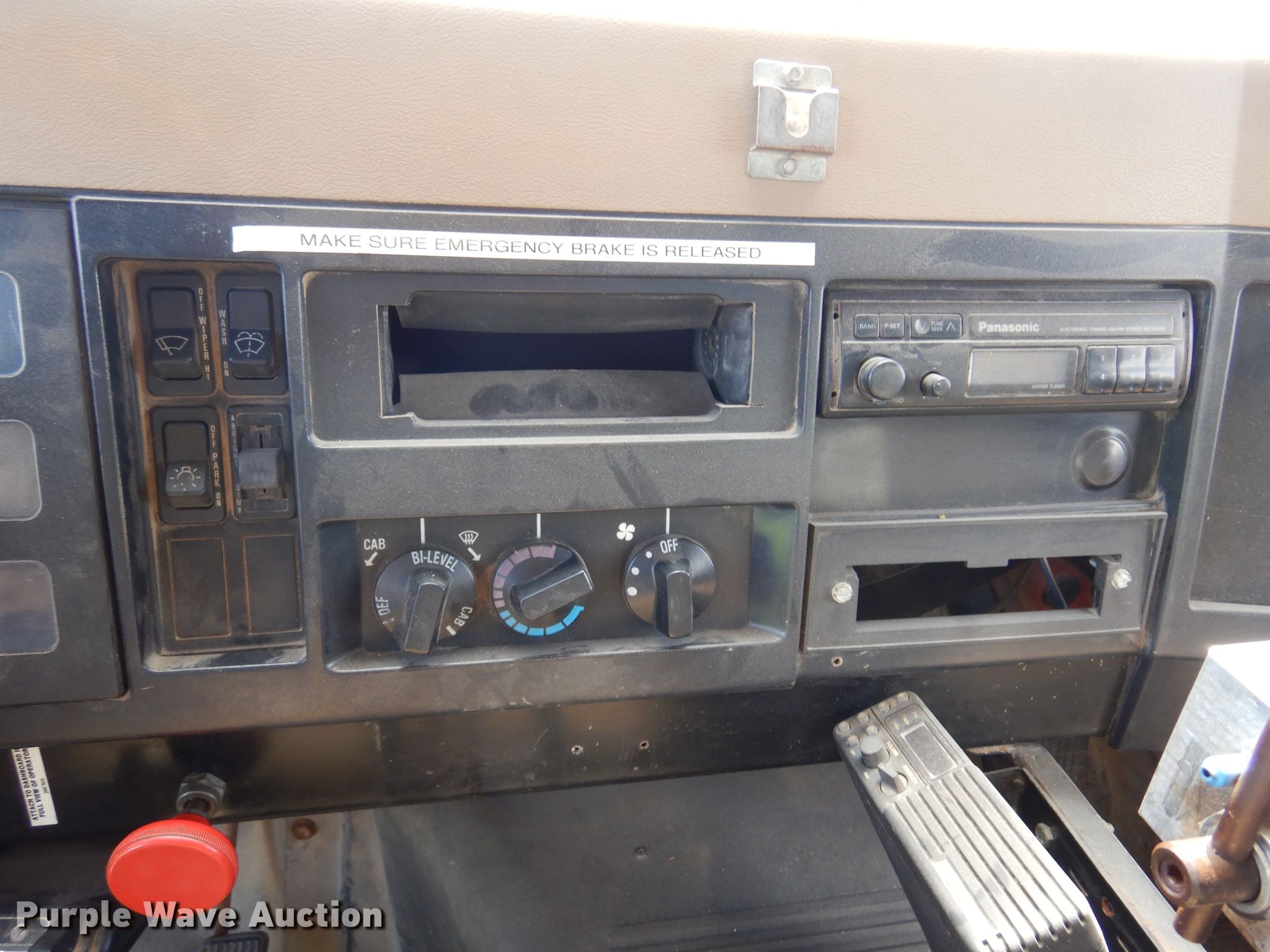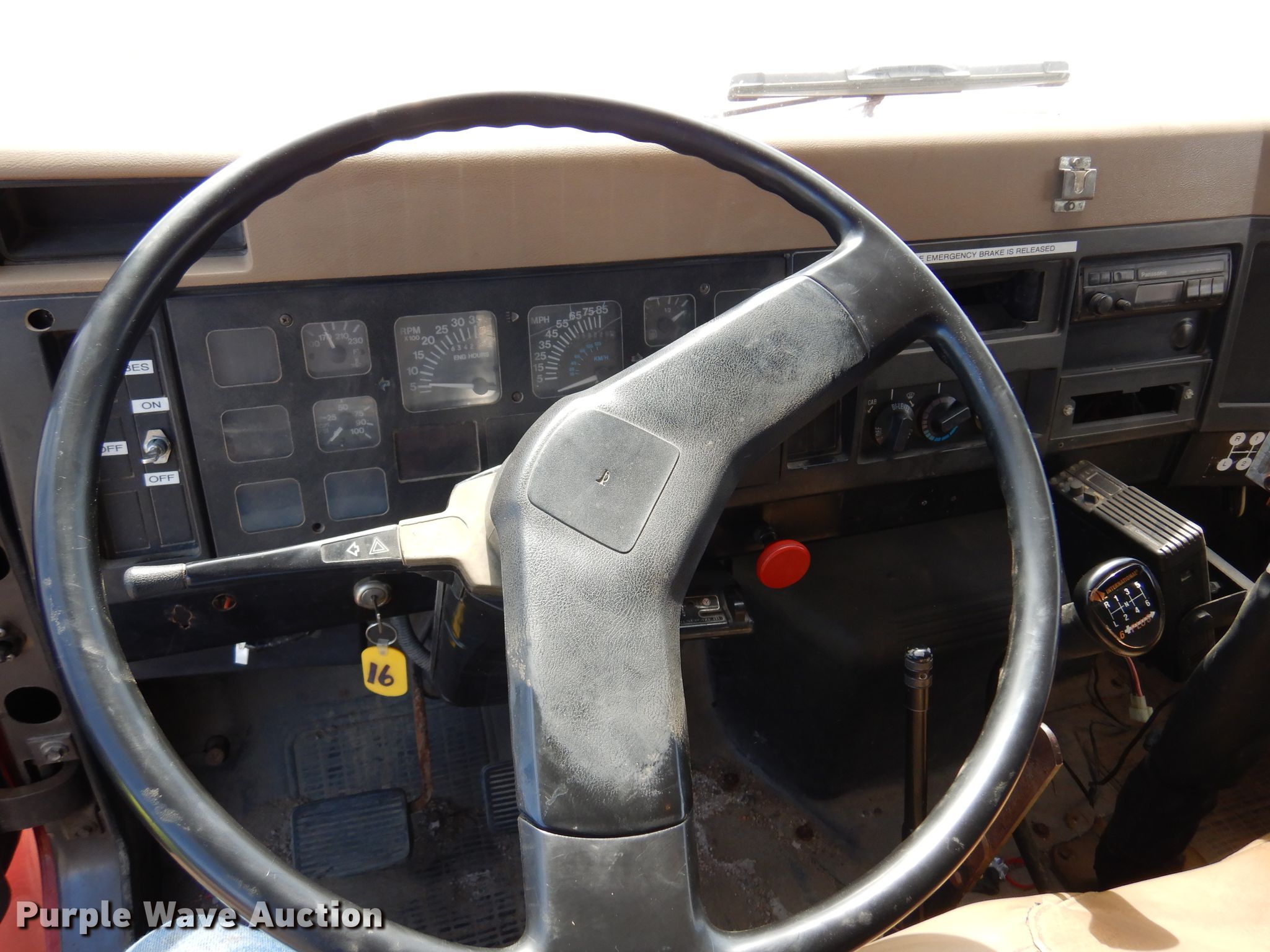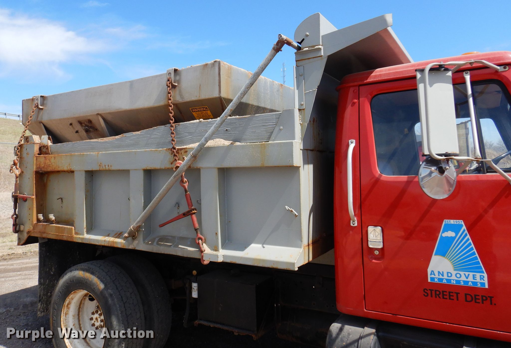 1991 International 4700 dump truck. Miles: 58,228 on odometer, Hours: 6,342 on meter, VIN: 1HTSCNKP2MH392481. Engine Displacement: 5.9L, Cylinders: 6, Fuel type: Diesel. Transmission Manual, Speed: 7. Chassis Axles: Single, Suspension: Spring, Brakes: Hydraulic, PTO. Interior Heat. Features Dump bed 10' L x 94" W, Side height: 30", Bed type: Steel, Roll tarp, Ram: Single , End gate: Manual, Spreader Henderson. Tires Front: 295/75R22.5, Rear: 275/80R22.5. Kansas title. 1606 N Andover Rd. Andover, KS 67002