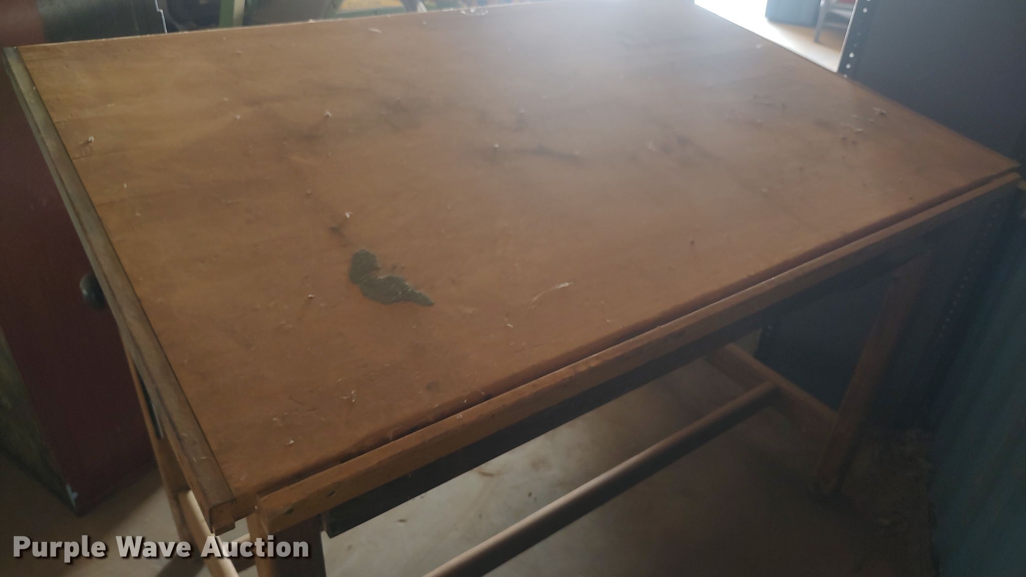 Purple Wave is selling a used Furniture in Oklahoma. This item is a Drafting table with the following: Drafting table. Lomega Public Schools. 18319 N 2700 Rd. Omega, OK 73764