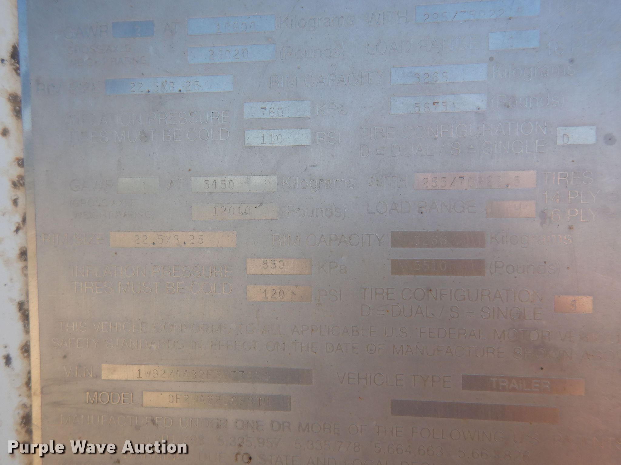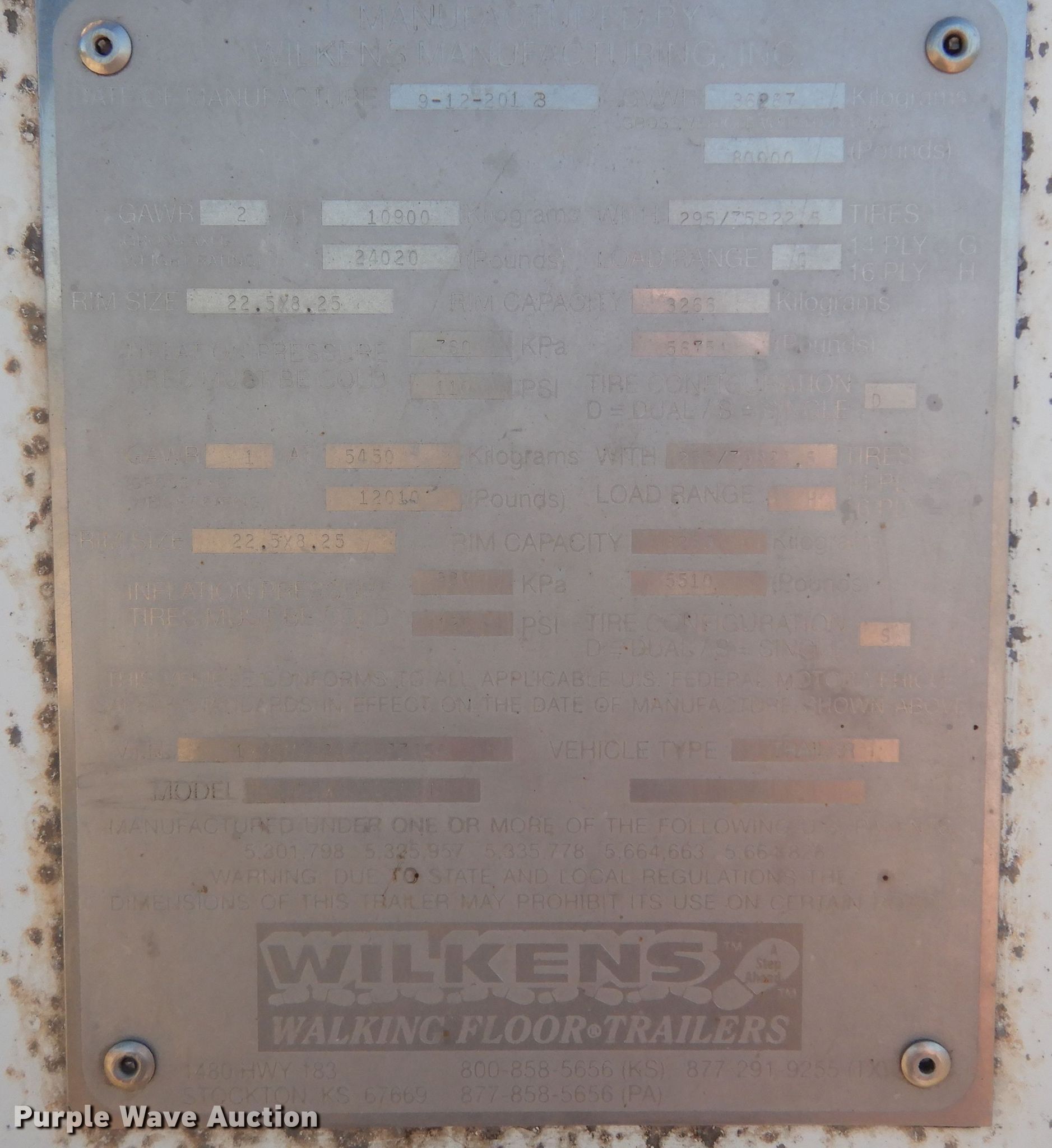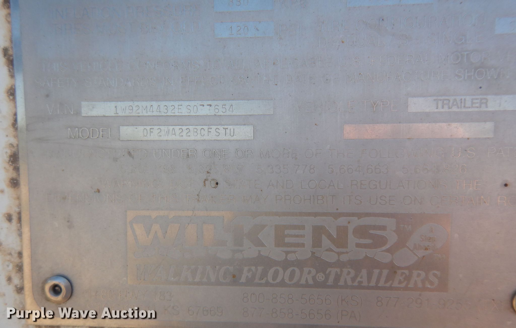Purple Wave is selling a used Grain or Commodity Trailer in Kansas. This item is a 2014 Wilkens OF2WA22BCFSTU walking floor trailer with the following: VIN: 1W92M4432ES077654