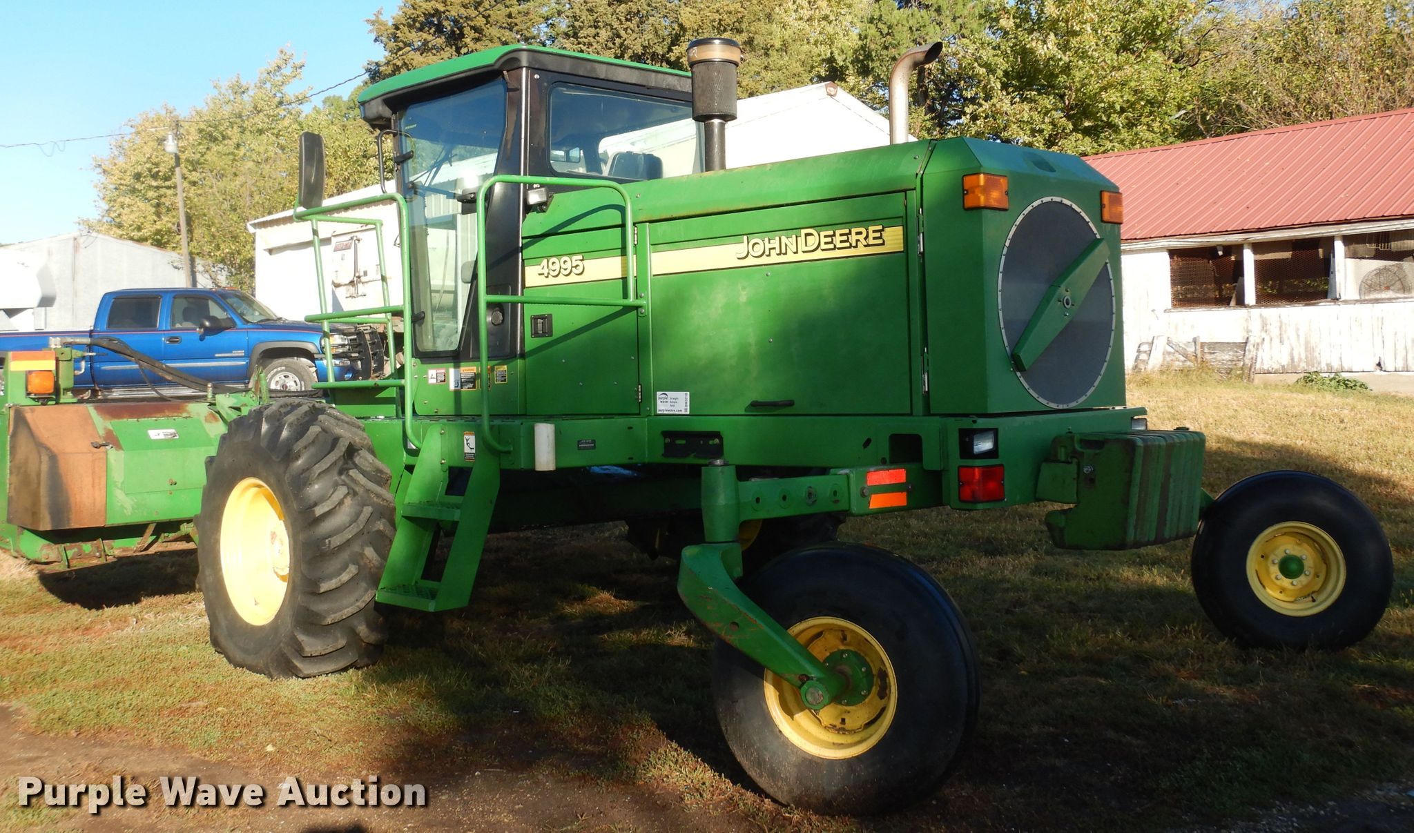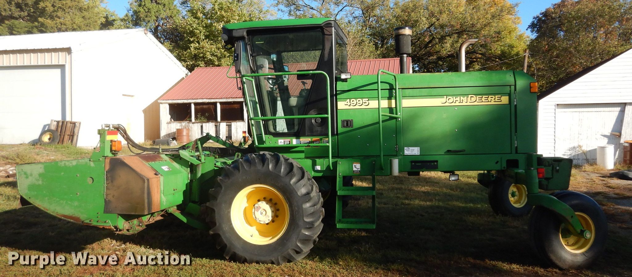 Purple Wave is selling a used Windrower Self Propelled in Kansas. This item is a 2007 John Deere 4995 windrower with the following: Engine hours: 2,689 on meter, Header hours: 1,988 on meter, Serial: E04995X330682