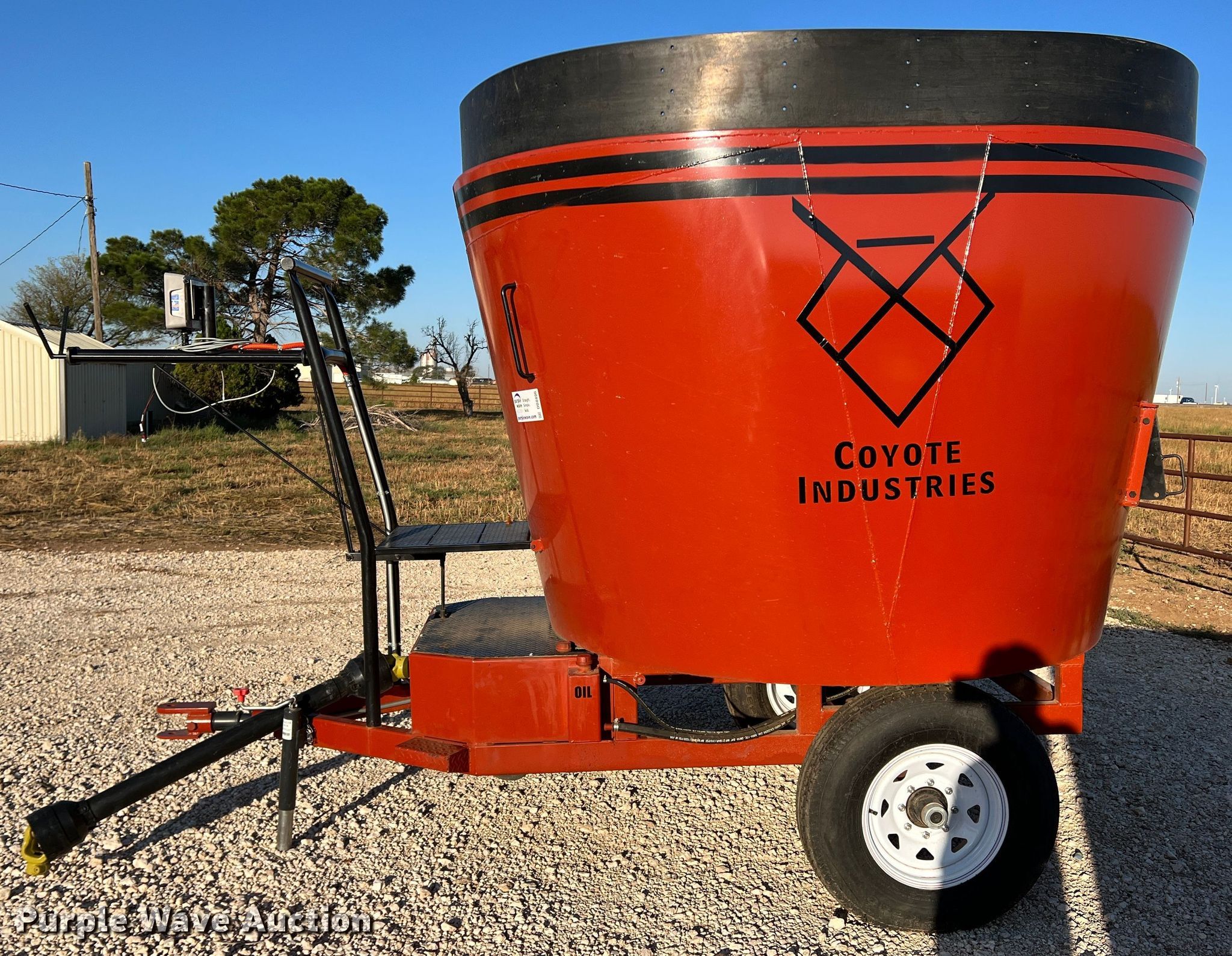 Coyote Industries feed mixer. Features. PTO: 540, Scales, Discharge: Side, Conveyor Width: 32", Door: Hydraulic. Tires Size: ST235/80R16. Notes Unused. 2525 county road E. Friona, TX 79035