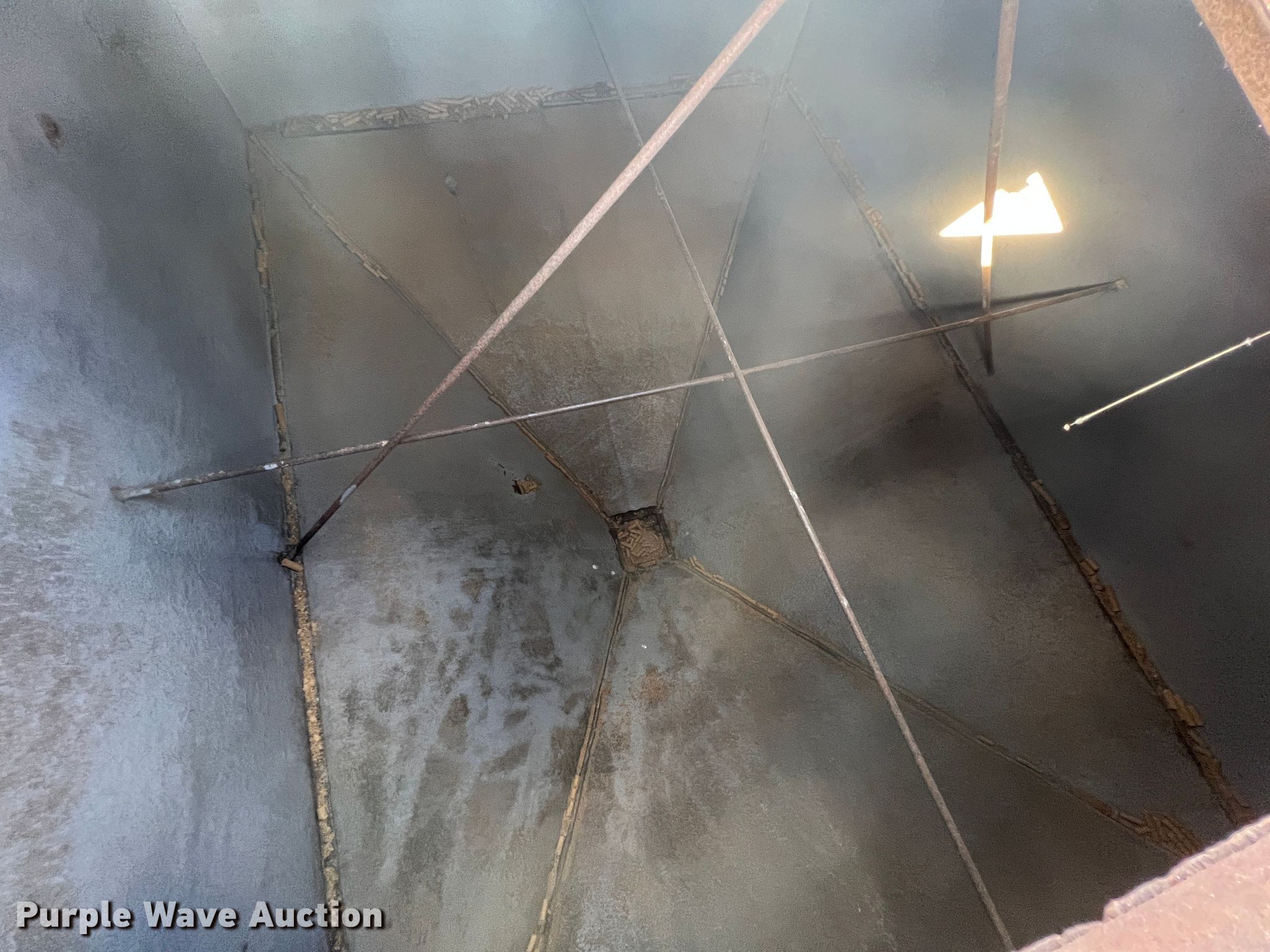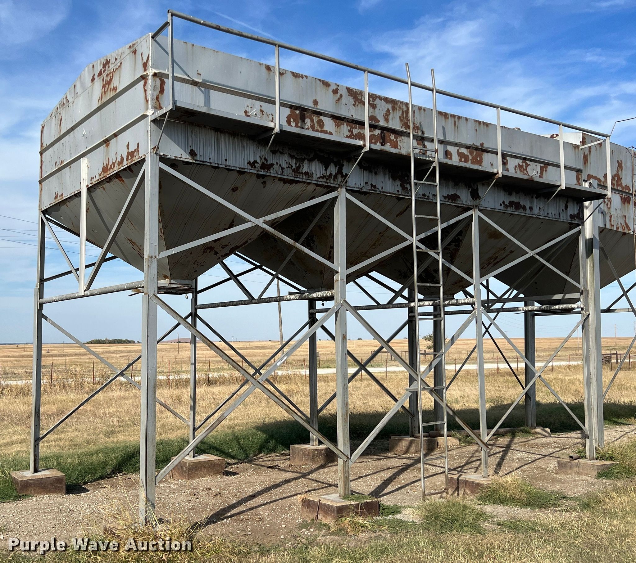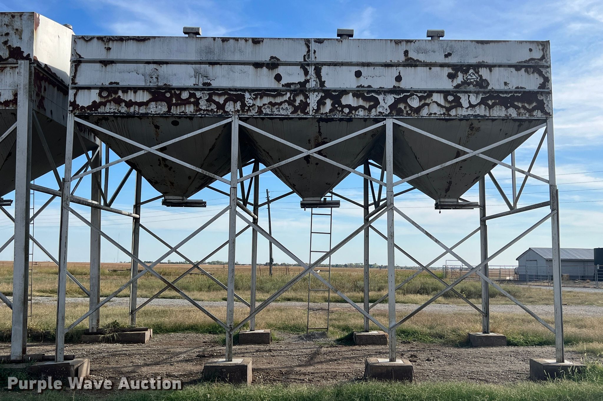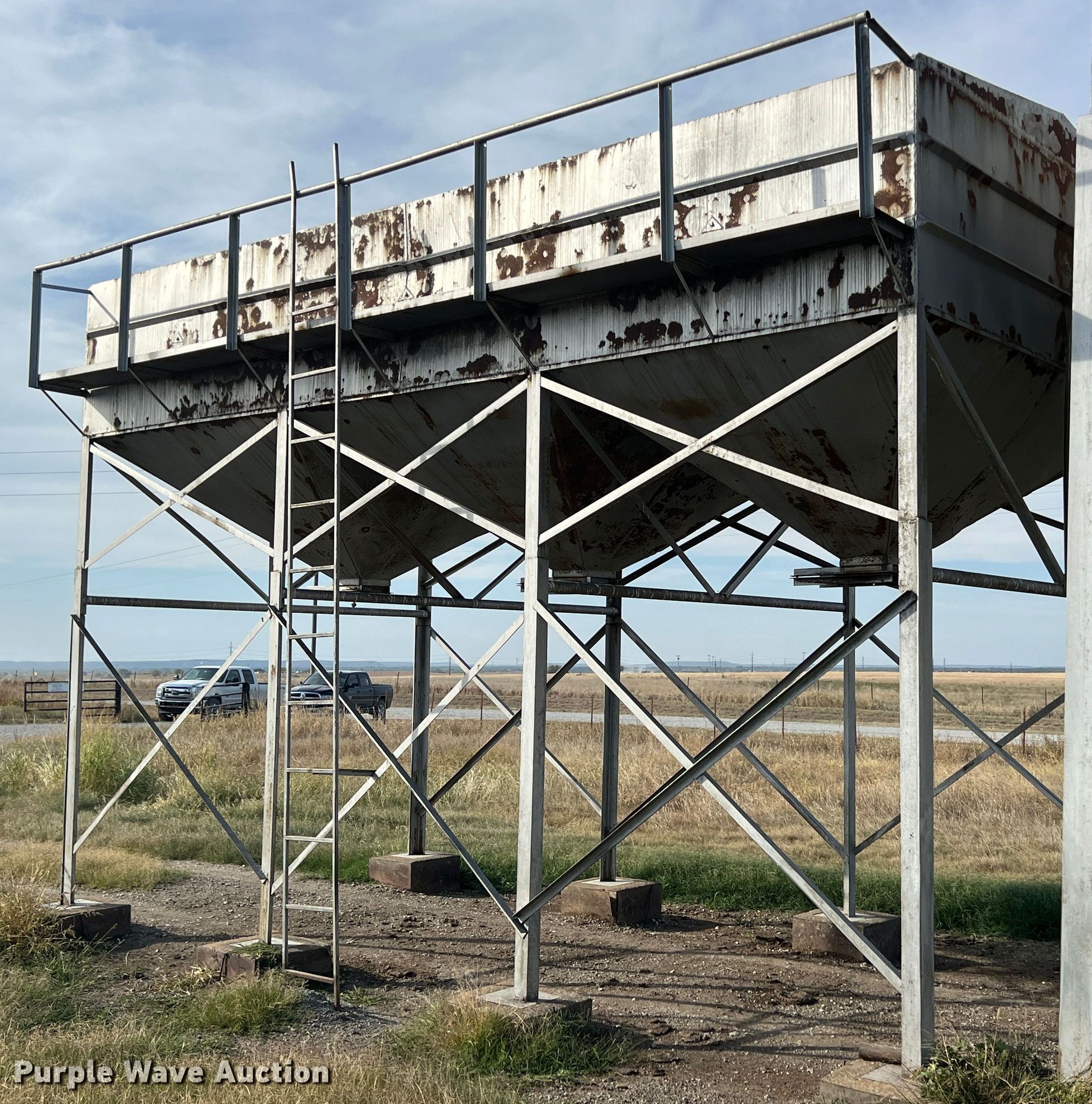 Purple Wave is selling a used Other Grain or Fertilizer Handling in Oklahoma. This item is a Feed bin with the following: 18'H, 25 ton capacity, 12' x 24' base, Bottom cracked, fiberglass lined