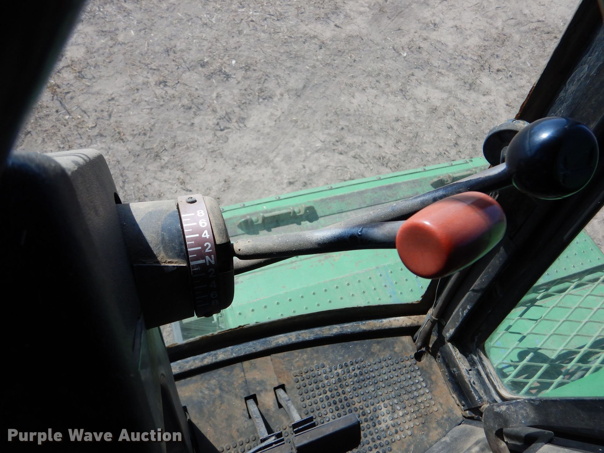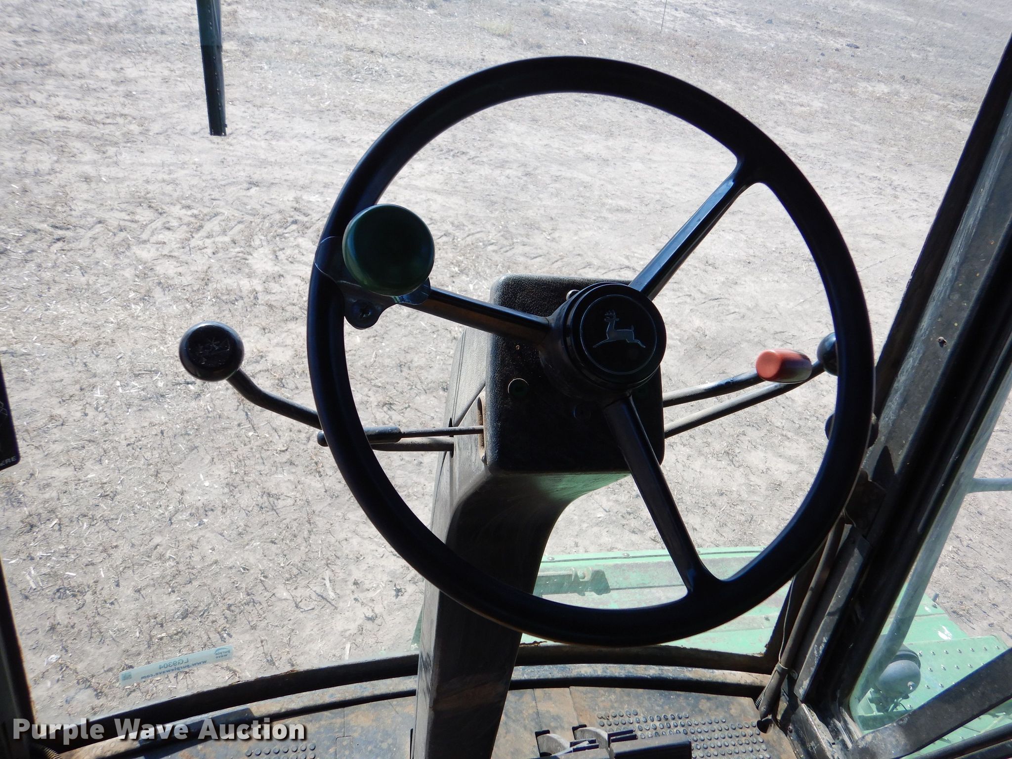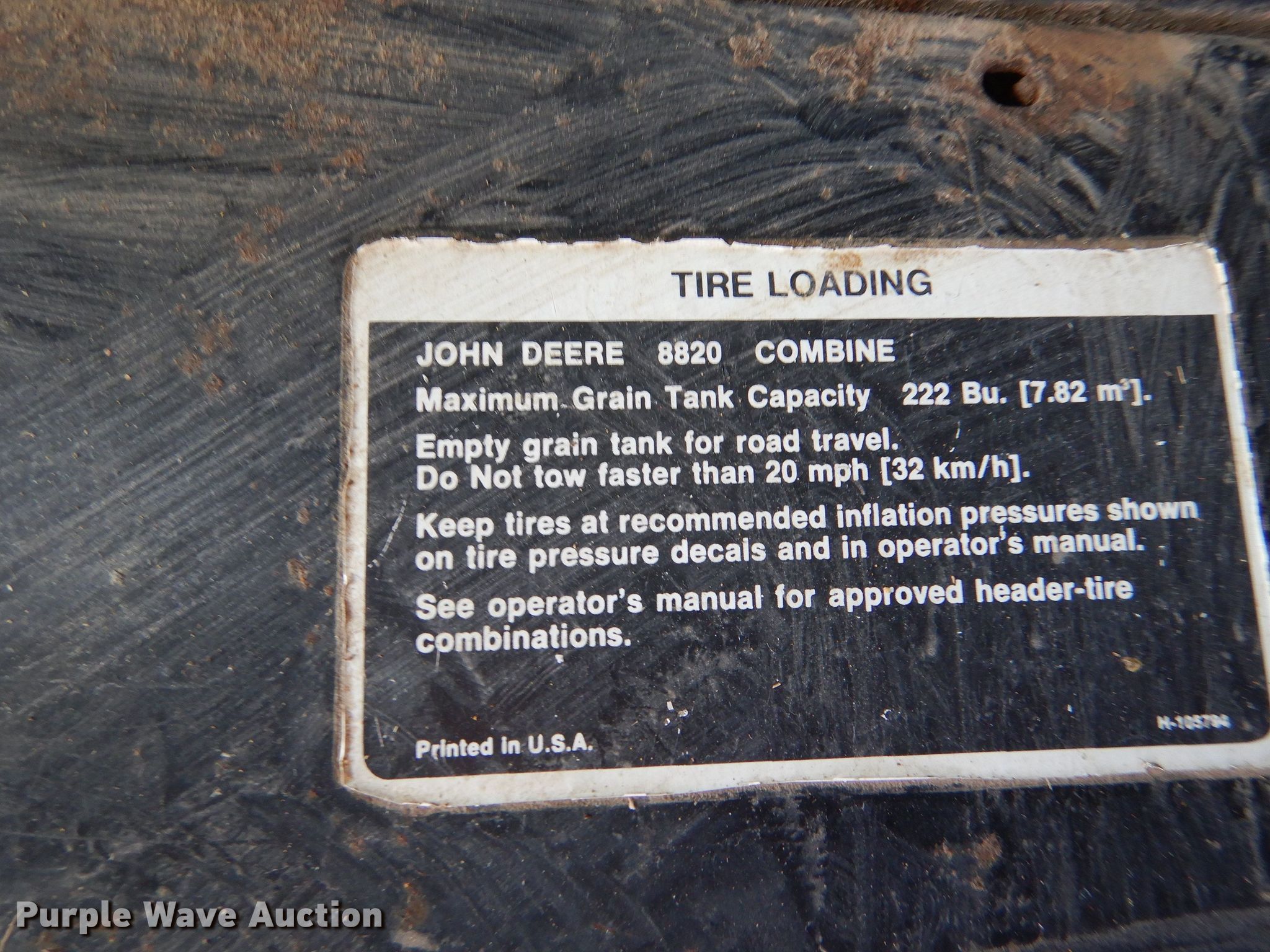 1982 John Deere 8820 combine. Hours: 1,404 on meter, Serial: 51534. Engine John Deere, Cylinders: 6, Fuel type: Diesel. Transmission Hydrostatic, 4F - 4R. Interior AC, Heat. Features Chaff spreader, Straw chopper, Unloading auger length: 20'. Tires Front: 30.5L-32, Rear: 14.9-24. Notes Non-operational hour meter, Front left lift cylinder leak, AC issues, belt missing. Plains, KS 67869