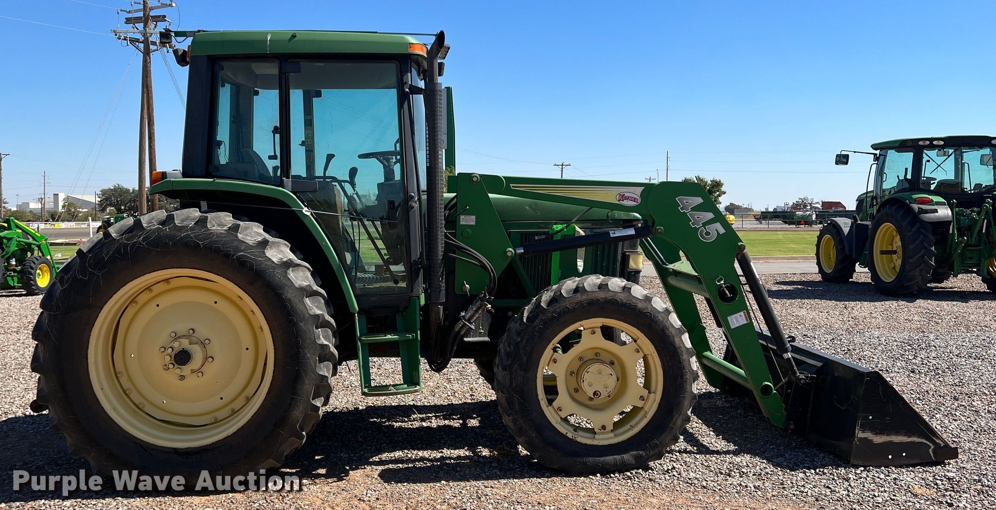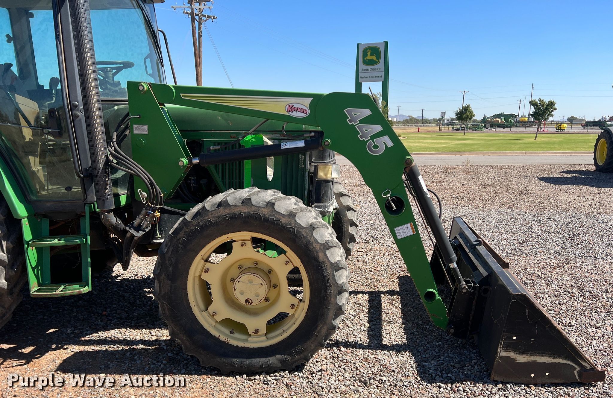 1995 John Deere 6400 MFWD tractor. Hours: 7,561 on meter, Serial: L06400X139703. Engine John Deere, Displacement: 4.5L, Cylinders: 4, Fuel type: Diesel, HP: 85. Transmission Powershift, 16F - 16R, Differential lock. Operators station AC, Heat. Features PTO: 1000, Three point Top link, Seven pin outlet, Hydraulic remote sets Rear: 2, Loader Koyker 445, Controls: Joystick, Bucket Width: 85".. Tires Front: 13.6-28, Rear: 18.4-38. Western Equipment. 3008 E Broadway St. Altus, OK 73521