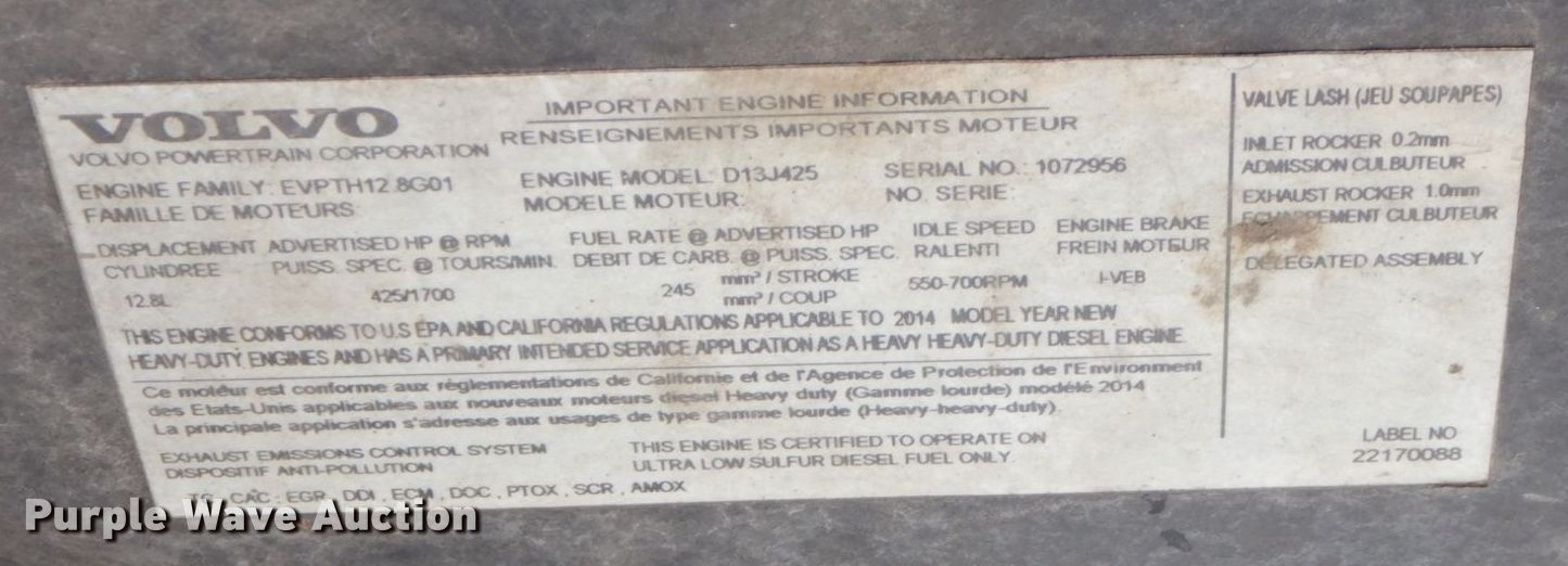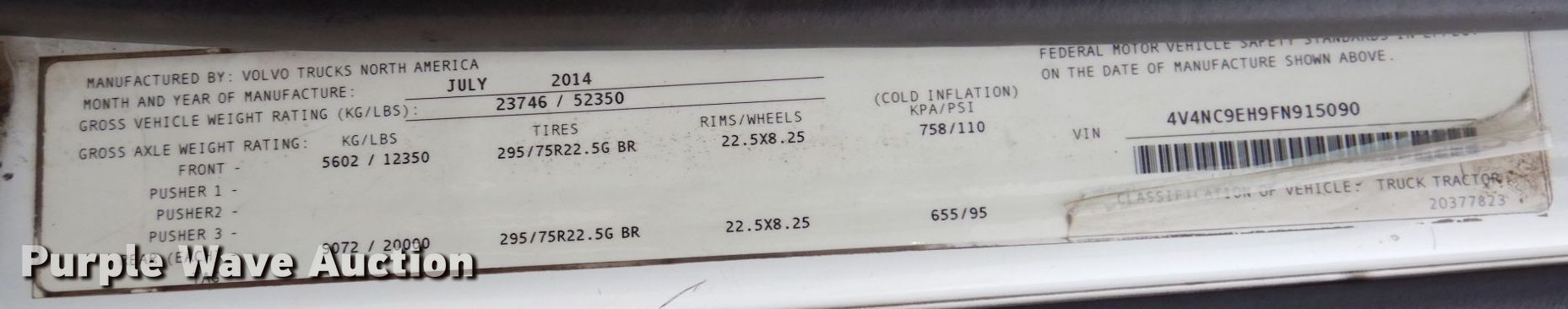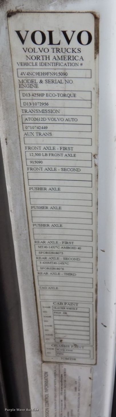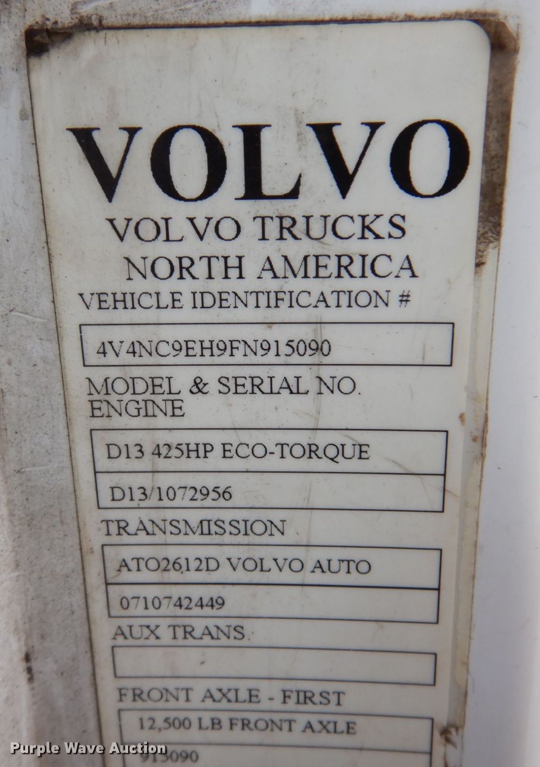 2015 Volvo VN semi truck. Miles: 469,591 on odometer, VIN: 4V4NC9EH9FN915090, Unit #: 164. Engine Volvo D13, Displacement: 12.8L, Cylinders: 6, Fuel type: Diesel. Transmission Automatic. Chassis Axles: Tandem, Differential lock: Inter-axle, Suspension: Air Dump valves, Brakes: Air, GVWR: 52,350 lbs FAWR: 12,350 lbs, IAWR: 20,000 lbs, RAWR: 20,000 lbs. Interior AC, Heat, Heated mirrors, Cruise control, Air ride cab. Features Deck plate: Aluminum, Fifth wheel type: Air operated, Sliding, Fuel tank: Dual. Tires Front: 11R22.5, Rear: 295/75R22.5. Notes Dash warning indicator: Check engine, Windshield chipped or cracked. Michigan title. Aim Transportation Solutions. 8383 Boyle Pkwy. Twinsburg, OH 44087