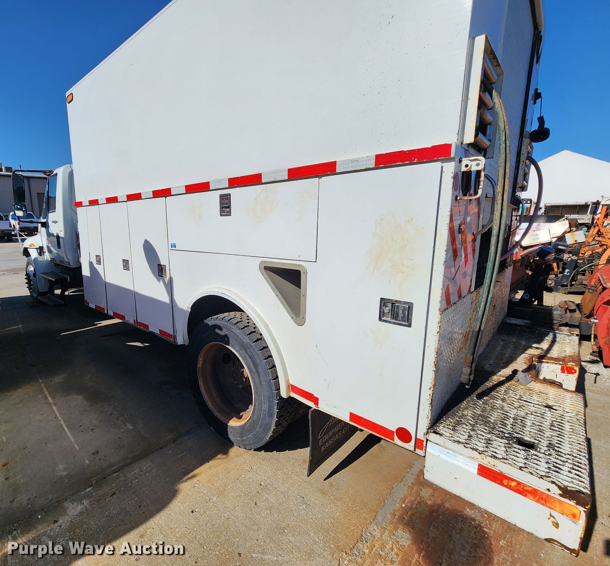 2013 International 4300 utility / service truck. Miles: Unknown, VIN: 1HTJTSKM1DH353929, Unit #: 8548. Engine Displacement: 6.4L, Cylinders: 6, Fuel type: Diesel. Transmission Automatic. Chassis Axles: Single, Suspension: Spring, Brakes: Air. Interior Heat. Features Bed 13' L x 96" W, Oil/lube system Hose reels, MHE 5043P hydraulic power unit Serial: 100650. Tires Size: 255/70R22.5. Notes Grill removed but included, Non-operational unit. Missouri title. Mileage has not been verified. Exempt will be written in the odometer disclosure on the title. City of Kansas City - Open inspection Nov. 14. 5304 Municipal Ave. Kansas City, MO 64120