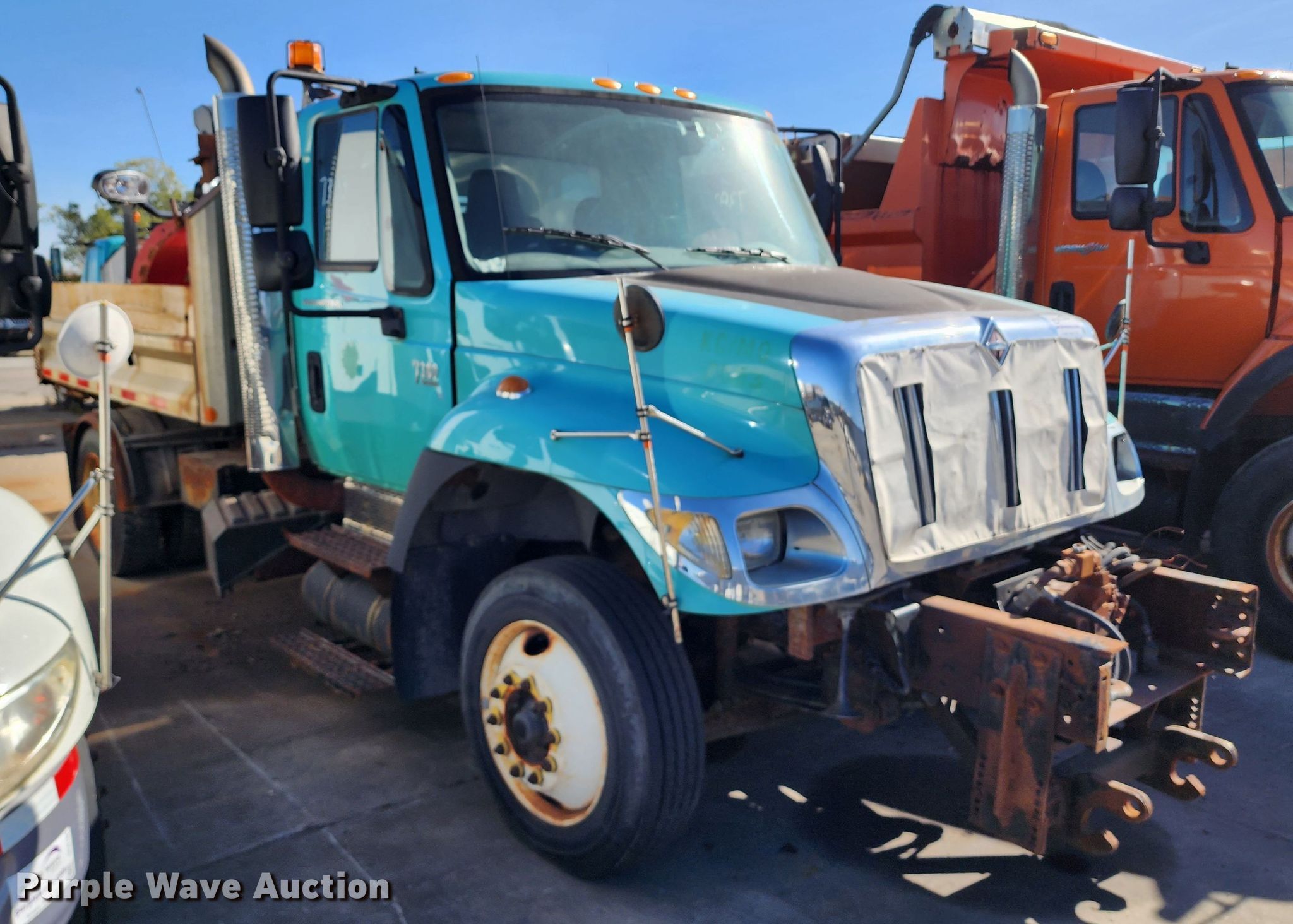 2007 International 7300 dump truck. VIN: 1HTWAAAL27J423241, Unit #: 7383. Engine Displacement: 7.6L, Cylinders: 6, Fuel type: Diesel. Transmission Automatic. Chassis Axles: Single, Suspension: Spring, Brakes: Air. Interior Heat. Features Dump bed 11' L x 96" W, Side height: 14", Bed type: Stainless steel, Roll tarp, Ram: Single, Snow plow Width: 120". Tires Size: 255/70R22.5. Notes End gate may be missing, Non-operational unit. Missouri title. Mileage has not been verified. Exempt will be written in the odometer disclosure on the title. City of Kansas City - Open inspection Nov. 14. 5304 Municipal Ave. Kansas City, MO 64120