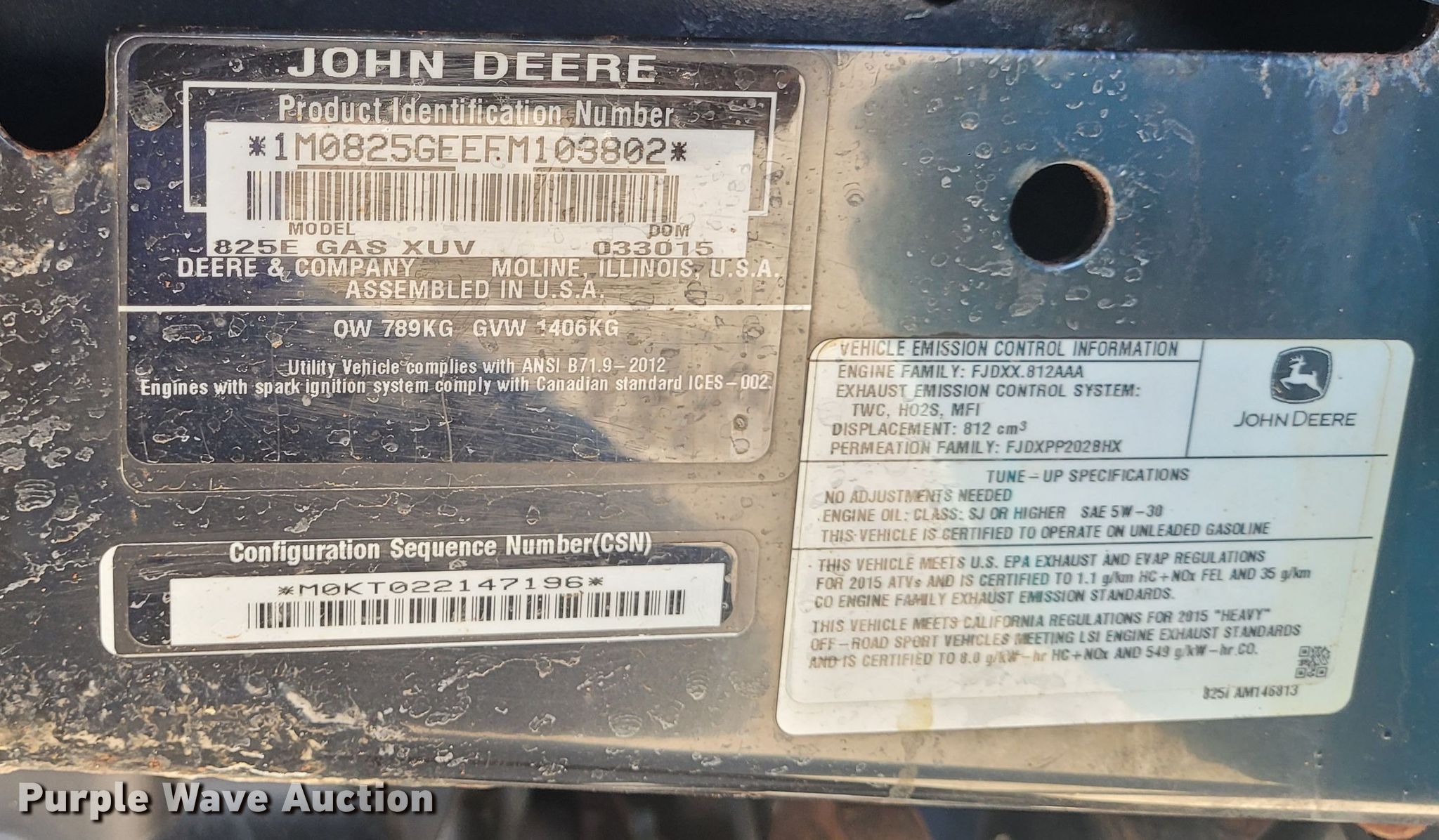 Purple Wave is selling a used Utility Vehicle in Kansas. This item is a 2015 John Deere 825i Gator utility vehicle with the following: Miles: 1,697 on odometer, Hours: 516 on meter, VIN: 1M0825GEEFM103802