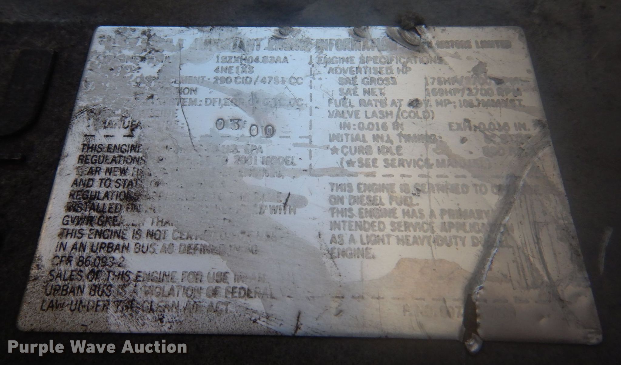 2001 GMC W4500 box truck. Miles: 170,531 on odometer, Miles or hours may vary, unit still in use, VIN: J8DC4B14017006189. Engine Isuzu, Displacement: 290 C.I.D., Cylinders: 4, Fuel type: Diesel. Transmission Automatic. Chassis Axles: Single, Suspension: Spring, Brakes: Hydraulic. Interior AC, Heat. Features Box bed US Truck Body, Serial: 304-0854, 16' 7" L x 8" W x 93" H, Floor: Wood, End gate lift. Tires Size: 215/85R16. Notes Ladder rack/brackets and contents not included., Windshield chipped or cracked, Non-operational AC. Missouri title. Title distribution may be delayed up to 14 days from verification of funds. Innovative Insulation. 203 North Elm Street. Stanberry, MO 64489