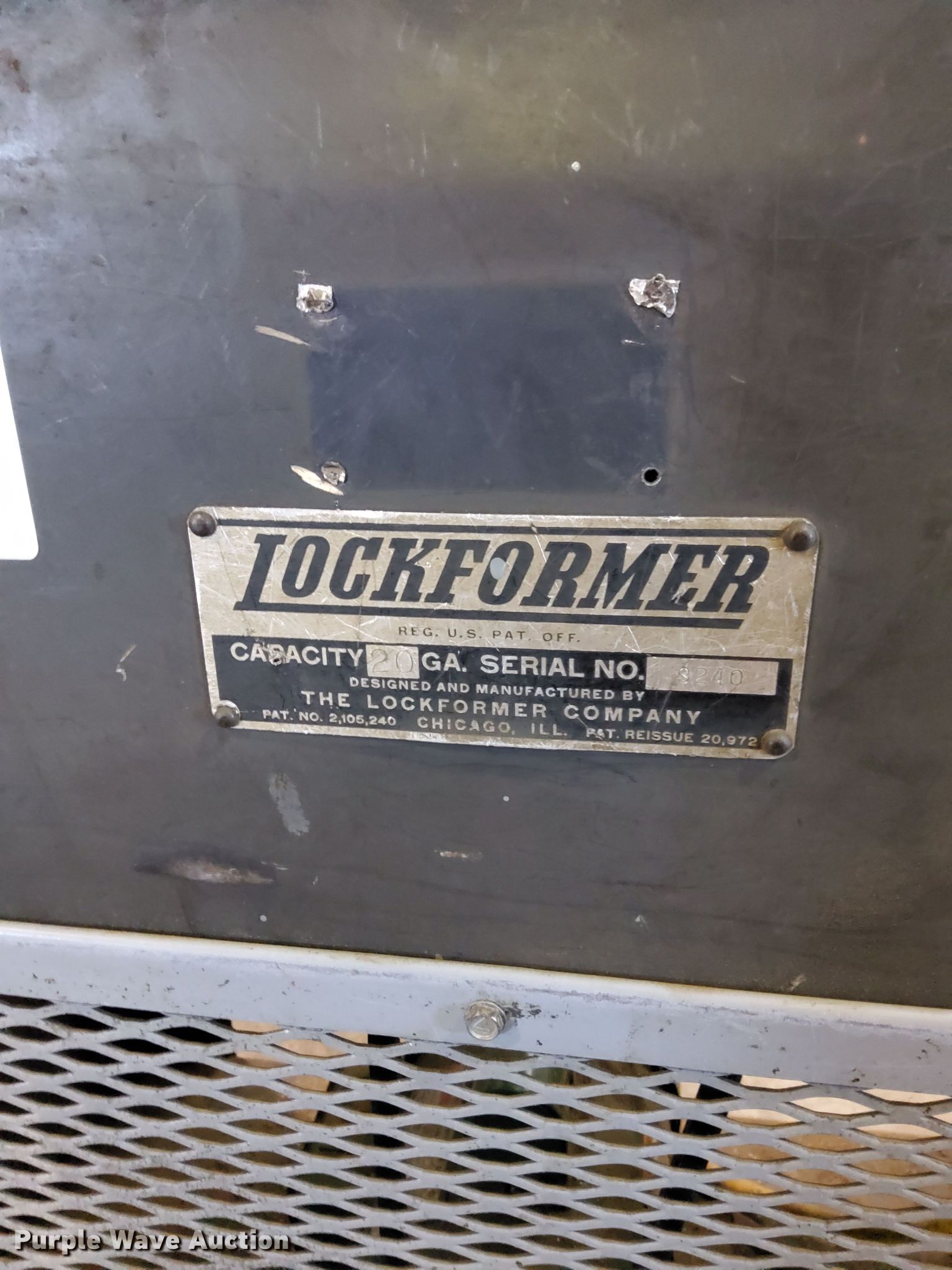 Purple Wave is selling a used Forming Equip. in Wisconsin. This item is a Lockformer Pittsburgh with the following: Capacity: 20 gauge, 36" x 17.5" x 43" tall, Dayton electric motor, Model: 6K622Q, HP: 1, Volts: 115