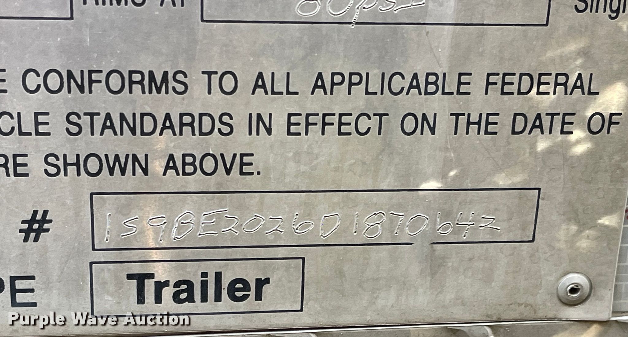 2013 Sharp spray foam trailer. VIN: 1S9BE2026D1870642. Dimensions Overall: 25' L x 100" W, Body: 22' 6" L x 100" W. Features Deck type: Wood, Gusmer H-20/35 foam machine, MagnaPlus generator 40 kW, Single phase, 120/240 volts , 120 amps, Deutz three cylinder diesel engine. Chassis Ball hitch: 2 5/16", Landing gear: Single, Suspension: Spring, Brakes: Electric, Axles: Tandem. Tires Size: 235/80R16. Kansas title. Scandia, KS 66966