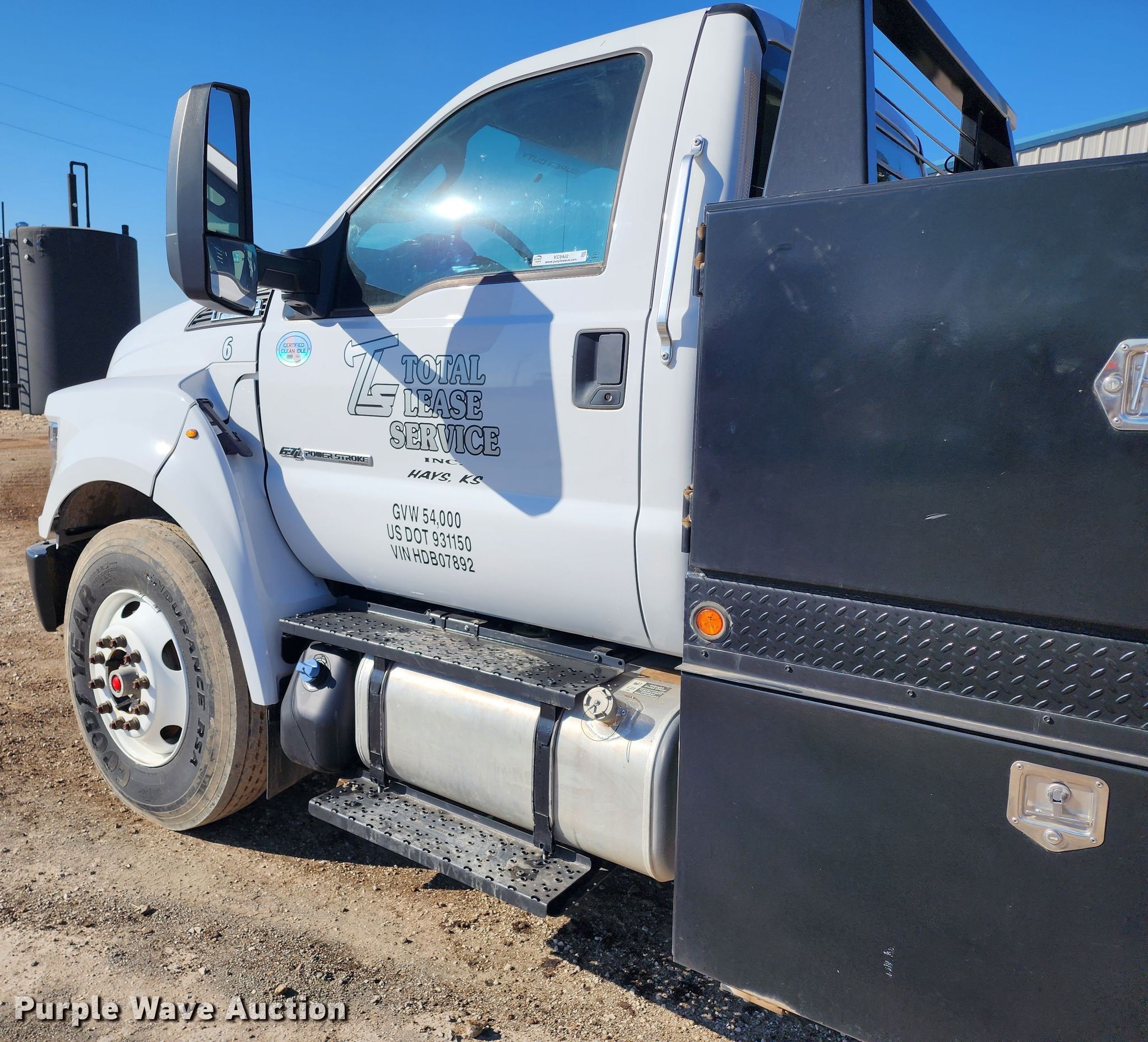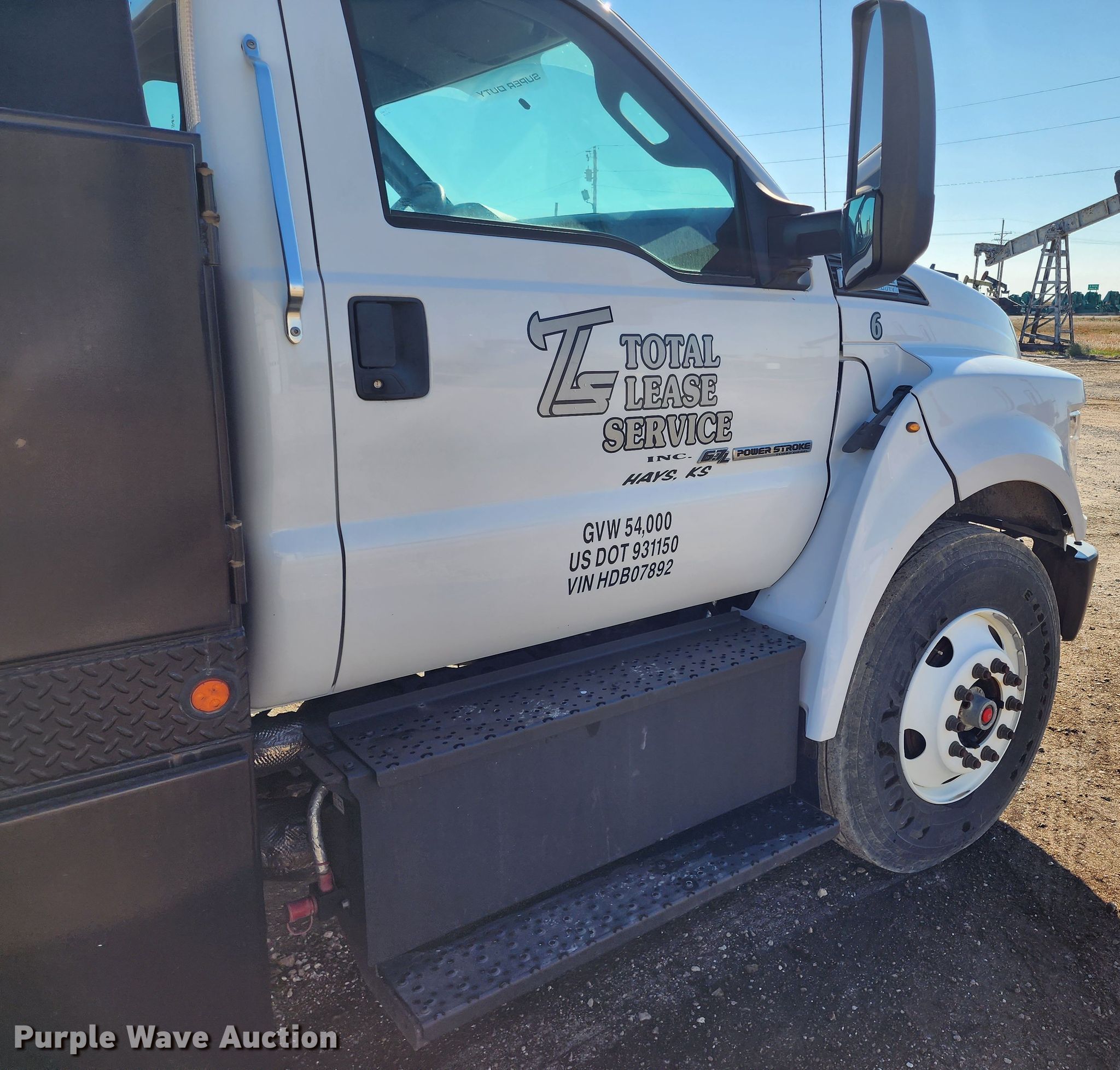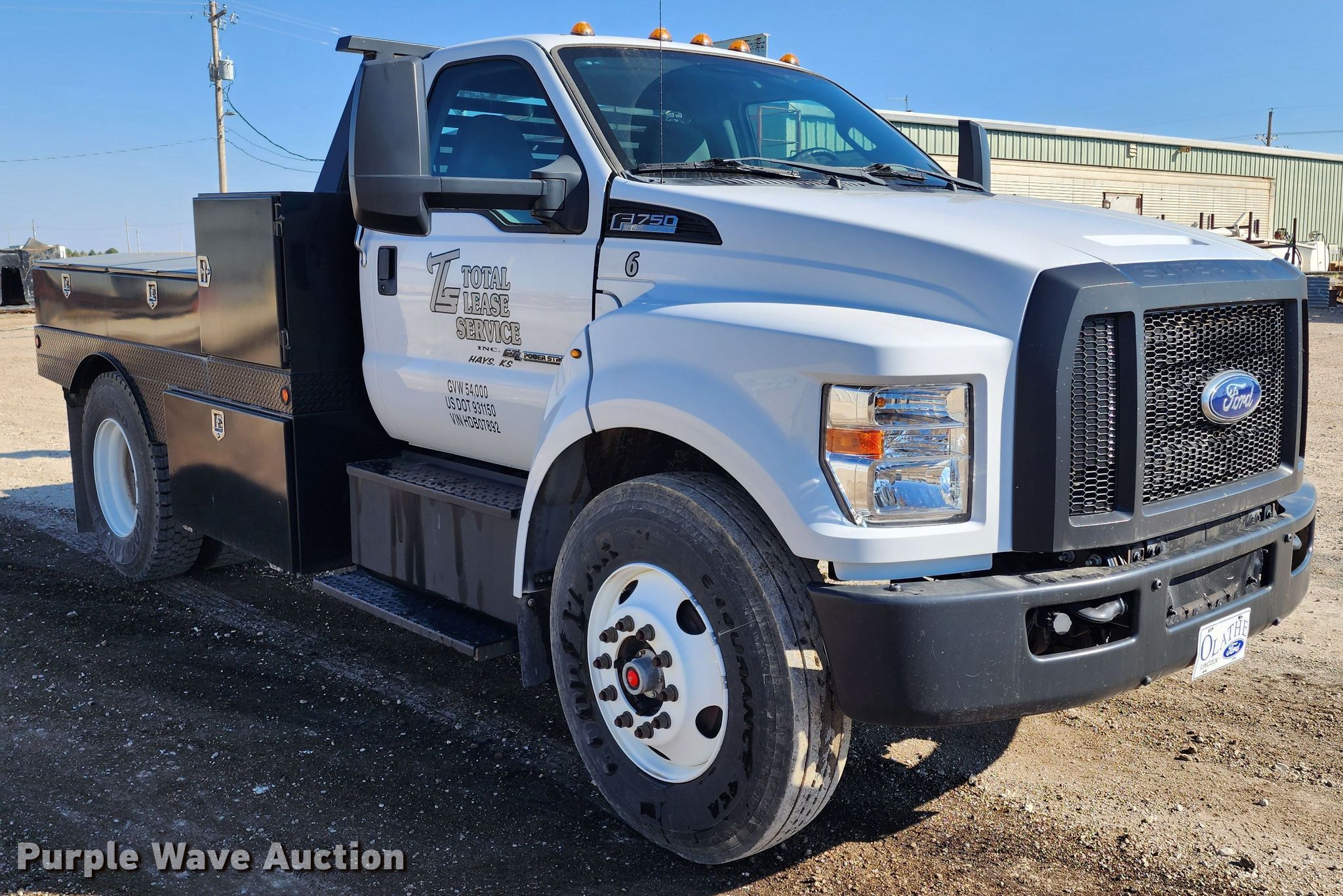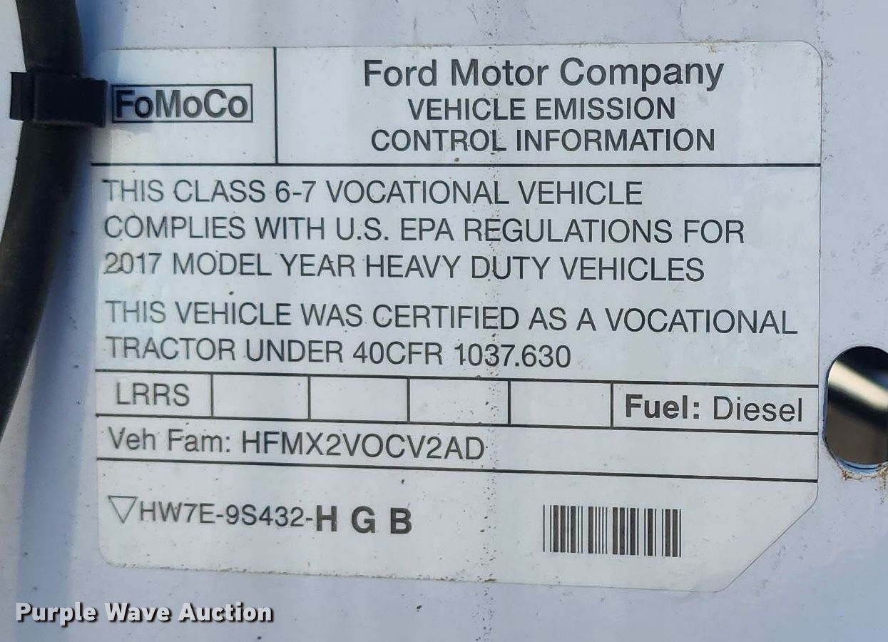 2017 Ford F750 Super Duty flatbed truck. Miles: 4,613 on odometer, VIN: 1FDXF7TE8HDB07892. Engine Displacement: 6.7L, Cylinders: 8, Fuel type: Diesel. Transmission Automatic. Chassis Axles: Single, Suspension: Air, Brakes: Air, GVWR: 33,000 lbs, Differential lock. Interior AC, Heat, Cruise control, Auxiliary controls. Features Flatbed 10' 2" L x 8' W, Hitch: Gooseneck. Tires Size: 11R22.5. Notes Contents not included. Kansas title. Title distribution may be delayed up to 14 days from verification of funds. Total Lease Service, Inc.. 1309 Toulon Ave. Hays, KS 67601