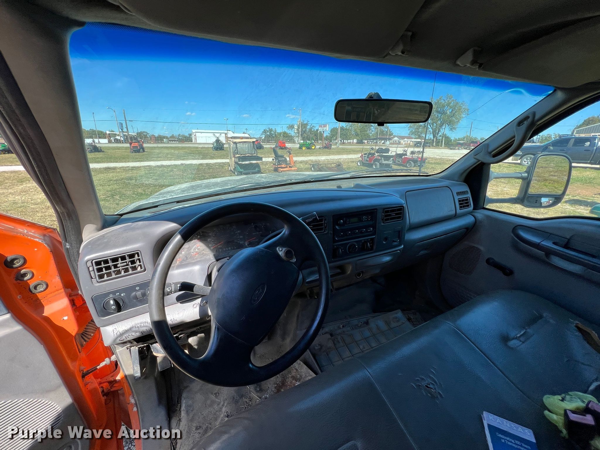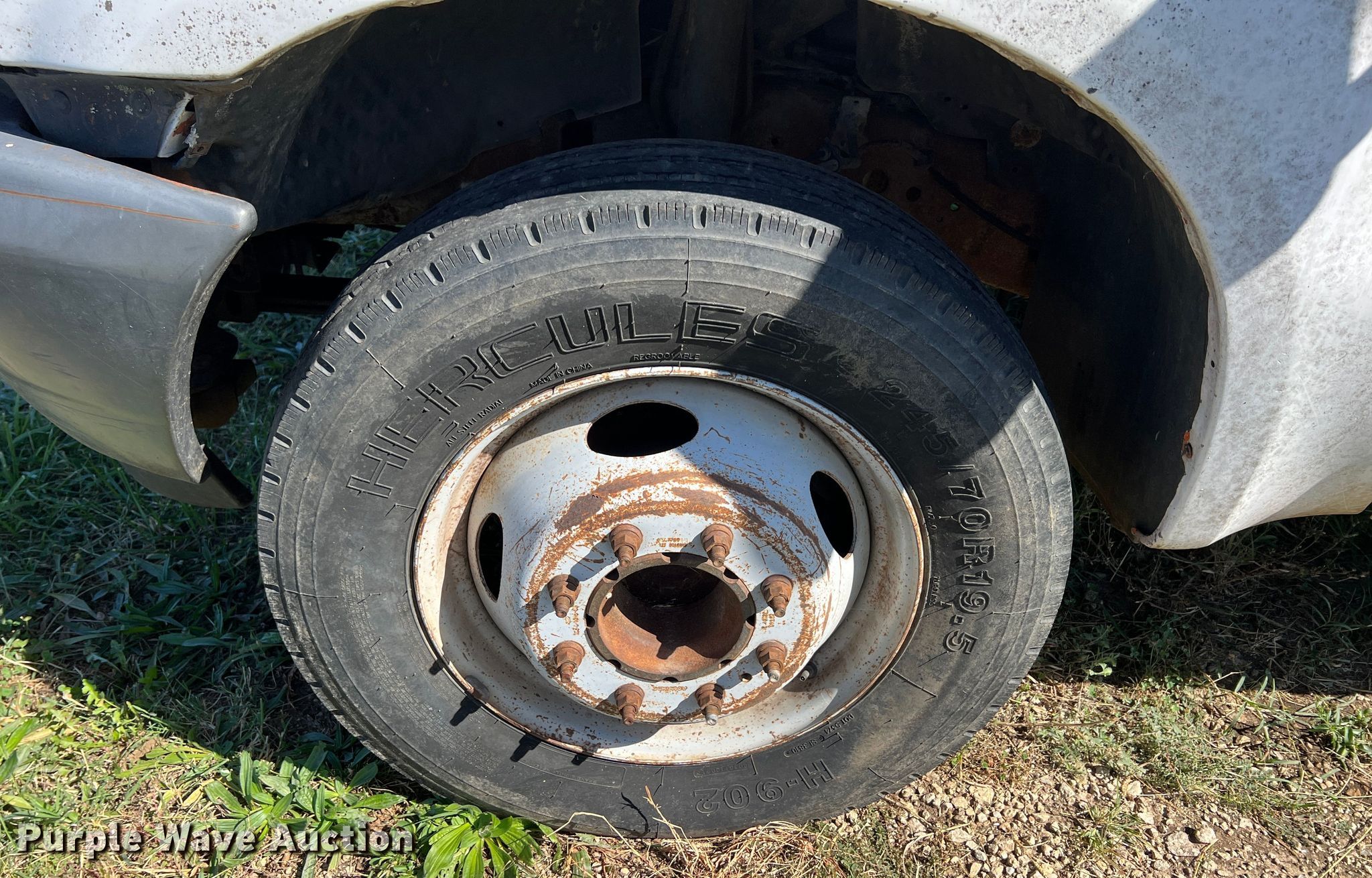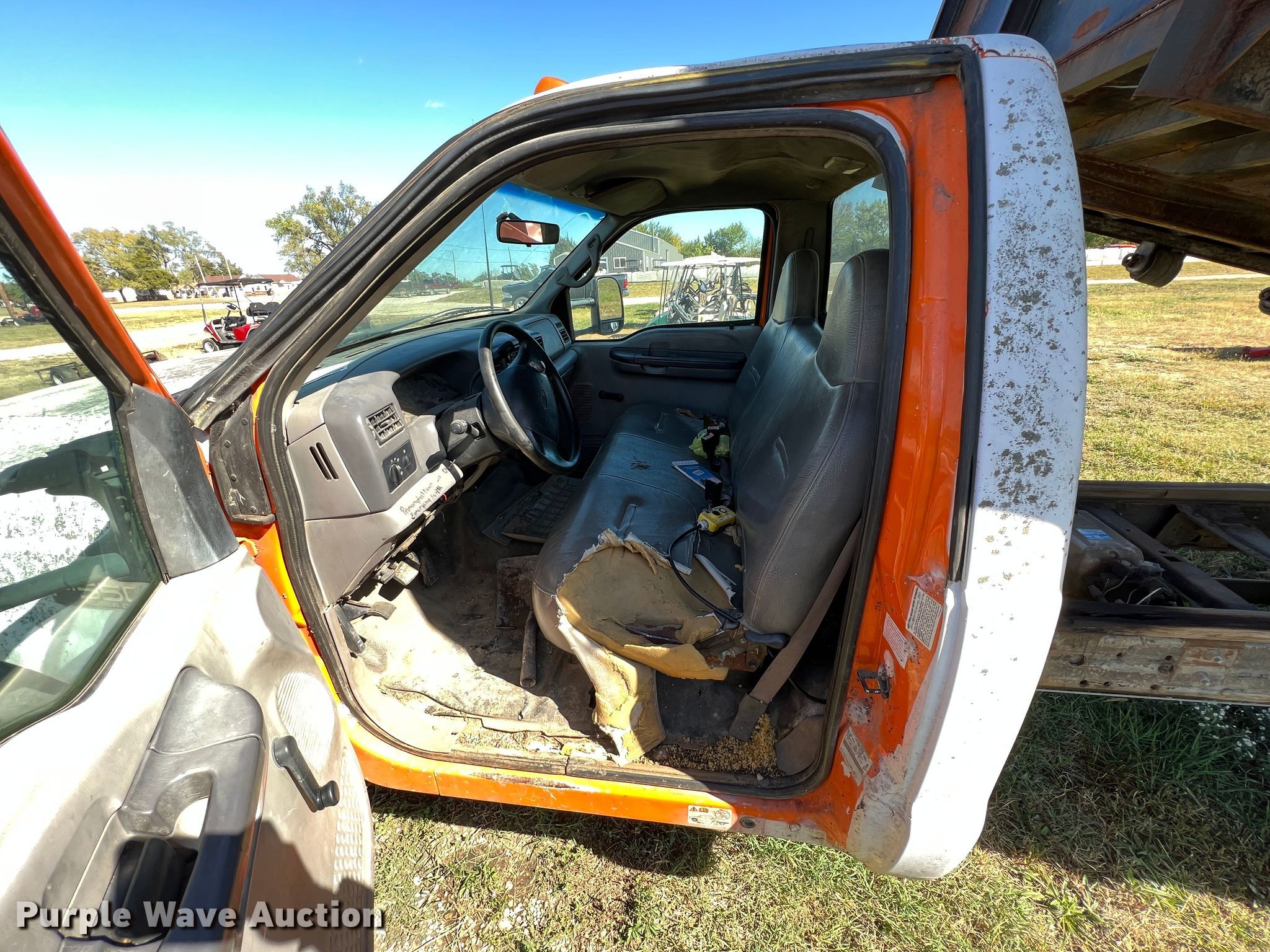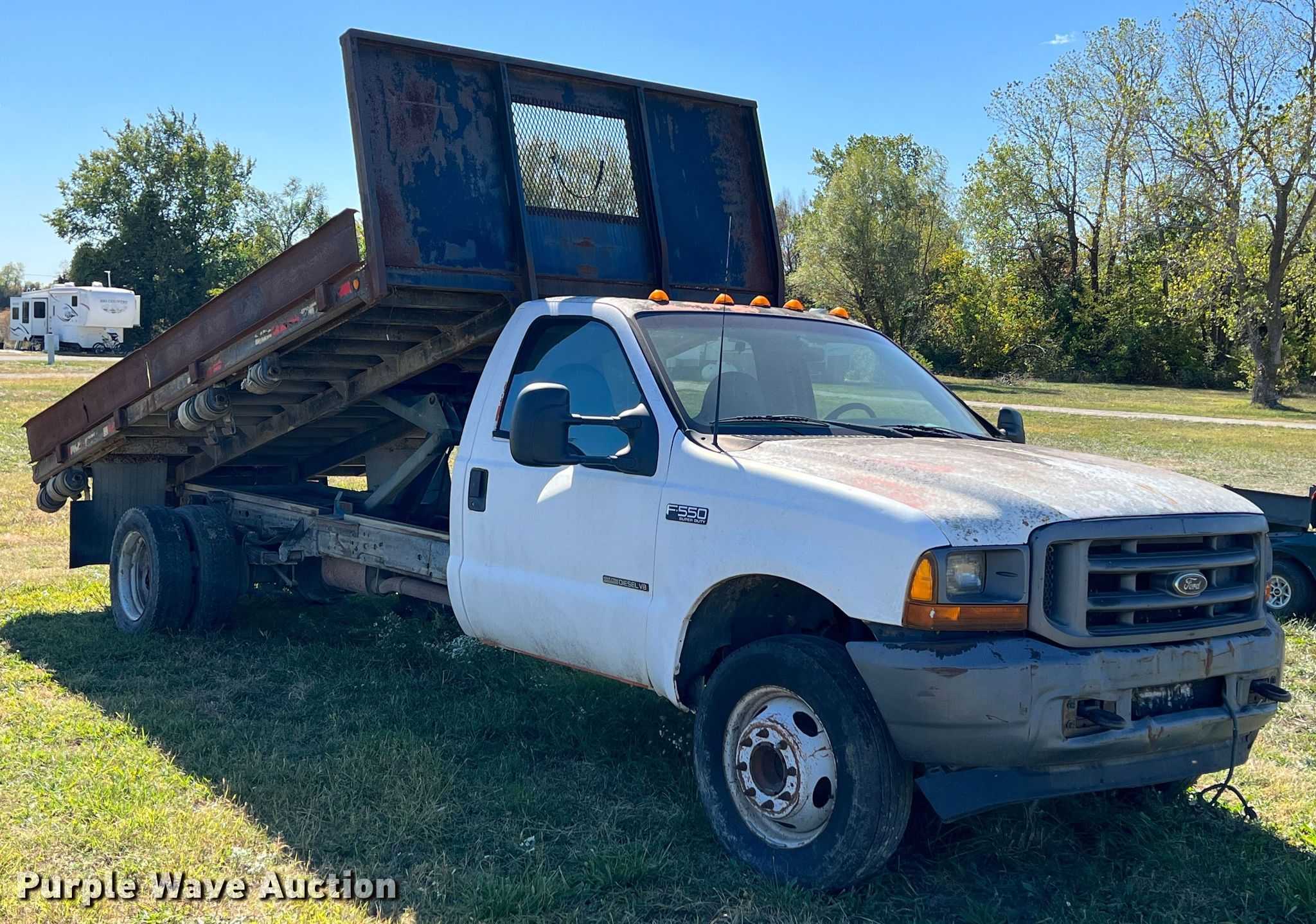 2001 Ford F550 Super Duty dump flatbed truck. Miles: 213,703 on odometer, VIN: 1FDAF56F41ED14956. Engine Displacement: 7.3L, Cylinders: 8, Fuel type: Diesel. Transmission Automatic. Chassis Axles: Single, Suspension: Spring, Brakes: Hydraulic. Interior AC, Heat. Features Dump flatbed 15' L x 8' W, Ram: Single. Tires Size: 245/70R19.5. Notes Tire damaged, Non-operational unit. Kansas title. Title distribution may be delayed up to 14 days from verification of funds. Irrigation & Turf. Gas, KS 66749
