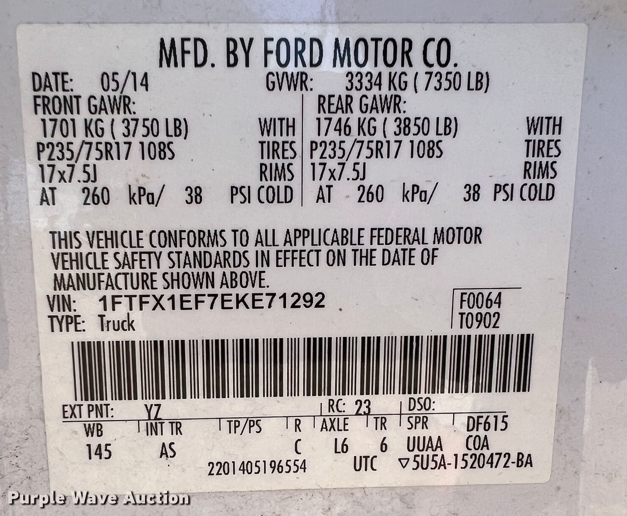 2014 Ford F150 SuperCab pickup truck. Miles: 165,215 on odometer, VIN: 1FTFX1EF7EKE71292. Engine Displacement: 5.0L V8, Cylinders: 8, Fuel type: Gas. Transmission Automatic, Four wheel drive. Interior AC, Heat, Power windows, Power locks, Cruise control. Tires Size: LT245/75R17. Oklahoma title. Title distribution may be delayed up to 14 days from verification of funds. Northeast Rural Services. 27039 S 4440 Rd. Vinita, OK 74301