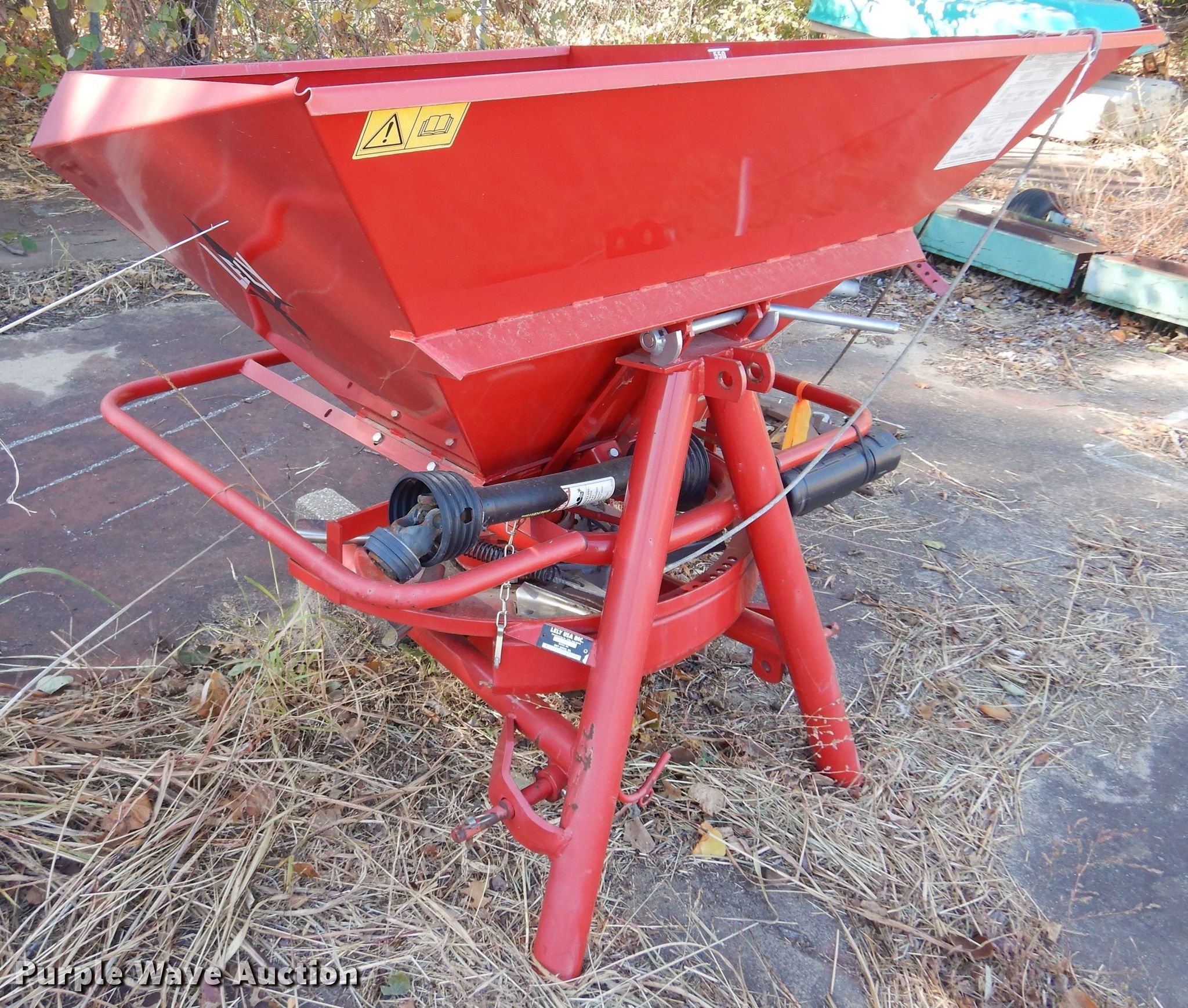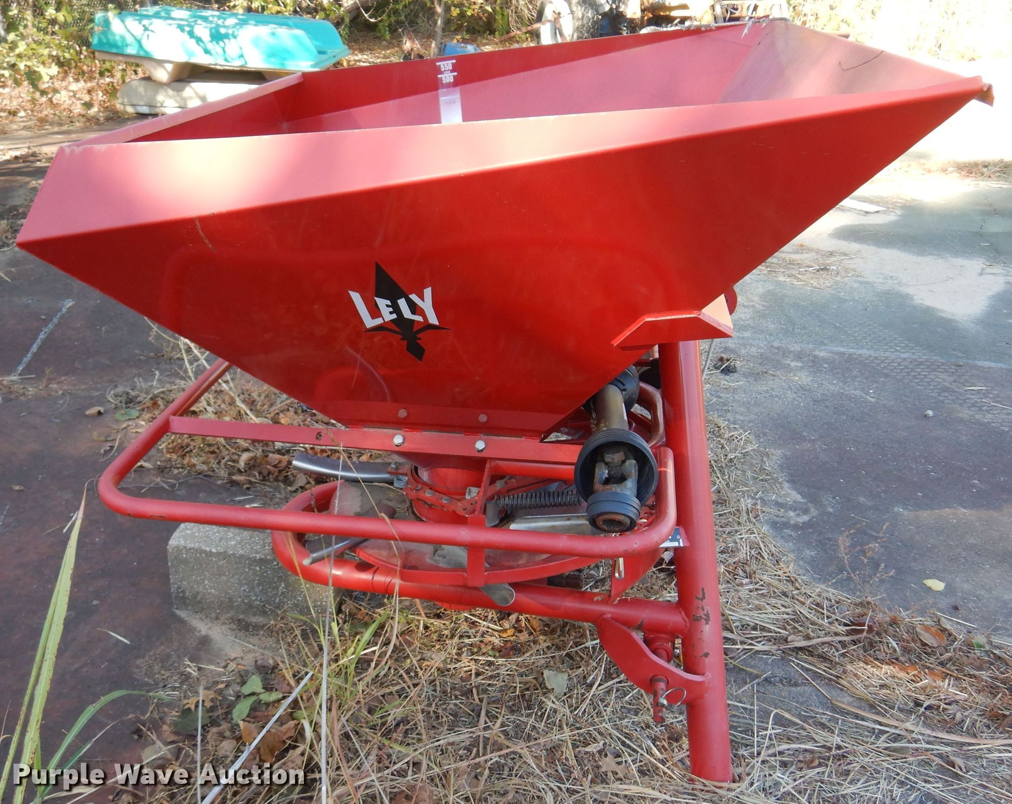 Purple Wave is selling a used Applicator Attach. in Kansas. This item is a Lely 1250 spreader with the following: Serial: 23205116095896, 52" x 44", Capacity: 18.9 cu.ft., PTO: 540, Hitch: Three point