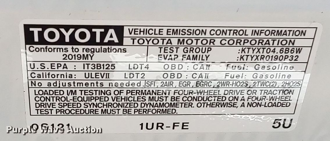 2019 Toyota Tundra Double Cab pickup truck. Miles: 89,919 on odometer, Miles or hours may vary, unit still in use, VIN: 5TFRM5F18KX141997. Engine Displacement: 4.6L V8 DOHC, Cylinders: 8, Fuel type: Gas. Transmission Automatic. Interior AC, Heat, Power windows, Power locks, Cruise control. Tires Size: 275/65R18. Texas title. Title distribution may be delayed up to 30 days from verification of funds. EST, Inc.. 201 Industrial Blvd. Moore, OK 73160