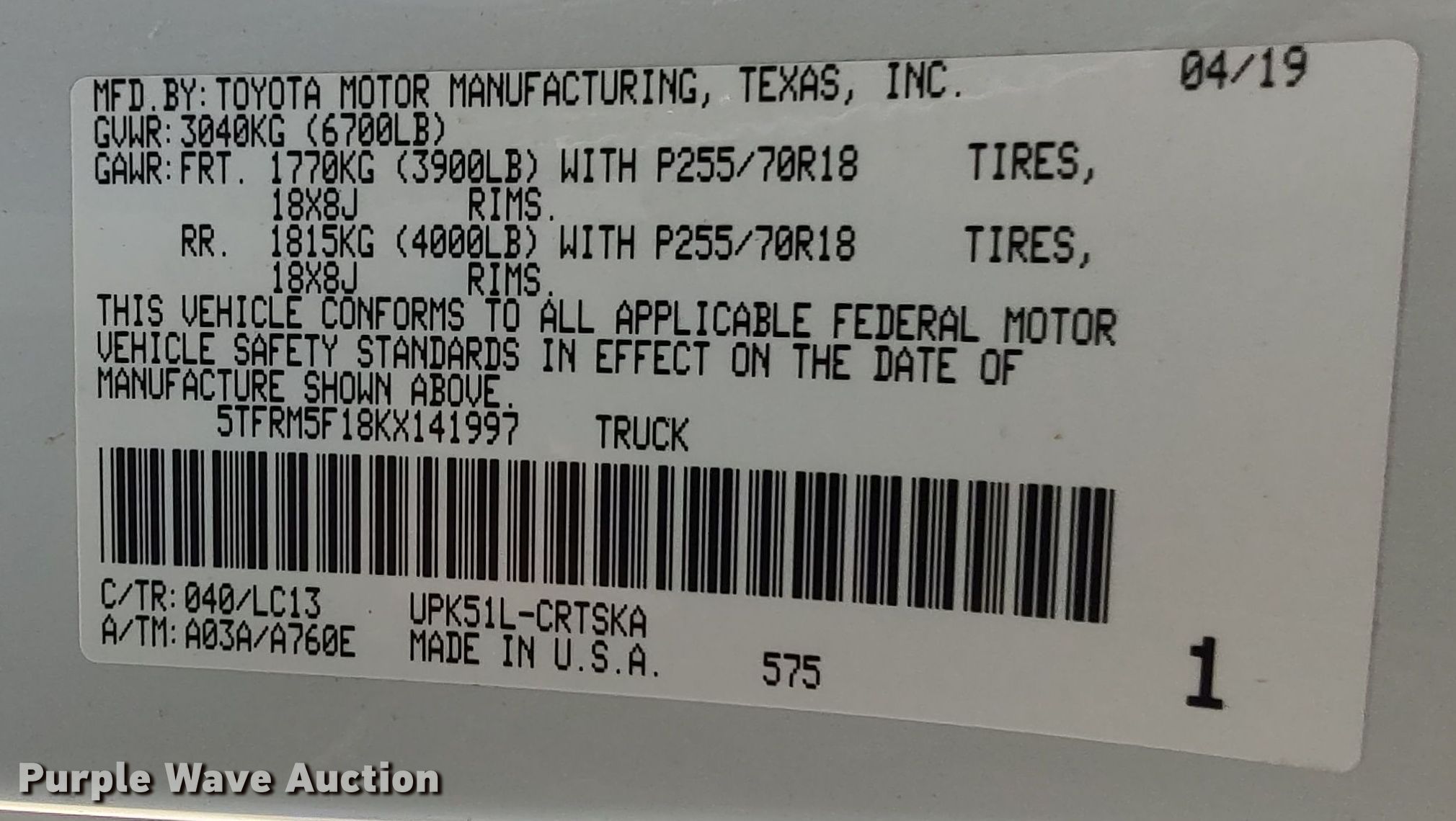 Purple Wave is selling a used 1/2 Ton Pickup or Van in Oklahoma. This item is a 2019 Toyota Tundra Double Cab pickup truck with the following: Miles: 89,919 on odometer, Miles or hours may vary, unit still in use, VIN: 5TFRM5F18KX141997