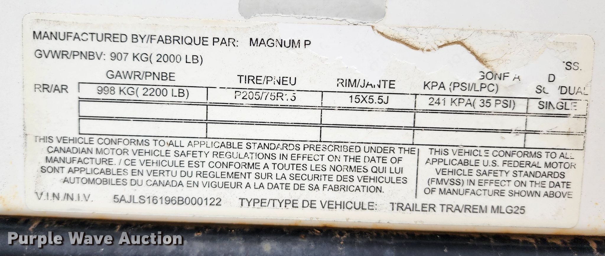 2006 Magnum MLG25 generator. VIN: 5AJLS16196B000122. Engine Cylinders: 4, Fuel type: Diesel. Features Generator kVA: 23, kW: 15, Phase: Single, Three, Electric start, Fuel tank. Trailer 9' L x 60" W, Ball hitch size: 2", Suspension: Spring, Axles: Single, Tire size: 205/75R15. Notes Possible electrical issues, Non-operational unit. Transfer of ownership documentation will be a bill of sale. Blue Springs Rental. 1615 SW US 40 Hwy. Blue Springs, MO 64015
