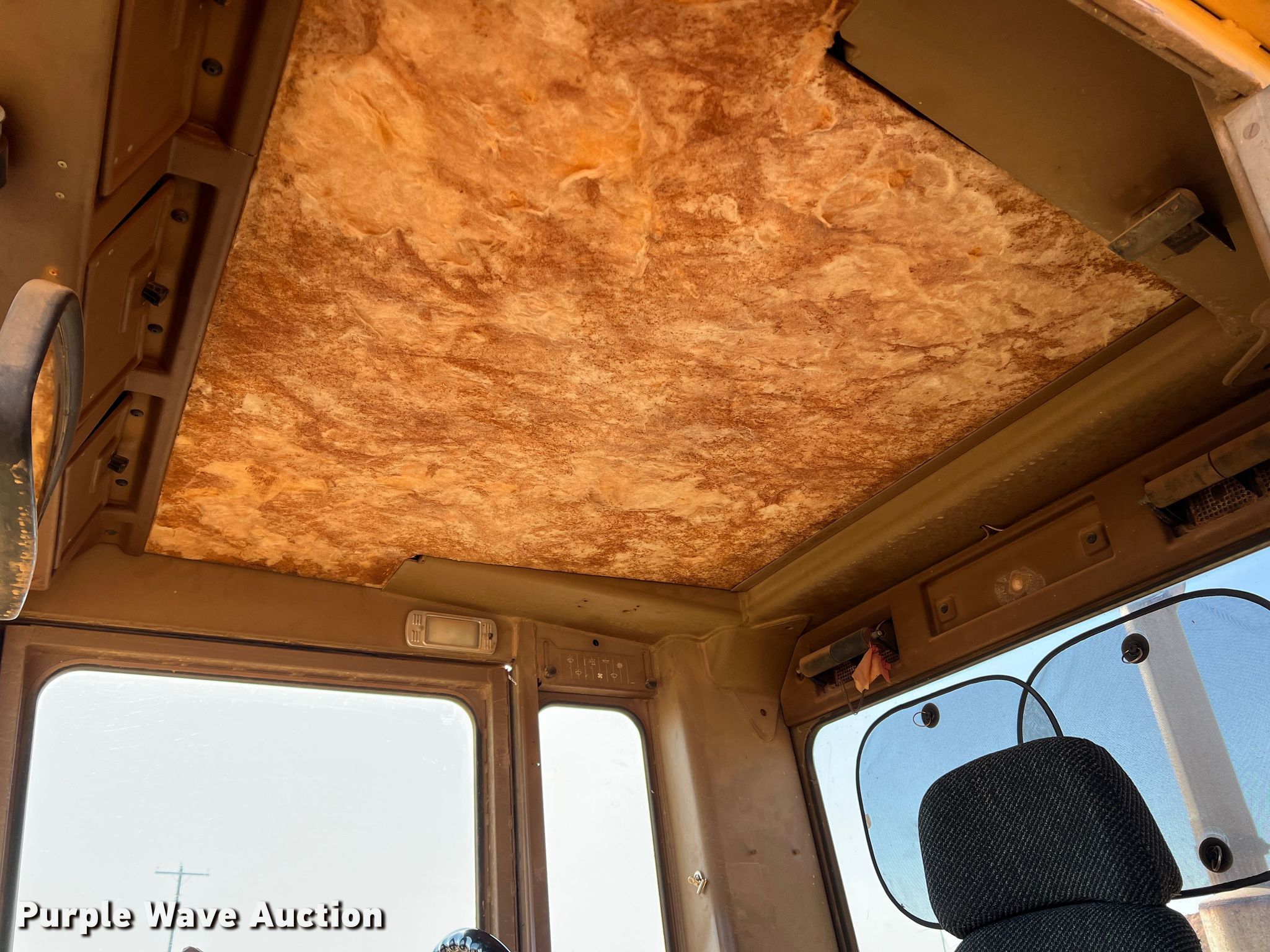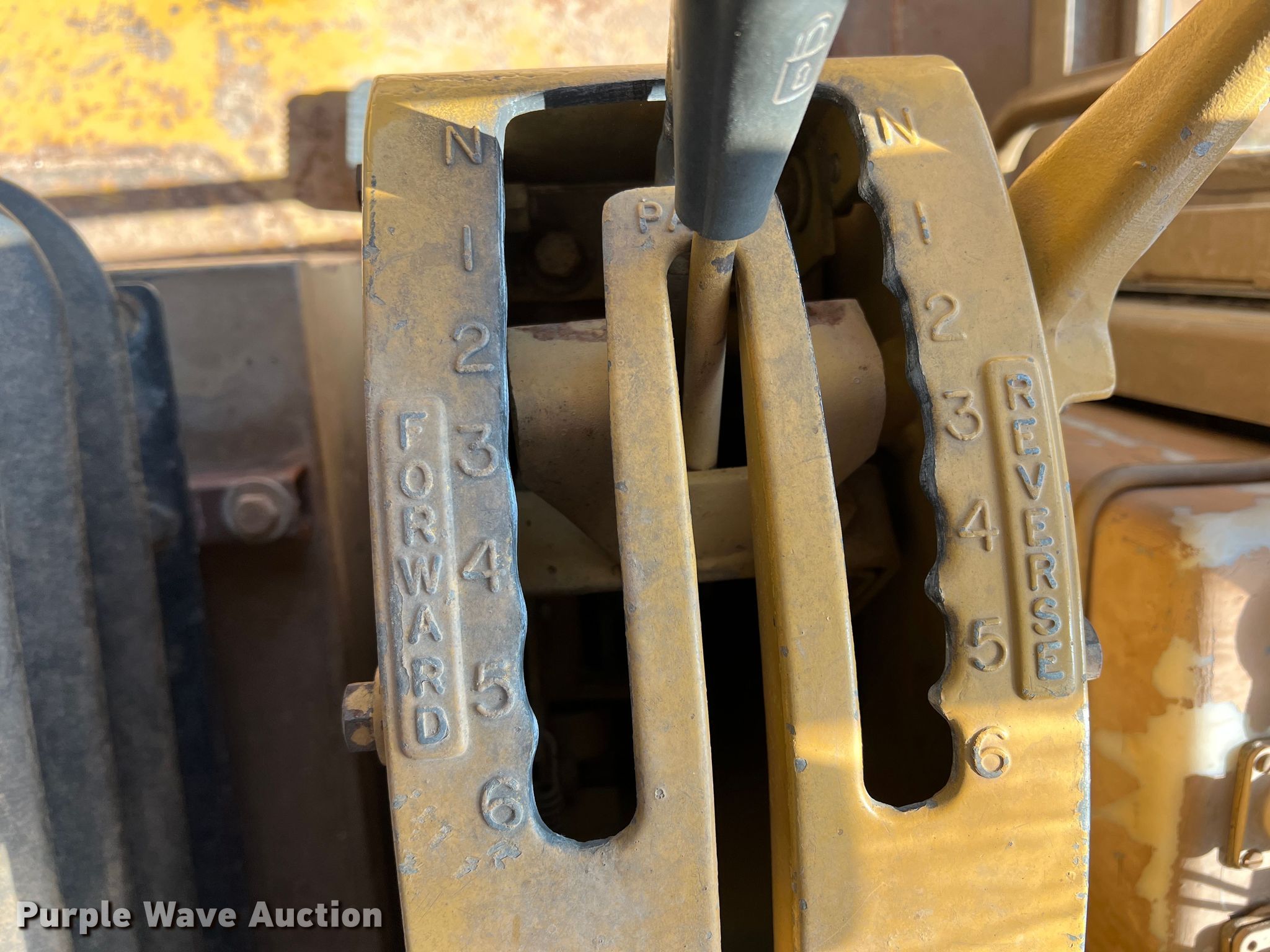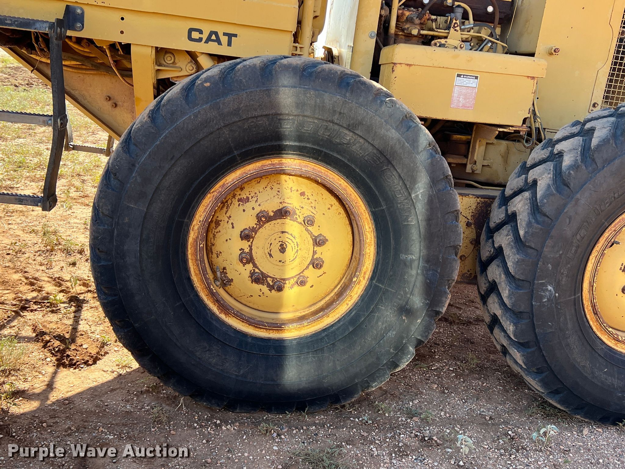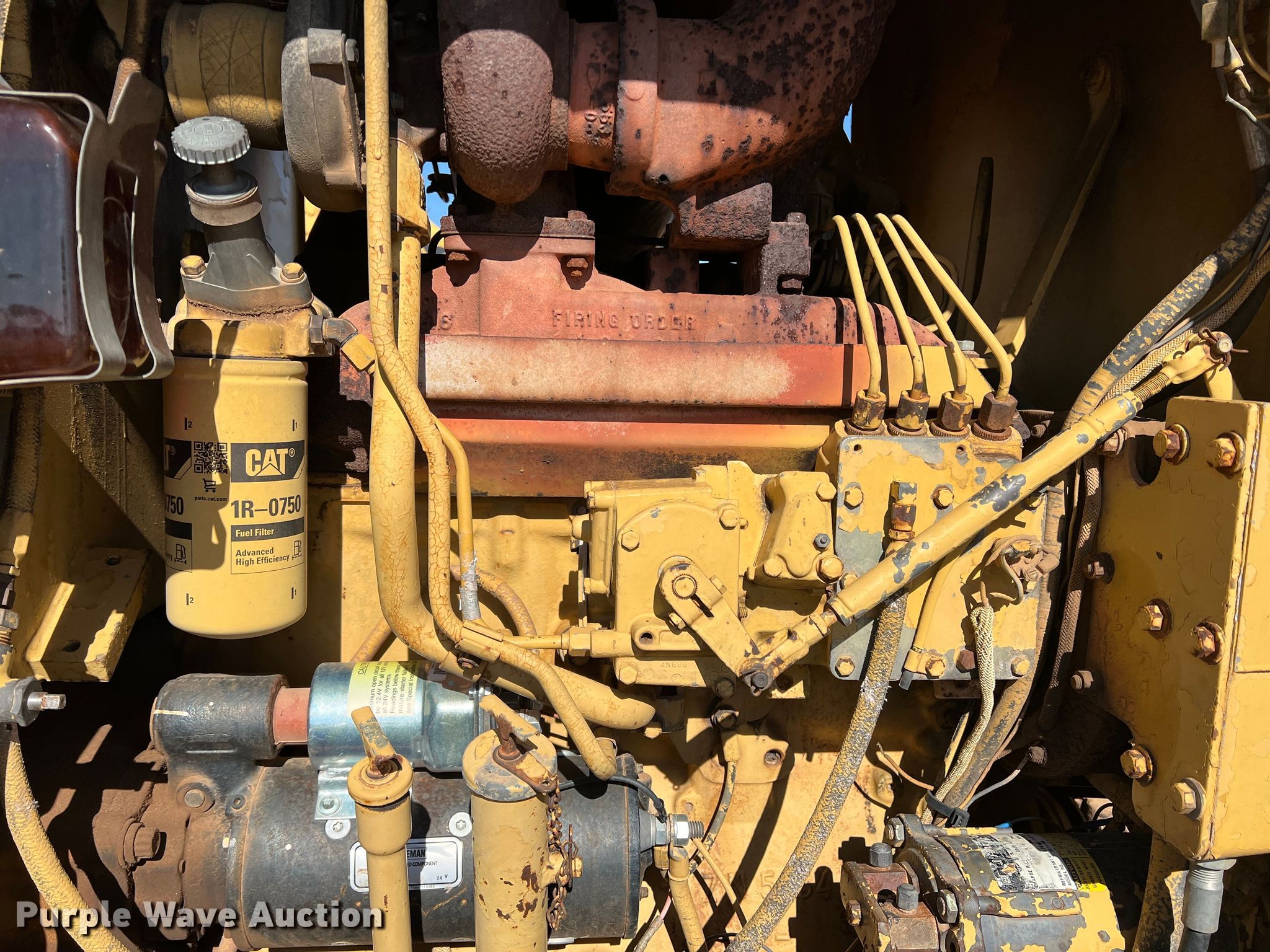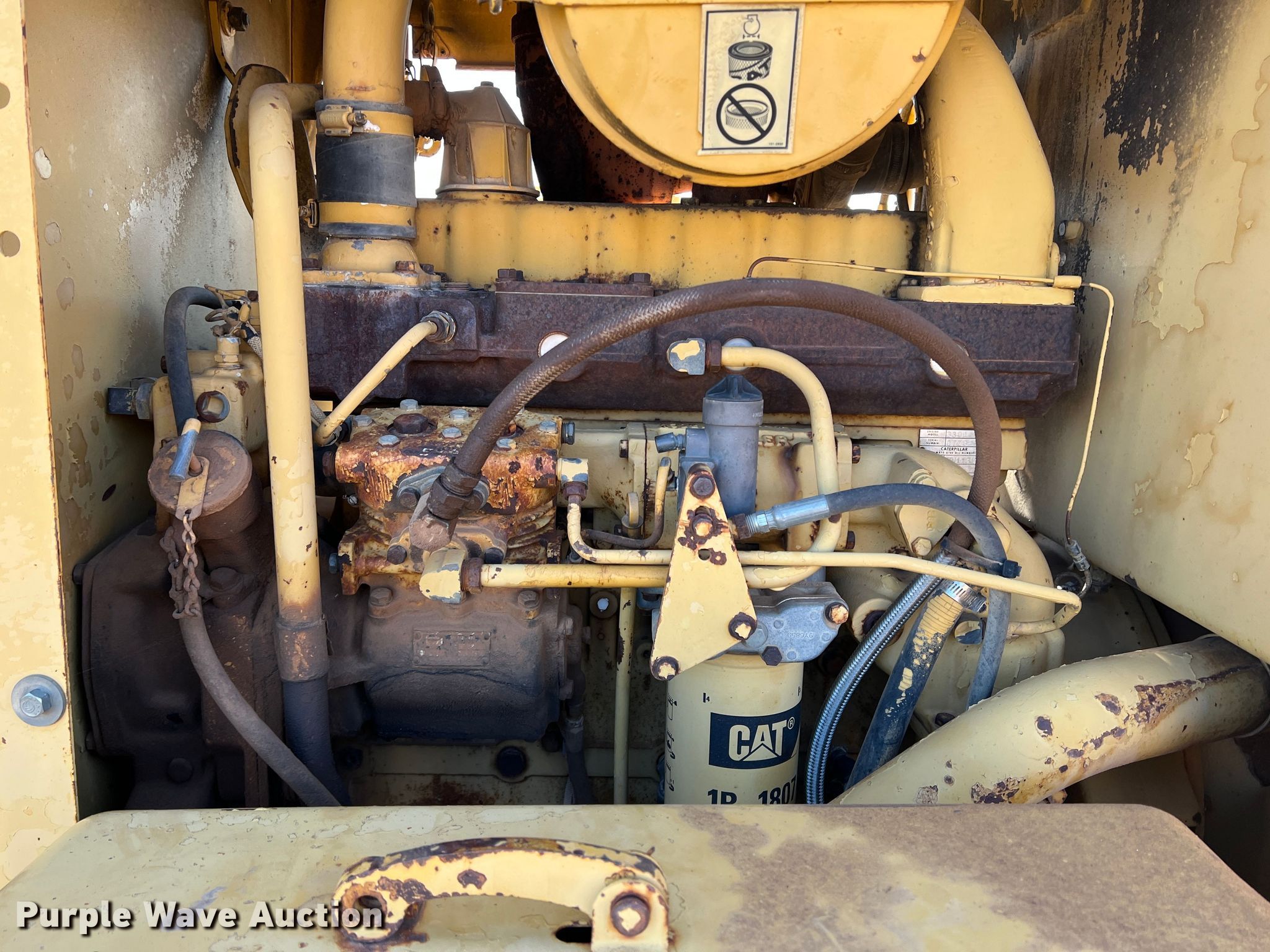 1983 Caterpillar 120G motor grader. Serial: 87V06601. Engine Caterpillar 3304 D1, Serial: 07Z04916, Cylinders: 4, Fuel type: Diesel. Transmission Powershift, 6F - 6R. Operators station Enclosed cab, AC, Heat, Hydraulic control valves: 8. Features Moldboard: Tip control, Side shift, Moldboard total length: 14', Front-mounted push block. Tires Size: 14.00R24. Notes Glass cracked. Southwest Dirt Contractors Inc. County Road 1137. Snyder, TX 79549