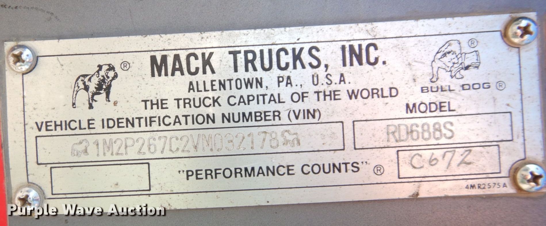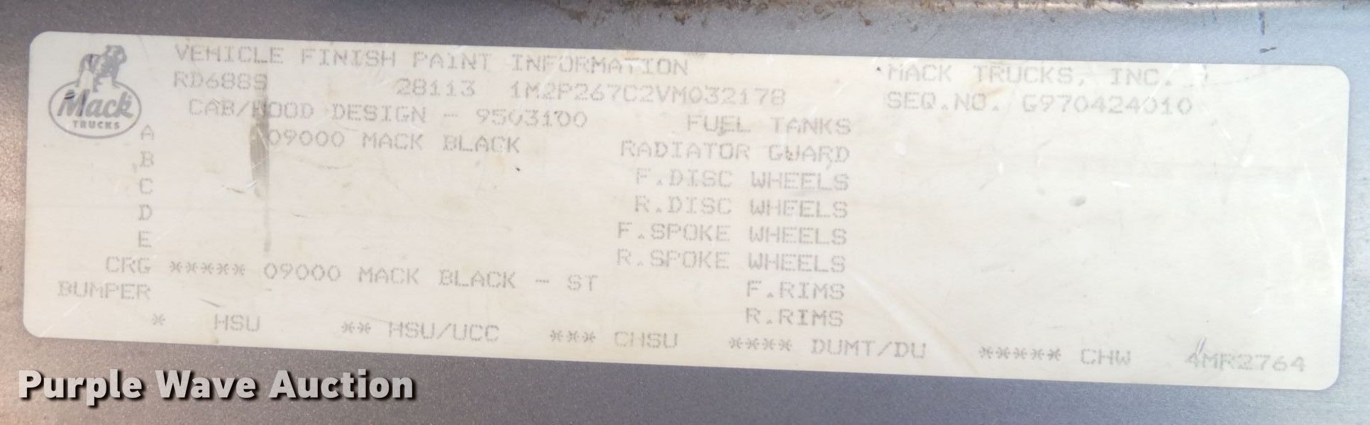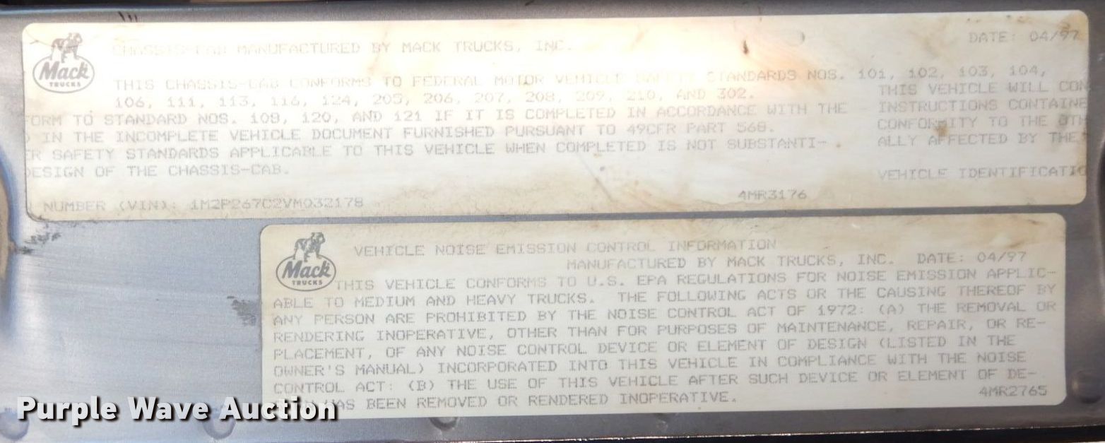 Purple Wave is selling a used Construction Dump Truck in Kansas. This item is a 1997 Mack RD688S dump truck with the following: Miles: 309,752 on odometer, Hours: 19,564 on meter, VIN: 1M2P267C2VM032178