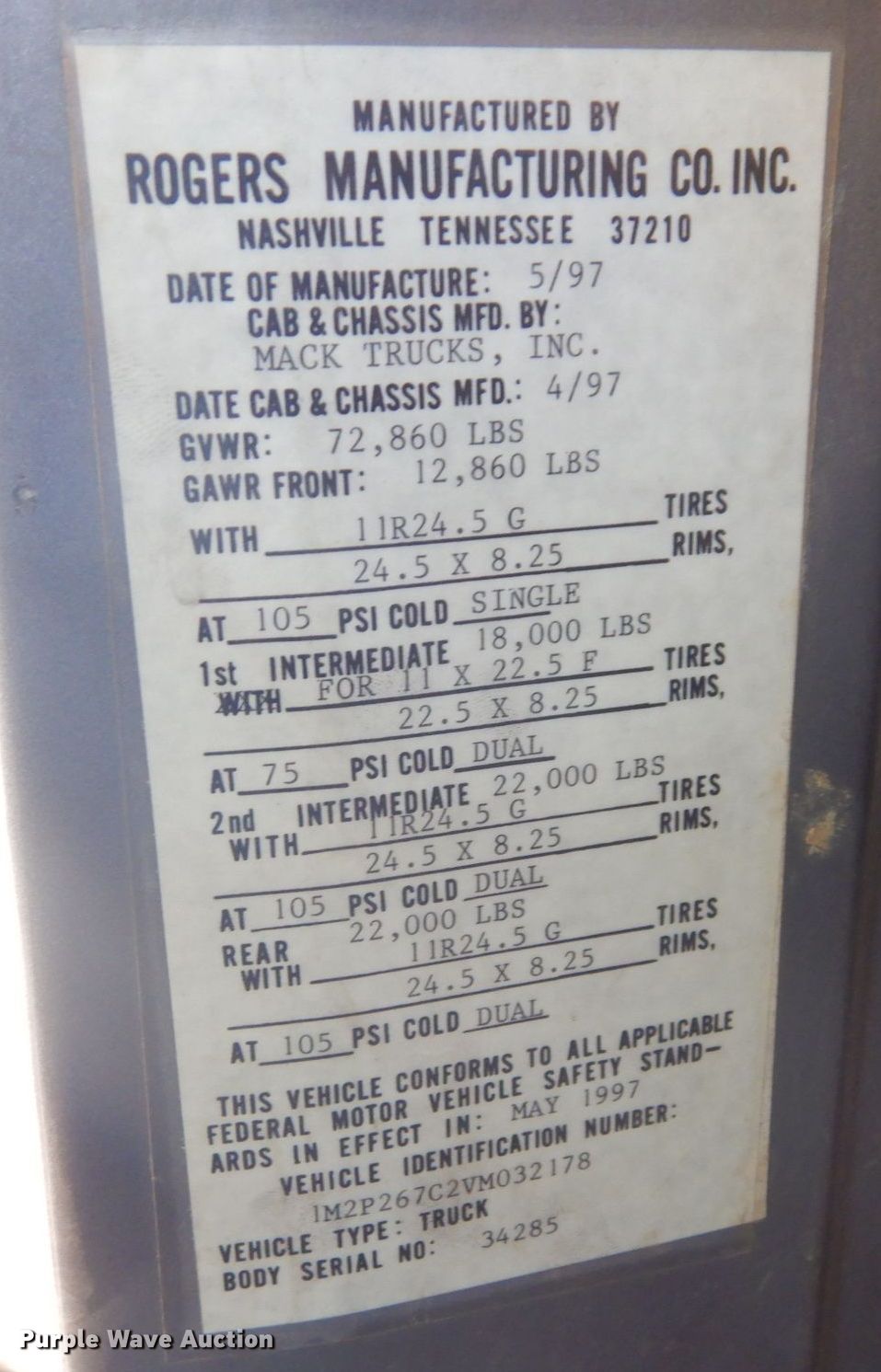 1997 Mack RD688S dump truck. Miles: 309,752 on odometer, Hours: 19,564 on meter, VIN: 1M2P267C2VM032178. Engine Mack E7-350, Serial: 7F1874, Displacement: 12.0L, Cylinders: 6, Fuel type: Diesel, HP: 350, Engine brake. Transmission Eaton Fuller, Manual, Speed: 10. Chassis Double frame, Axles: Triple, Pusher axle, Suspension: Camelback, Brakes: Air, PTO, GVWR: 72,860 lbs FAWR: 12,860 lbs, IAWR: 22,000 lbs, RAWR: 22,000 lbs, Lift axle GAWR: 18,000 lbs. Interior AC, Heat, Heated mirrors. Features Dump bed Rogers Manufacturing E9536, 16' L x 96" W, Side height: 52", Bed type: Steel, Roll tarp, Ram: Single , End gate: Air operated. Tires Front: 315/80R22.5, Rear: 11R24.5, Lift axle: 315/80R22.5. View repairs. Kansas title. Max Rieke & Brothers, Inc.. 15400 Midland Dr. Shawnee, KS 66217