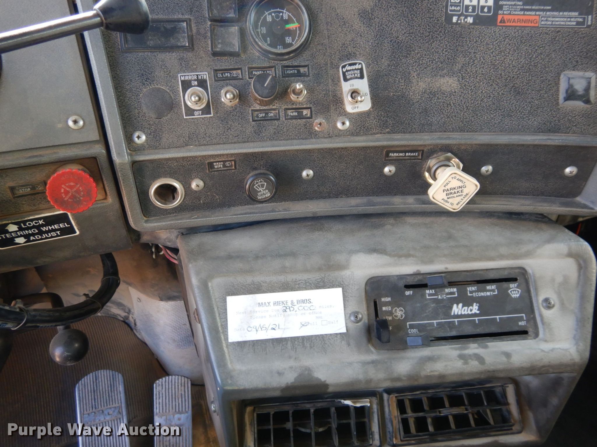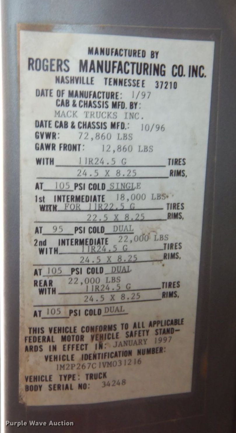 1997 Mack RD688S dump truck. Miles: 291,827 on odometer, Hours: 18,140 on meter, VIN: 1M2P267C1VM031216. Engine Mack E7-350, Serial: 6S1912, Displacement: 12.0L, Cylinders: 6, Fuel type: Diesel, HP: 350, Engine brake. Transmission Eaton Fuller 8LL, Manual, Speed: 10. Chassis Double frame, Axles: Triple, Pusher axle, Differential lock: Full, Suspension: Camelback, Brakes: Air, PTO, GVWR: 72,860 lbs FAWR: 12,860 lbs, IAWR: 22,000 lbs, RAWR: 22,000 lbs, Lift axle GAWR: 18,000 lbs. Interior AC, Heat, Heated mirrors. Features Dump bed Rogers Manufacturing, 16' L x 96' W, Side height: 54", Bed type: Steel, Roll tarp, Ram: Single , End gate: Air operated. Tires Size: 11R24.5, Lift axle: 315/80R22.5. Kansas title. Max Rieke & Brothers, Inc.. 15400 Midland Dr. Shawnee, KS 66217