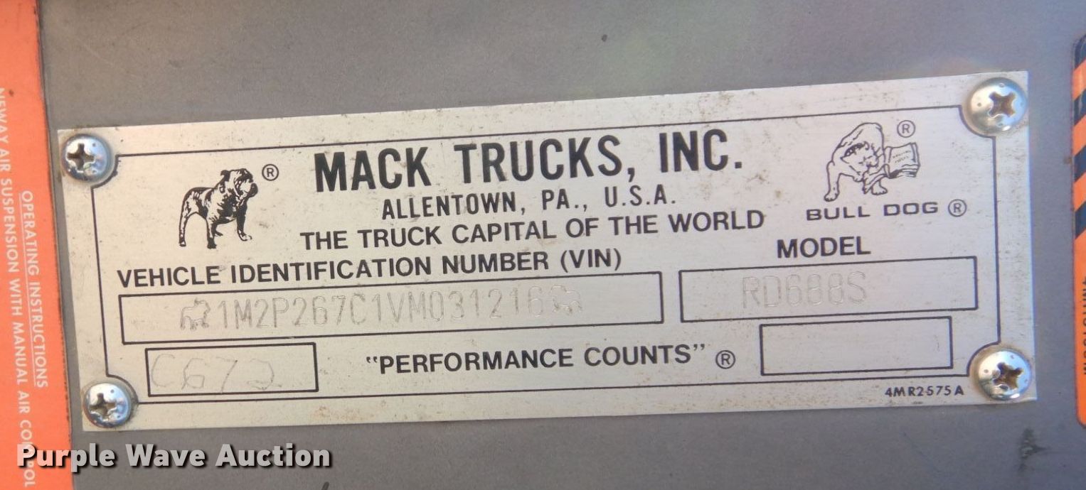 Purple Wave is selling a used Construction Dump Truck in Kansas. This item is a 1997 Mack RD688S dump truck with the following: Miles: 291,827 on odometer, Hours: 18,140 on meter, VIN: 1M2P267C1VM031216