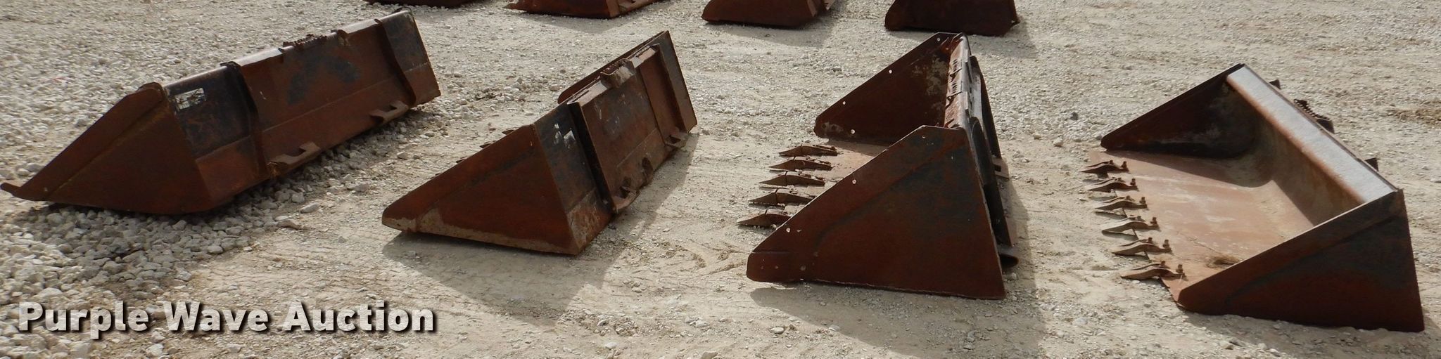 Purple Wave is selling a used Skid Steer Attach. in Iowa. This item is a (4) skid steer buckets with the following: John Deere 76" W skid steer bucket, Caterpillar 72" W skid steer bucket, (2) 72" W skid steer buckets