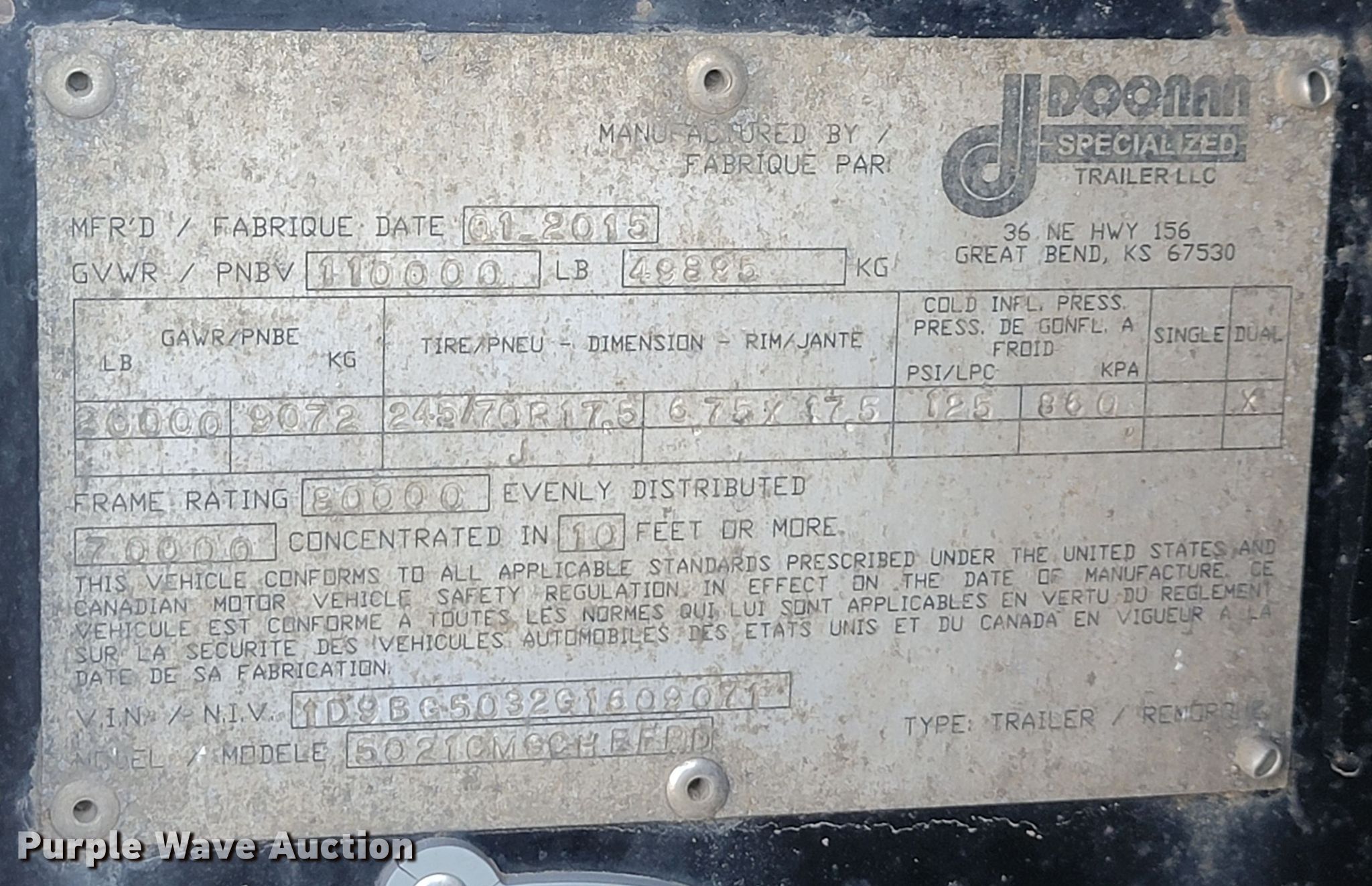 2016 Doonan 5021CM drop deck equipment trailer. VIN: 1D9BG5032G1609071. Dimensions Overall: 50' L x 102" W, Deck: 35' 10" L x 102" W, Top deck length: 10', Tail length: 54", Ramps: Manual Length: 43". Features Deck type: Wood. Chassis Landing gear: Dual, Suspension: Air, Brakes: Air, Axles: Triple, GVWR: 110,000 lbs, GAWR: 20,000 lbs. Tires Aluminum wheels, Size: 245/70R17.5. South Dakota title. Raeco Builders LLC. 115 North Garfield Avenue. Sioux Falls, SD 57104