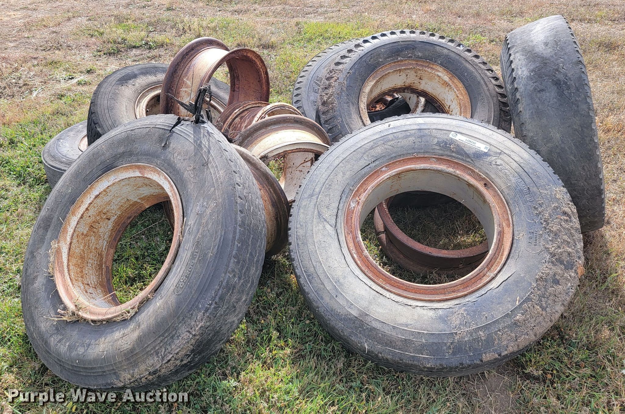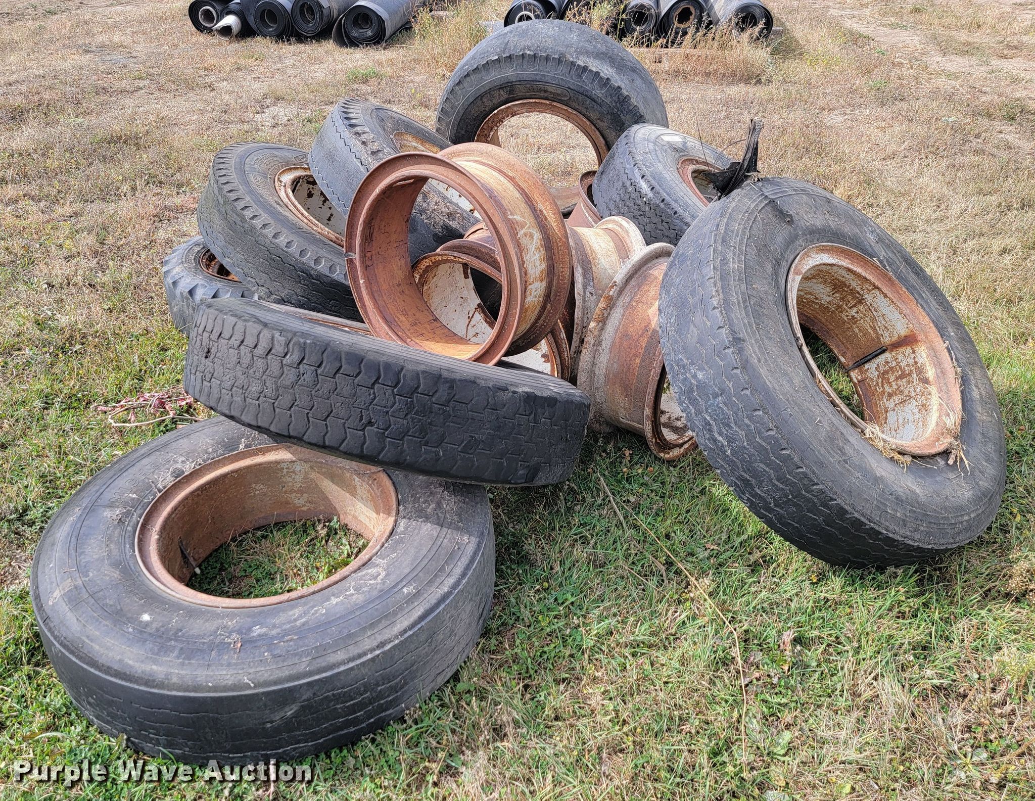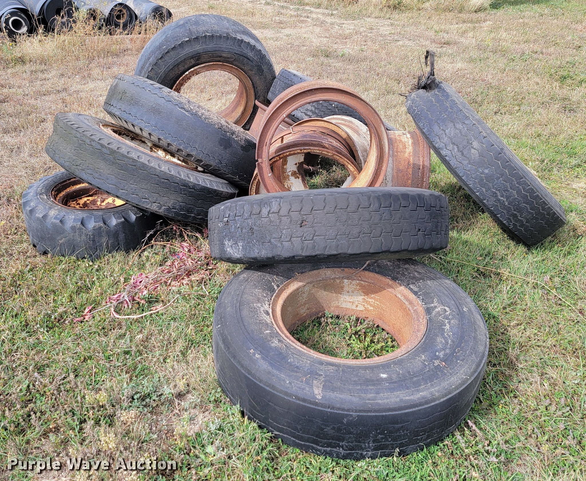 Purple Wave is selling a used Fleet Tires in South Dakota. This item is a (13) Tires and wheels with the following: (7) 10.00R-20 tires and wheels, (5) wheels, 10-16.5 tire and wheel