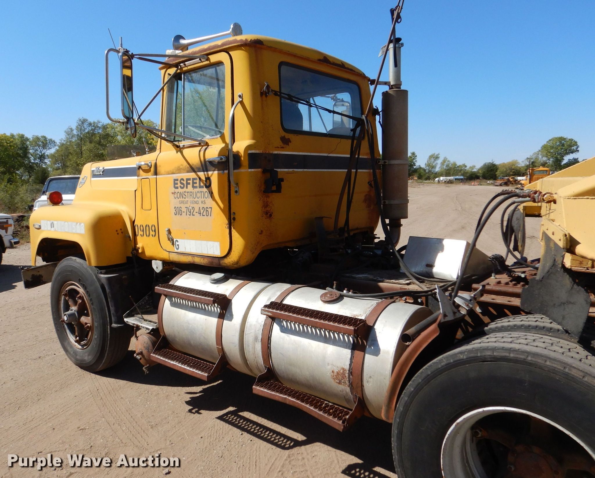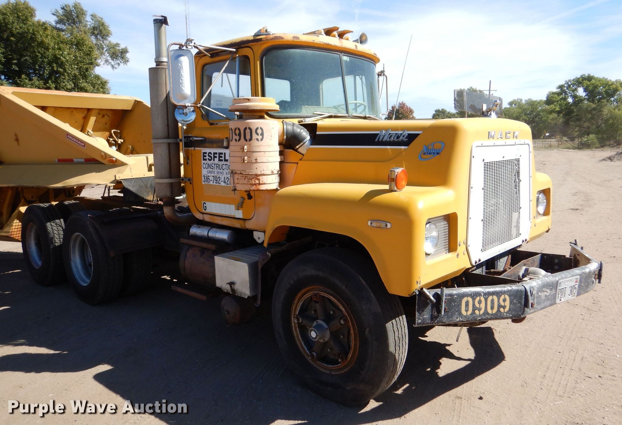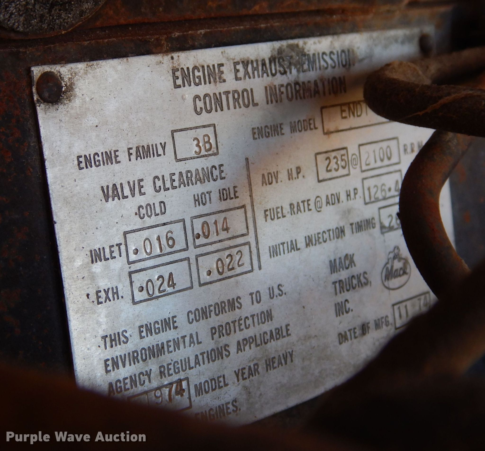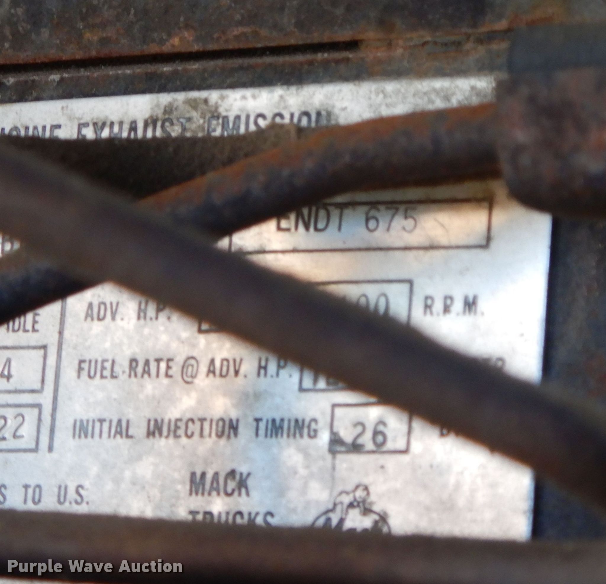 1975 Mack RS685LST semi truck. Miles: 575,951 on odometer, Hours: 8,153 on meter, VIN: RS685LST23926. Engine Mack ENDT 675, Cylinders: 6, Fuel type: Diesel, HP: 235. Transmission Manual, Speed: 5, plus 2. Chassis Axles: Tandem, Differential lock: Inter-axle, Suspension: Camelback, Brakes: Air, PTO, Wet kit. Interior Heat. Features Fifth wheel type: Air operated, Sliding, Fuel tank: Single. Tires Size: 11R22.5. Notes Trailer not included. Kansas title. Esfeld Construction, Inc... Great Bend, KS 67530