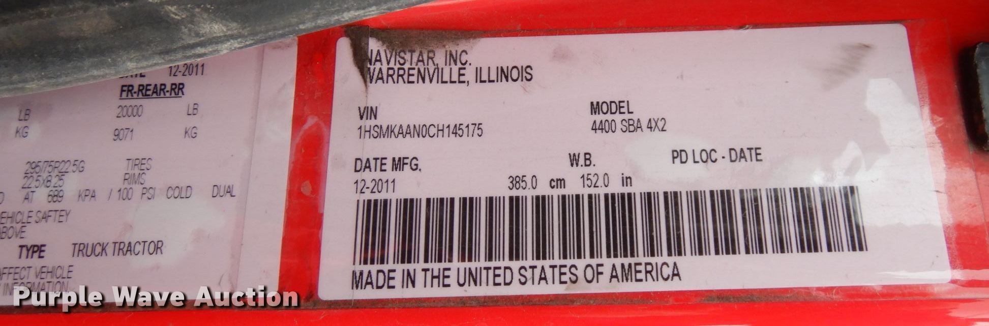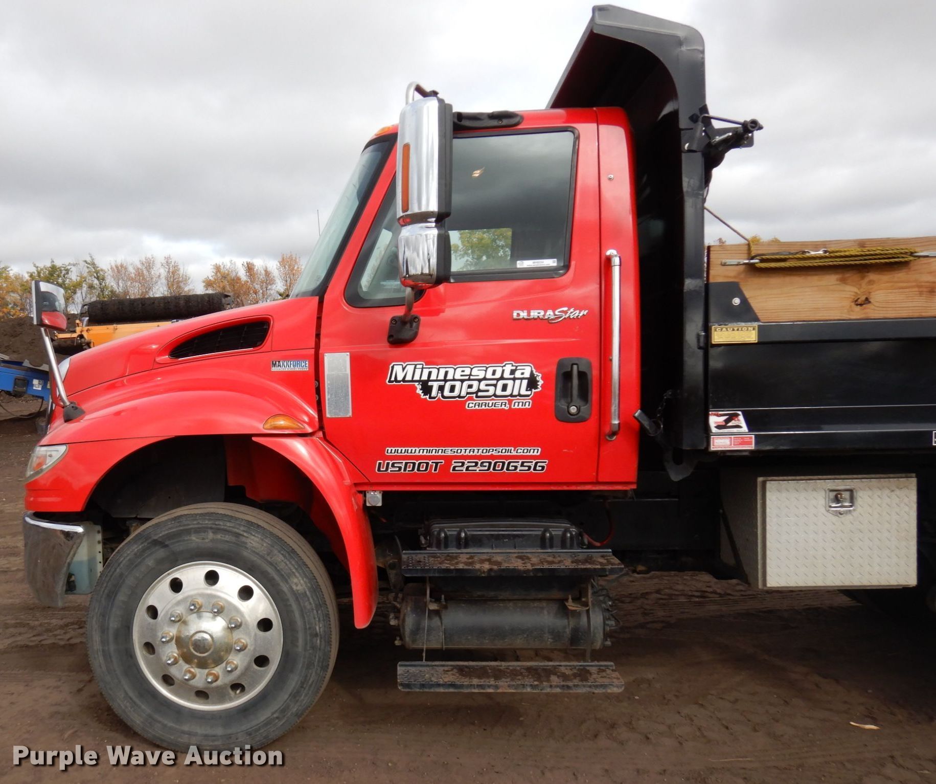 2012 International 4400 SBA dump truck. Miles: 193,920 on odometer, Hours: 6,918 on meter, VIN: 1HSMKAAN0CH145175. Engine International MaxxForce DT, Displacement: 7.6L, Cylinders: 6, Fuel type: Diesel. Transmission Allison, Automatic. Chassis Axles: Single, Suspension: Air, Brakes: Air, GVWR: 32,000 lbs FAWR: 12,000 lbs, RAWR: 20,000 lbs, Wheelbase: 152". Interior AC, Heat, Heated mirrors, Cruise control, Brake controller. Features Dump bed Monroe, 11' L x 7' 11" W, Side height: 18", Side board height: 11", Bed type: Steel, Roll tarp, Ram: Single , End gate: Manual. Tires Front: 275/80R22.5, Rear: 295/75R22.5. Minnesota title. Title distribution may be delayed up to 14 days from verification of funds. Minnesota Topsoil. 4220 County Road 10. Watertown, MN 55388