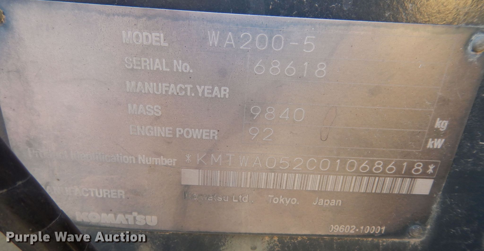 2007 Komatsu WA200-5 wheel loader. Hours: 3,199 on meter, Serial: 68618, Unit #: 001391. Engine Komatsu SAA6D102E2, Serial: 26395255, Displacement: 5.9L, Cylinders: 6, Fuel type: Diesel, kW: 92. Transmission Powershift, 4F - 4R. Operators station Enclosed cab, AC, Heat. Features Bucket JRB WA200L-5, Capacity: 2 cu.yd., Width: 101", Four-in-one, Cutting edge: Bolt-on. Tires Size: 20.5R25. Ozawkie, KS 66070