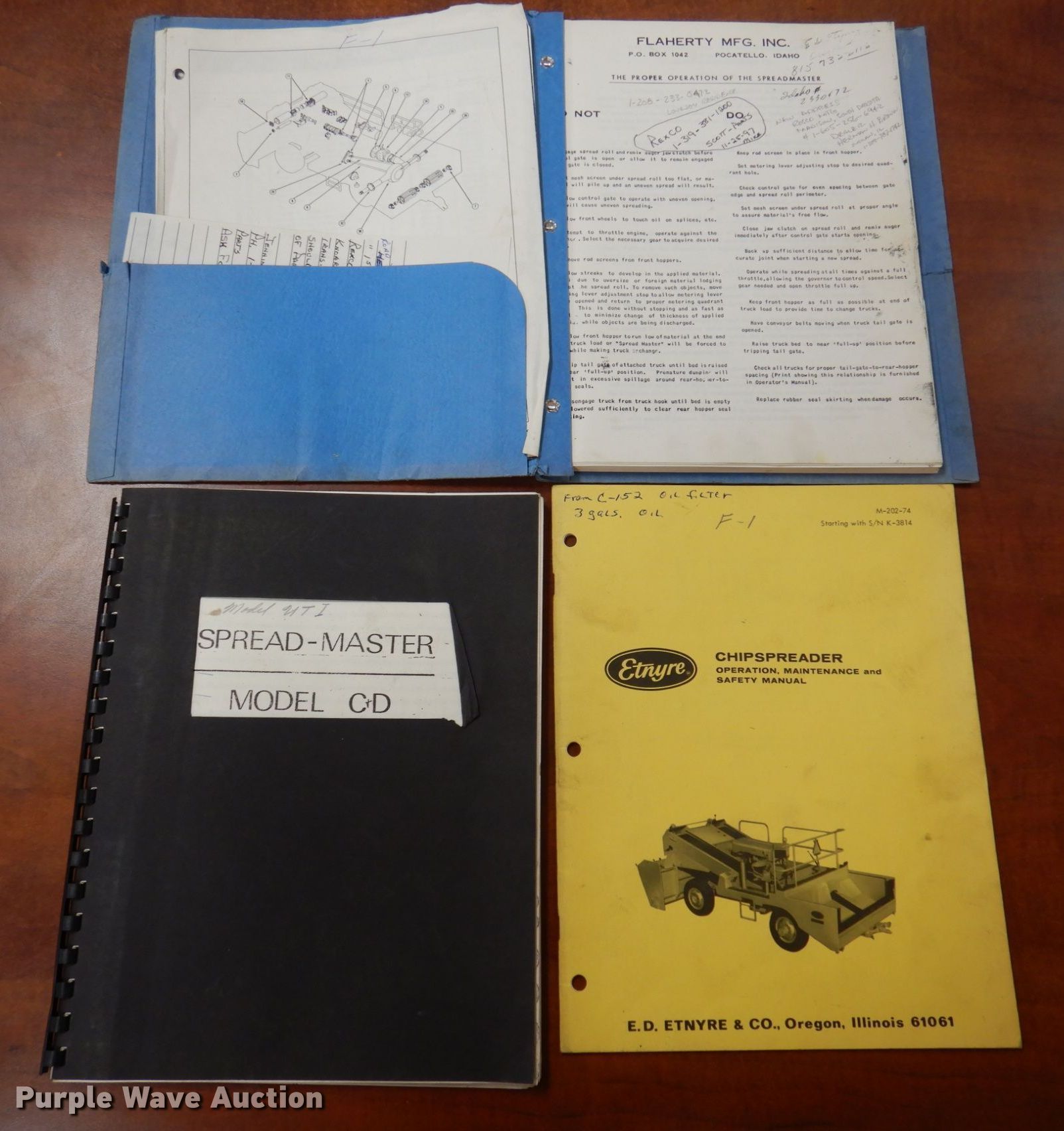 Flaherty Spread Master chip spreader. Hours: Unknown, Serial: C509, Unit #: F-1. Engine Minneapolis Moline, Cylinders: 4, Fuel type: Gas. Transmission Manual, 5F - 1R. Features Front spread hopper width: 12', Material conveyor Width: 19", Truck hitch. Tires Size: 9.00R20. Notes Dead battery. City of Warsaw, IL. 218 Main St. Warsaw, IL 62379