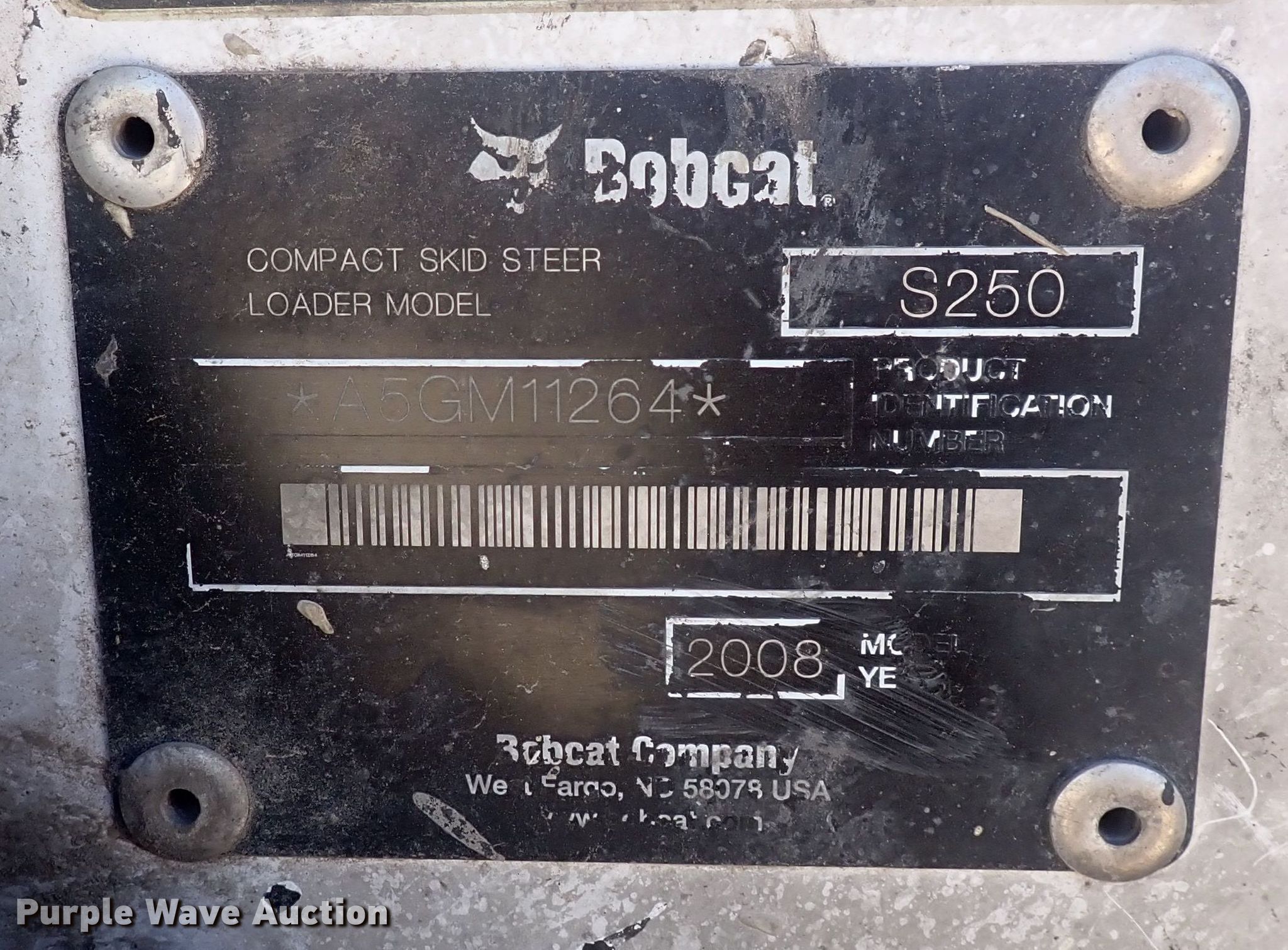 Purple Wave is selling a used Skid Steer Loader in Kansas. This item is a 2008 Bobcat S250 skid steer loader with the following: Hours: 7,304 on meter, Serial: A5GM11264