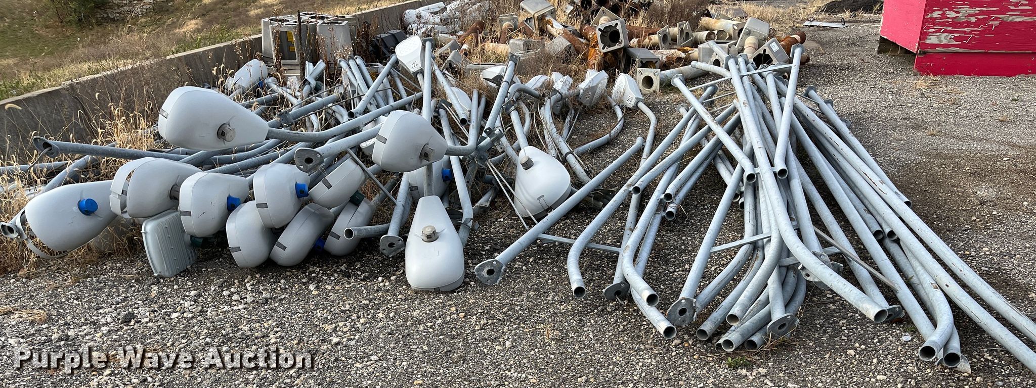 Purple Wave is selling a used Building Materials in Kansas. This item is a Approximately 36 light poles with the following: 35' L, Approx. 36 arms, 18' L, Approx. 56 lights, Approx. 40 bases, 5' L