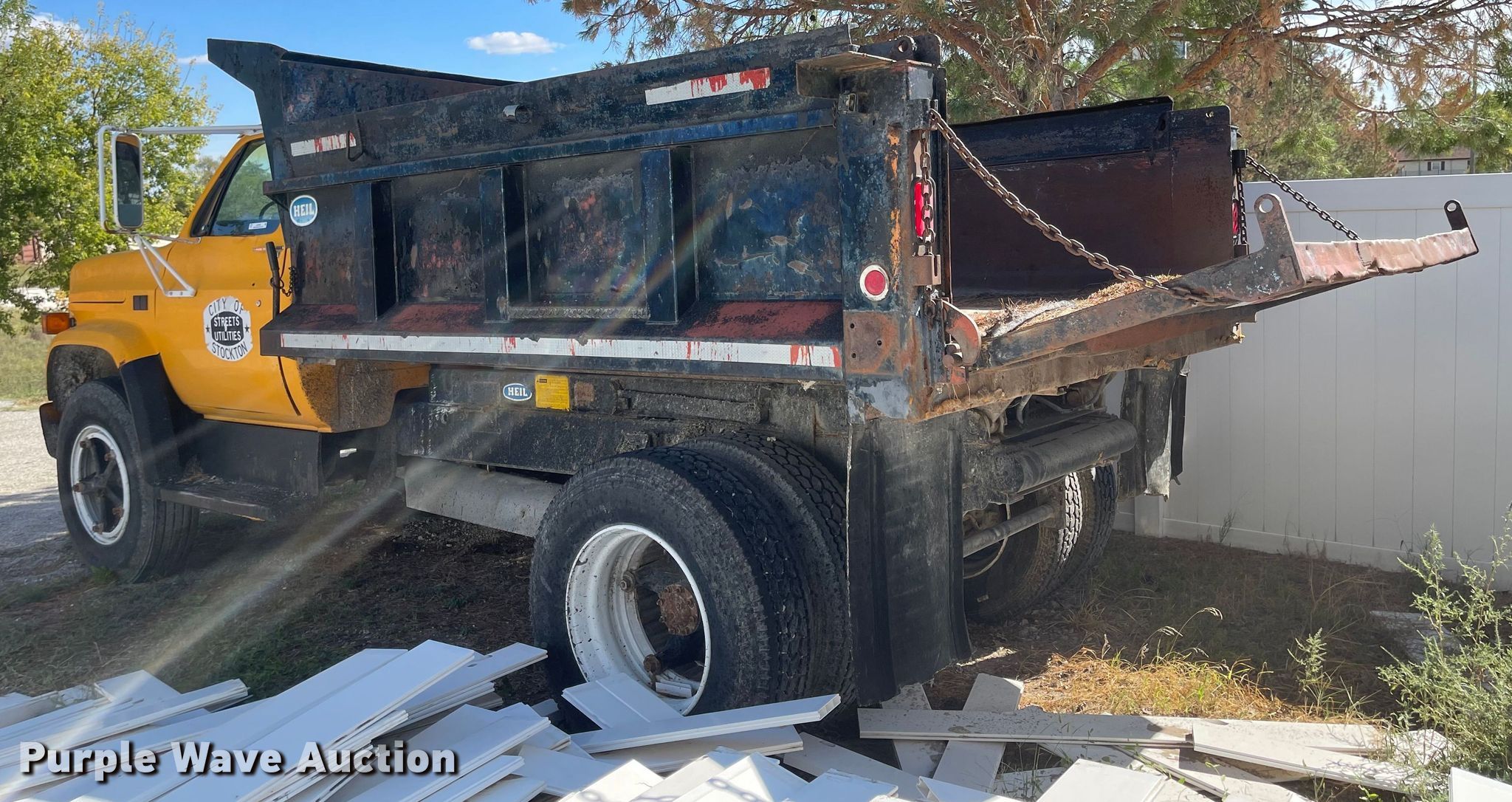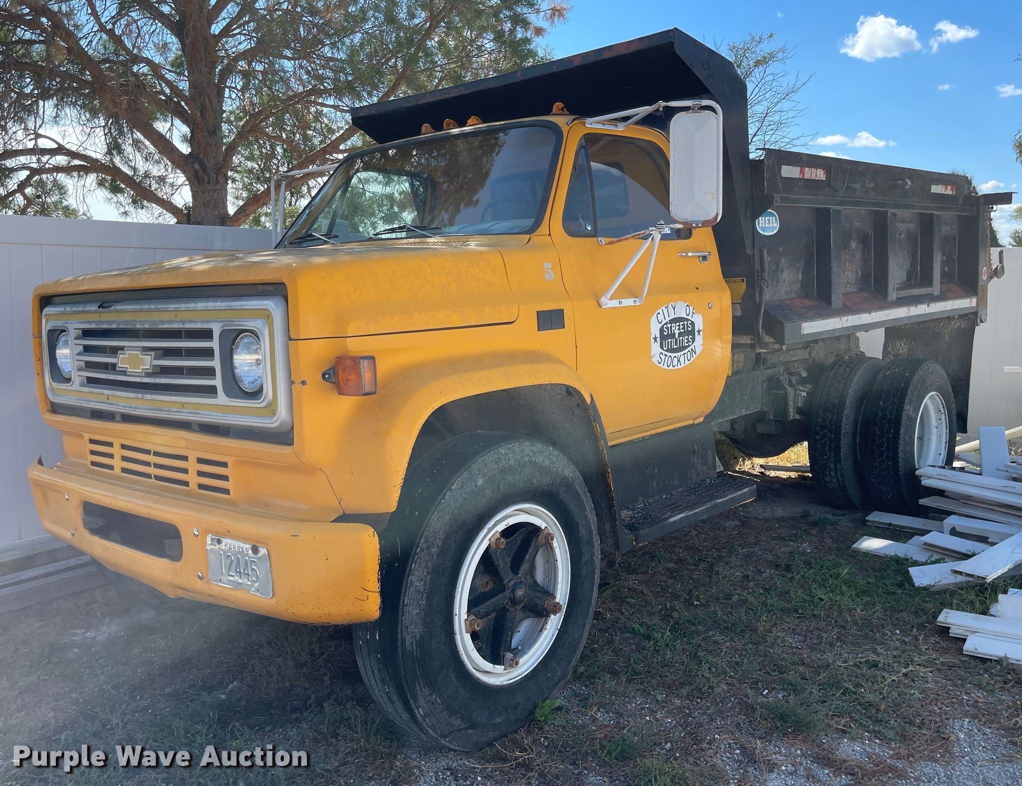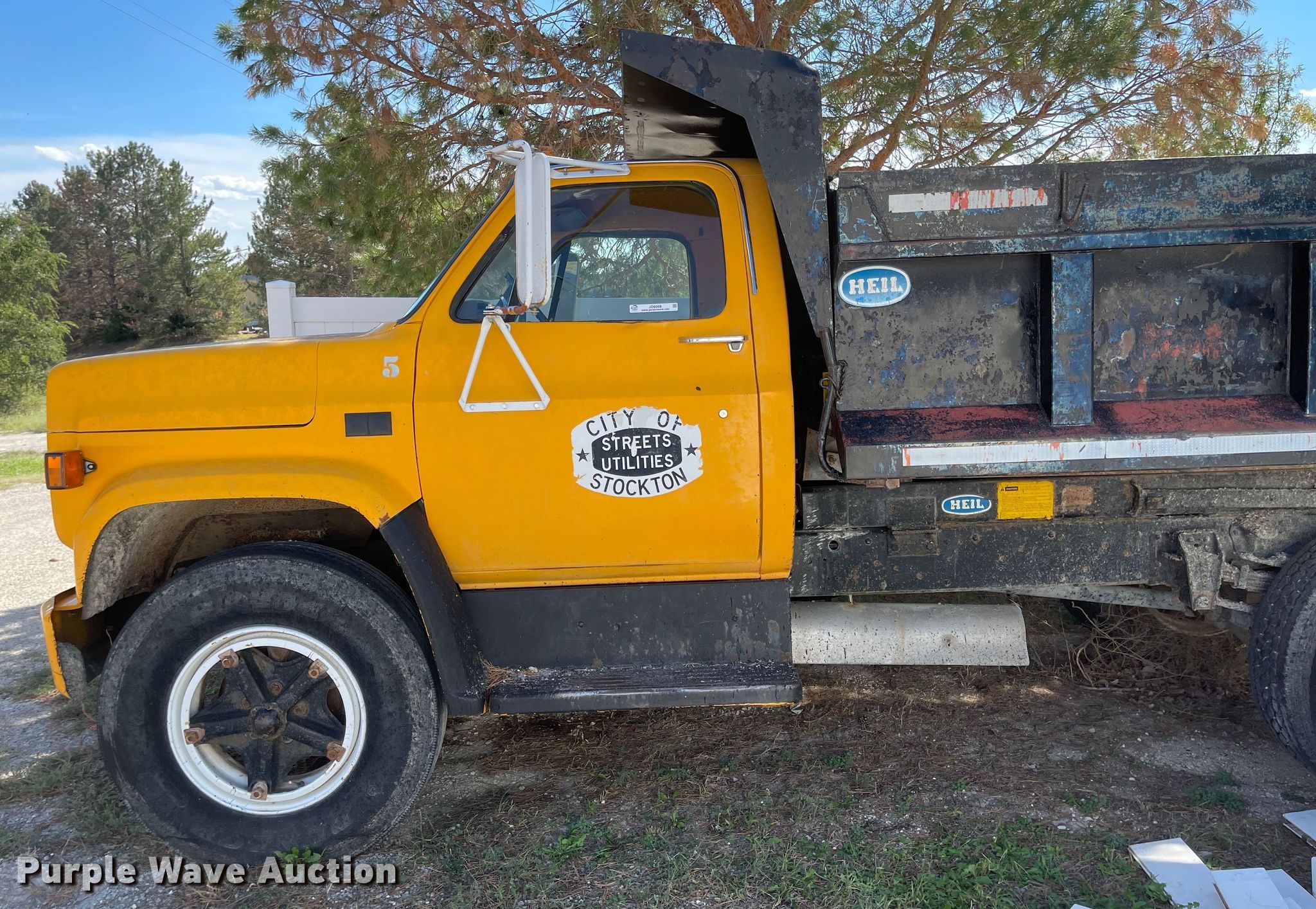 1988 Chevrolet C50 dump truck. Miles: 70,346 on odometer, VIN: 1GBG6D1AXJV106332. Engine Displacement: 5.7L, Cylinders: 8, Fuel type: Gas. Transmission Manual, Speed: 4, plus 2. Chassis Double frame, Axles: Single, Suspension: Spring, Brakes: Hydraulic, PTO. Interior Heat. Features Dump bed Heil, Capacity: 5 cu.yd., 10' L x 96" W, Side height: 30", Bed type: Steel, Ram: Single , End gate: Manual. Tires Front: 9.00R20, Rear: 295/75R22.5. Notes Dead battery. Kansas title. City of Stockton. 115 South Walnut Street. Stockton, KS 67669