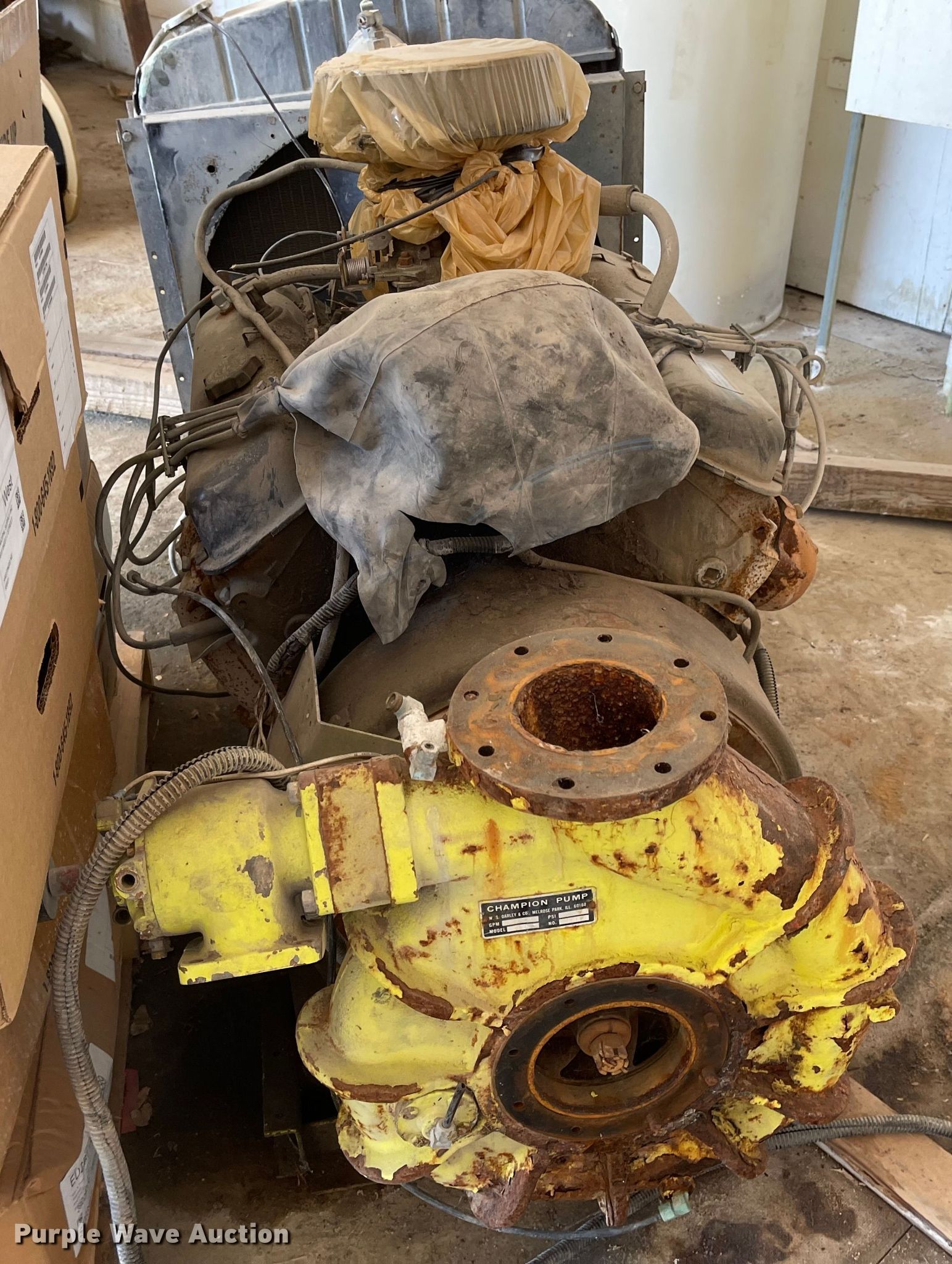 Purple Wave is selling a used Pump in Kansas. This item is a Champion pump with the following: 454 C.I.D. eight cylinder gas engine, 1,000 gpm, 150 PSI, 5" inlet, 4" discharge