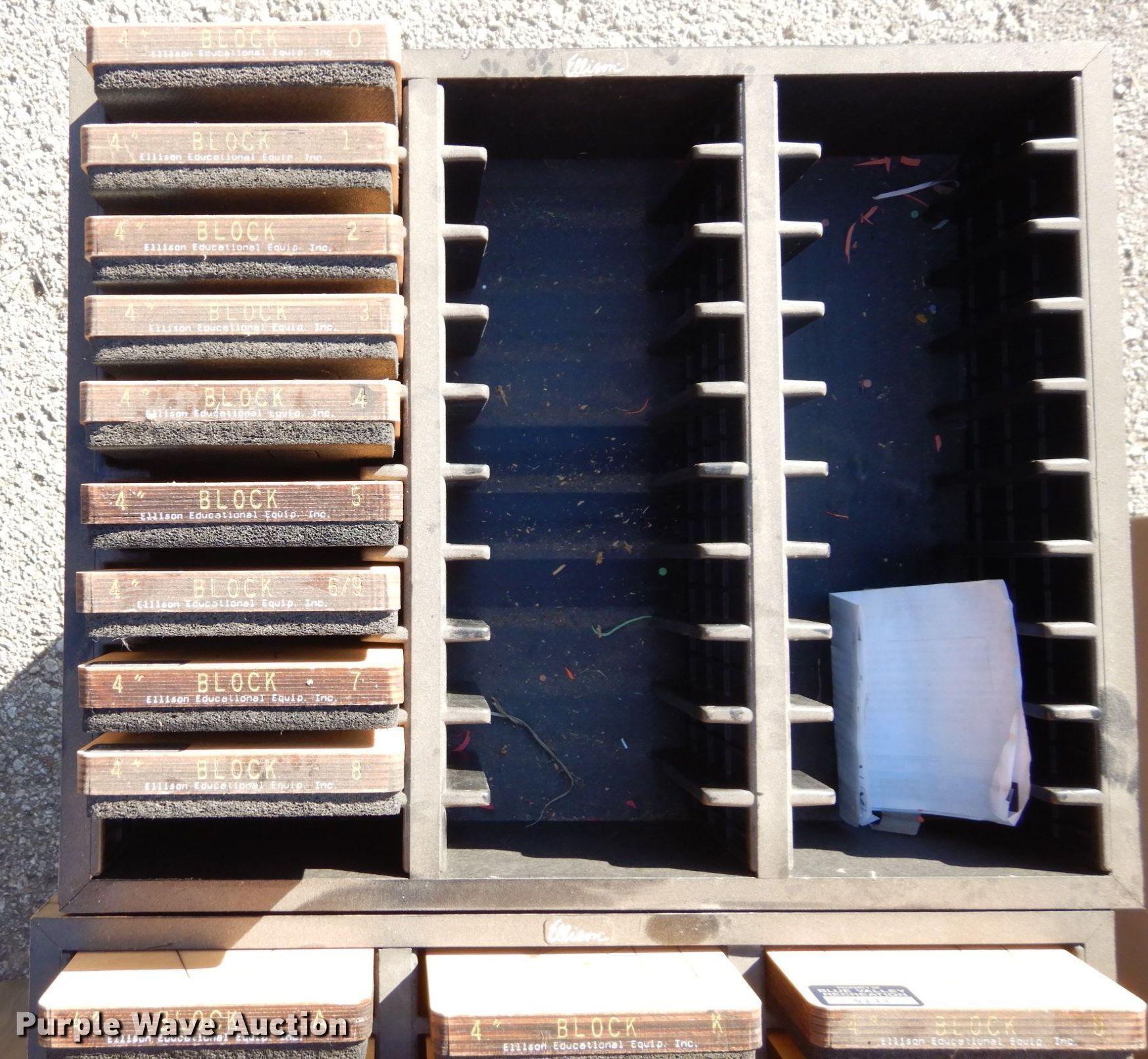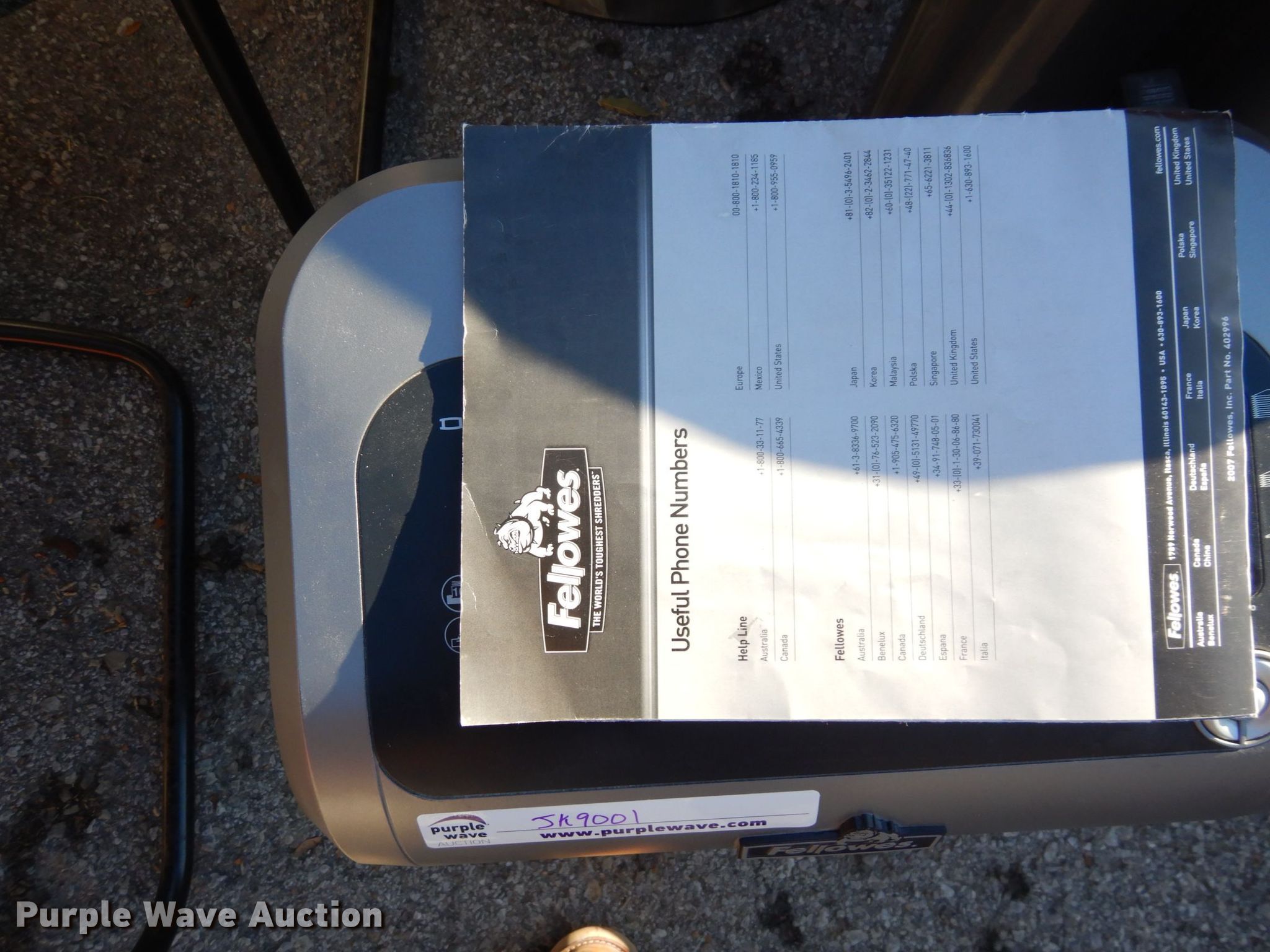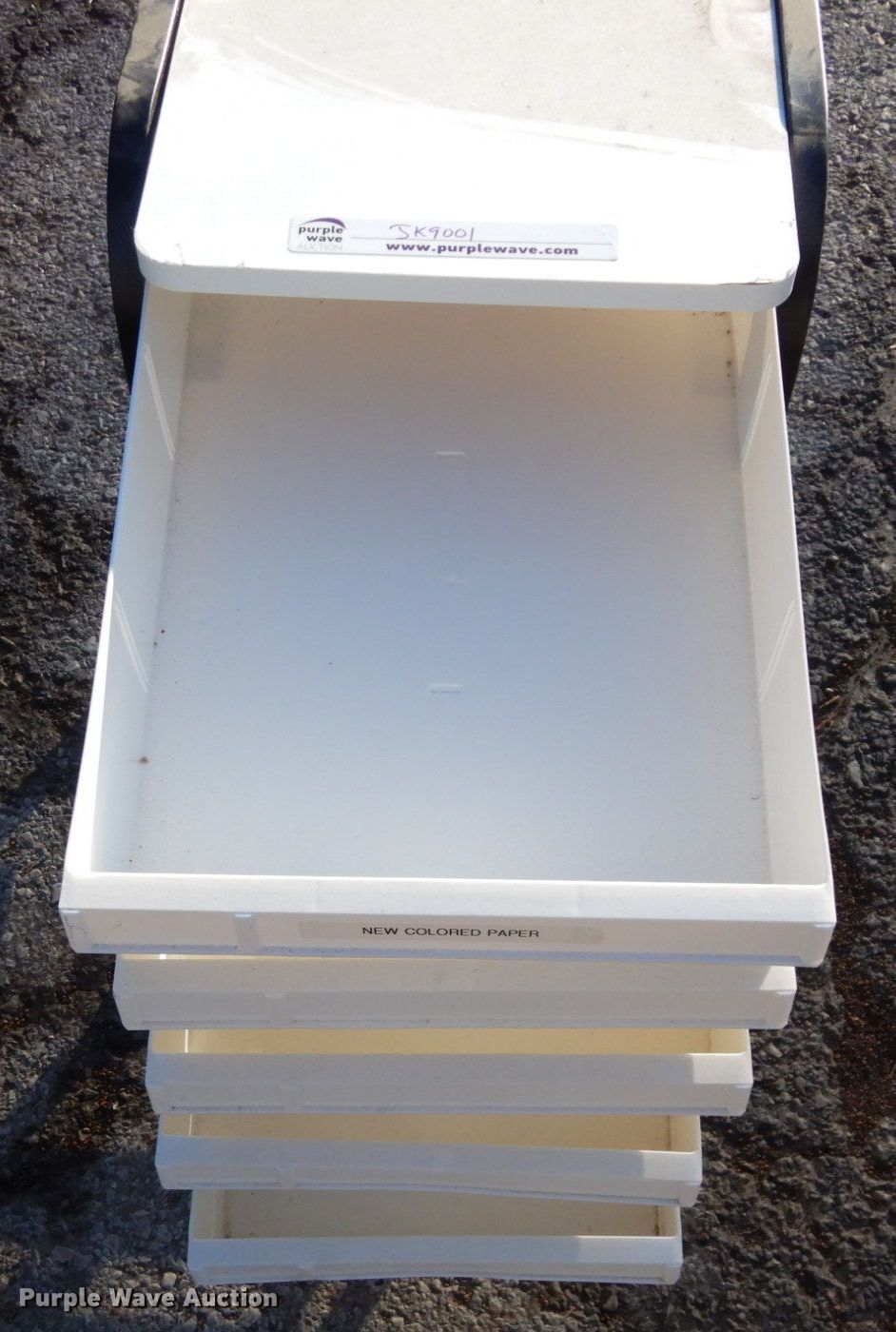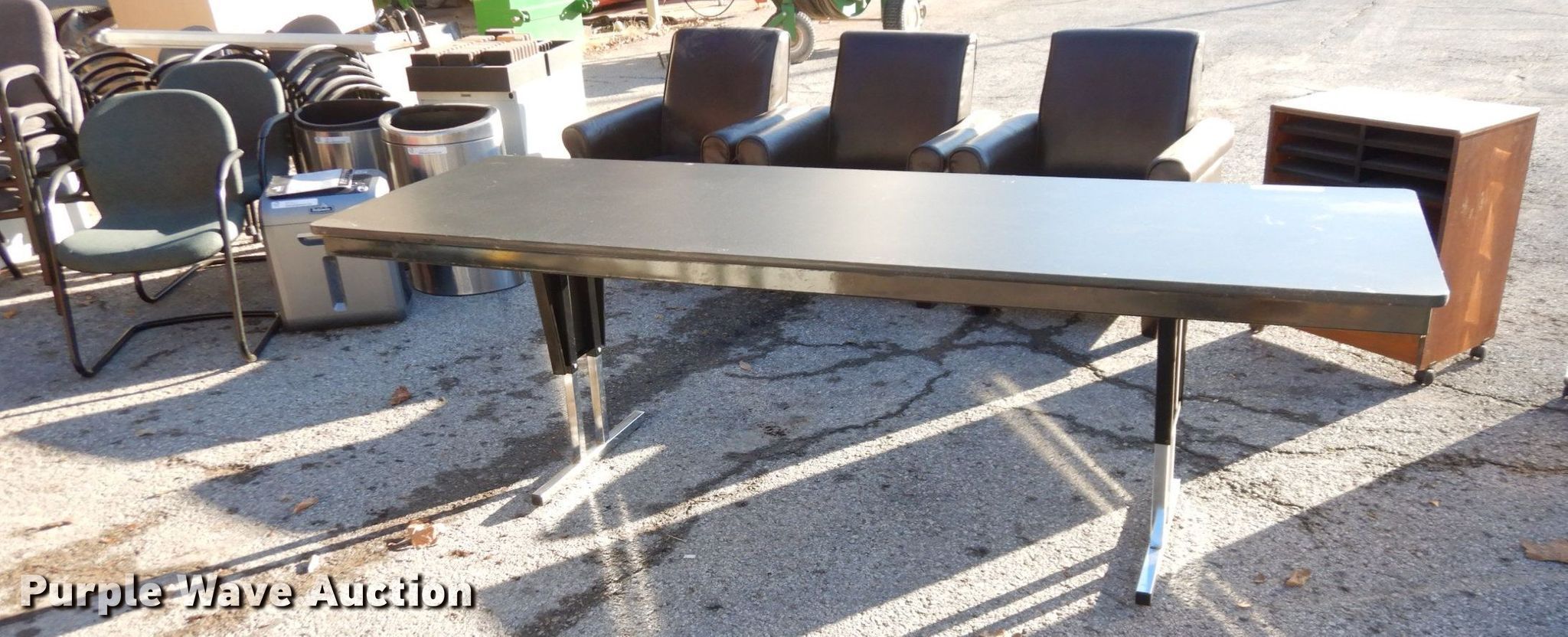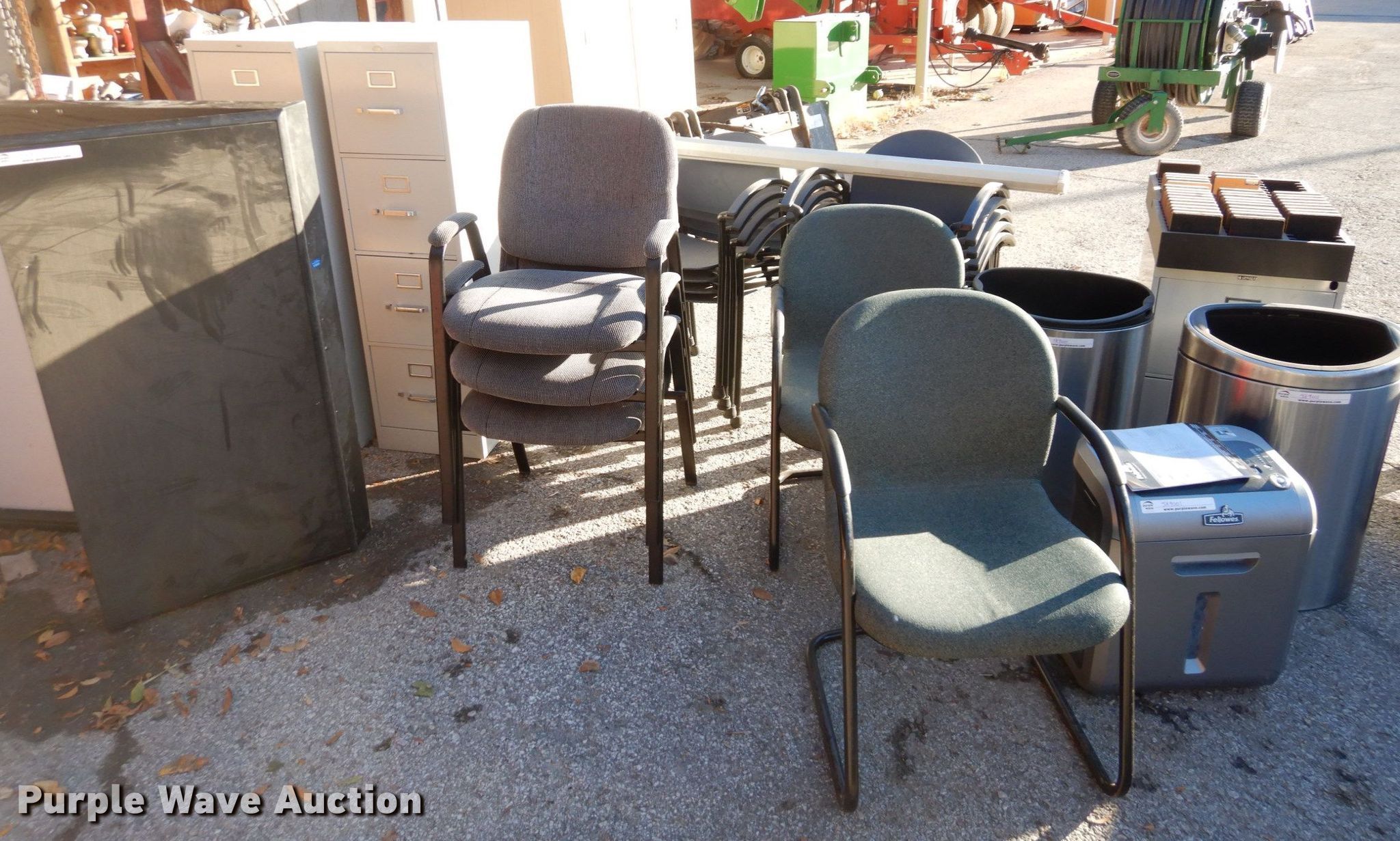 Purple Wave is selling a used Office Supplies and Equip. in Kansas. This item is a Office furniture with the following: (2) five drawer carts, 14" W x 26" H, 22" W x 33" H, Barricks 10' L folding table, Cabinet, 23.5" W x 30" H, Approx. 17 chairs, (2) 27" H metal trash cans, Fellowes DS-16C paper shredder, 3.5" alphabetical and numerical dies, Rack, (3) file cabinet, (2) four drawer, Two drawer, Apollo projector screen, Cabinet, White board, (4) conference tables, 57" L x 36" W