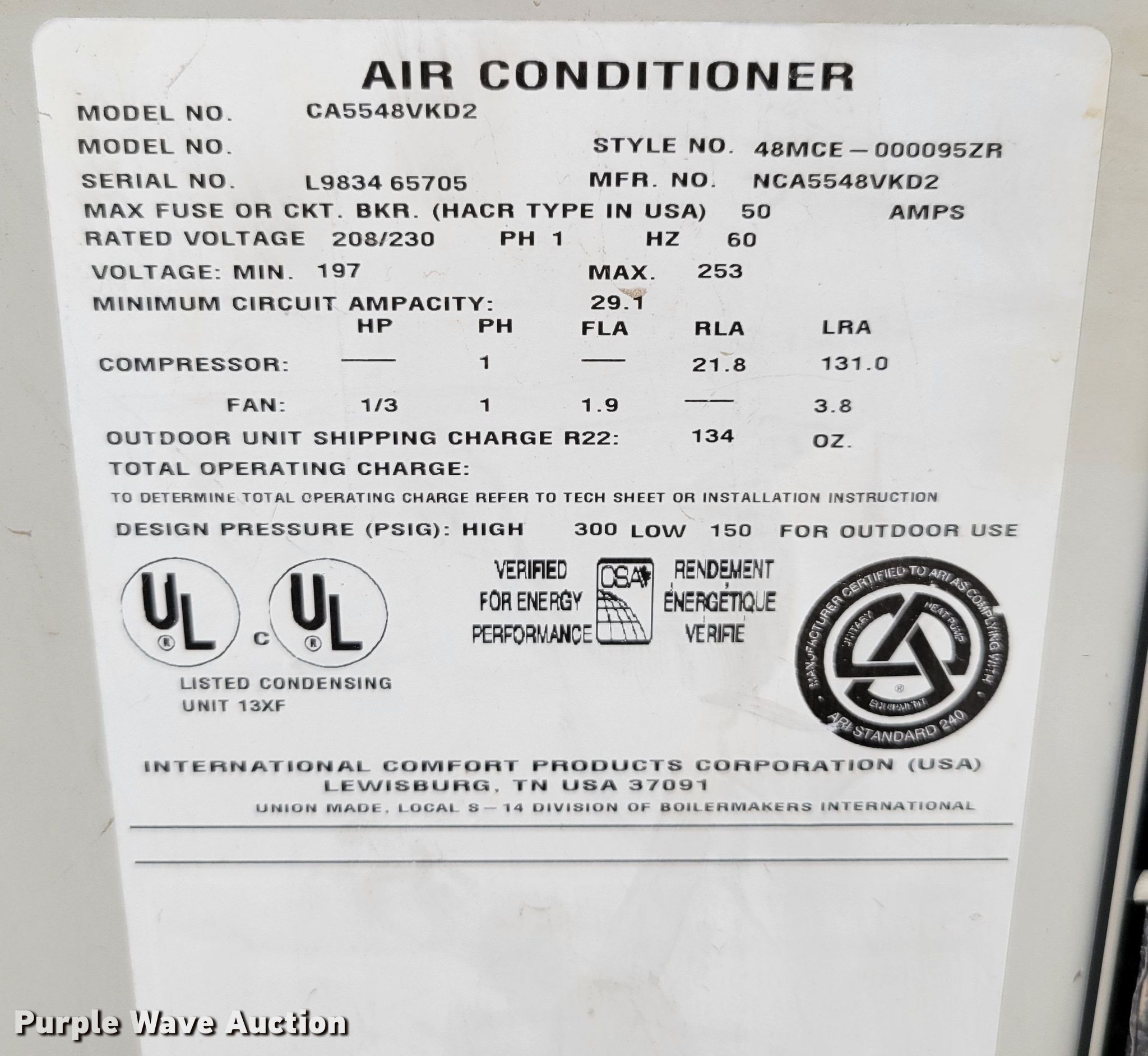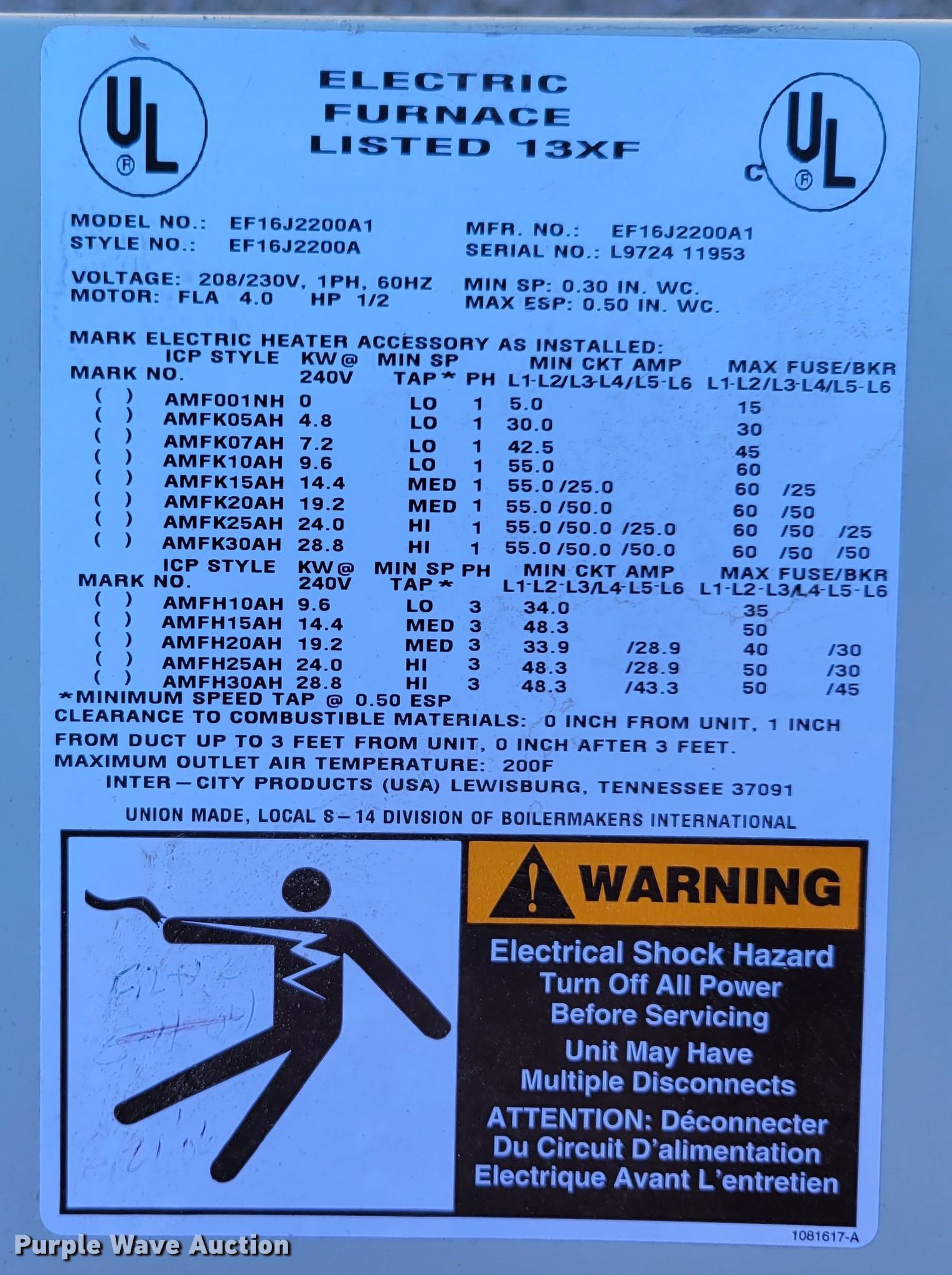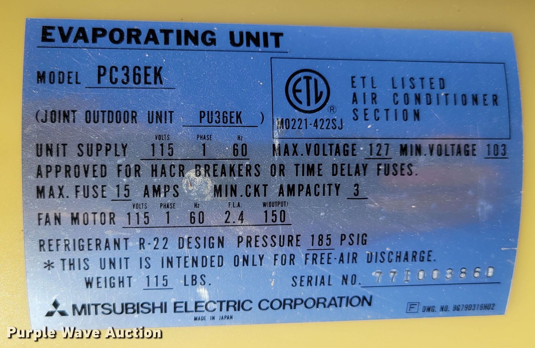 Purple Wave is selling a used Appliances in Iowa. This item is a (3) appliances with the following: Furnace, Model: EF16J220041, Electric motor, Volts: 208/230, Single phase, 1/2 HP, 60 Hz, Serial: L9724 11953, TempStar 5000 AC unit, Model: CA5548VKD2, Single phase, 50 amps, 60 Hz, Serial: L9834 65705, Mitsubishi Electric Mr. Slim furnace, Unknown operating conditions