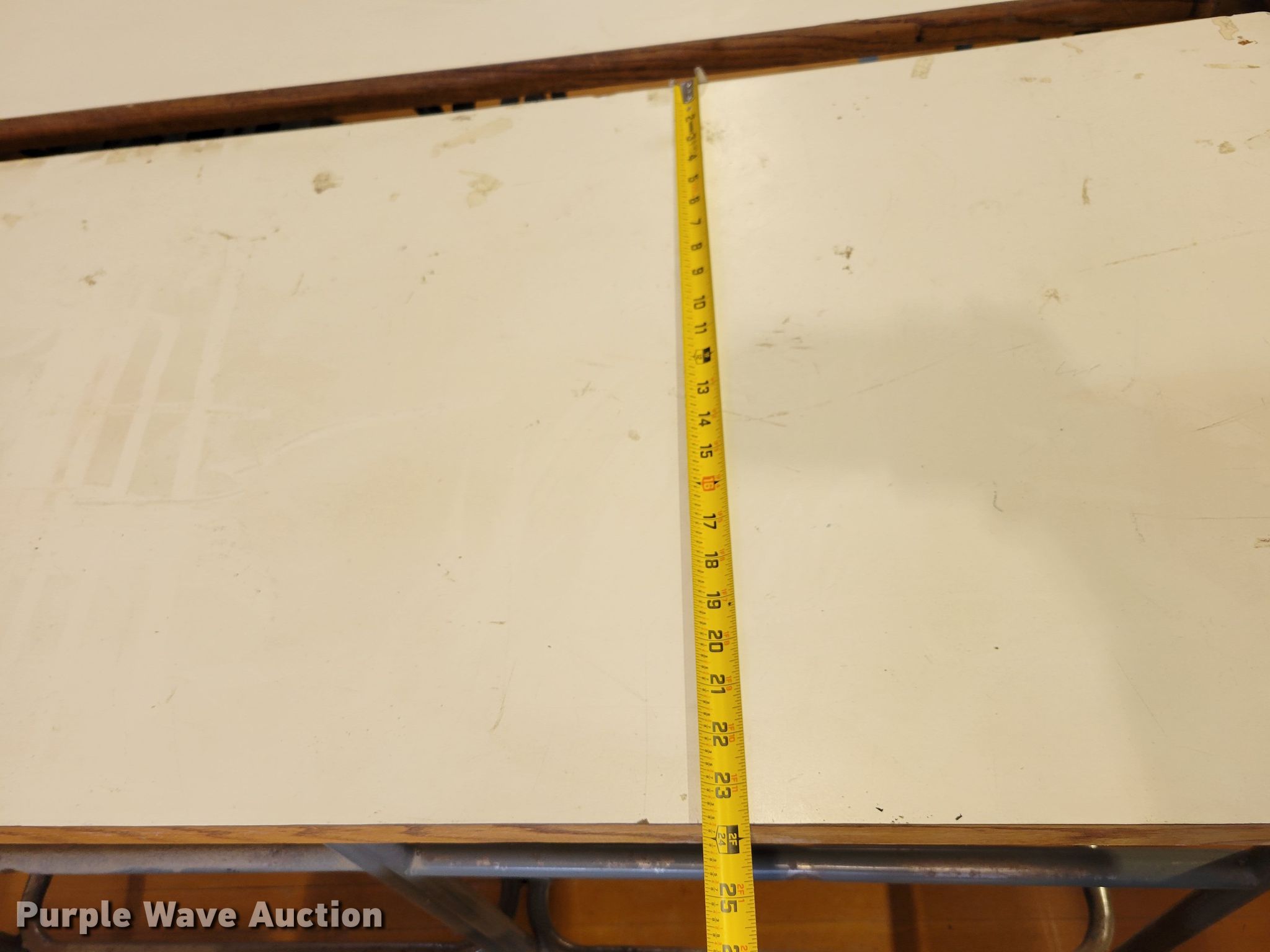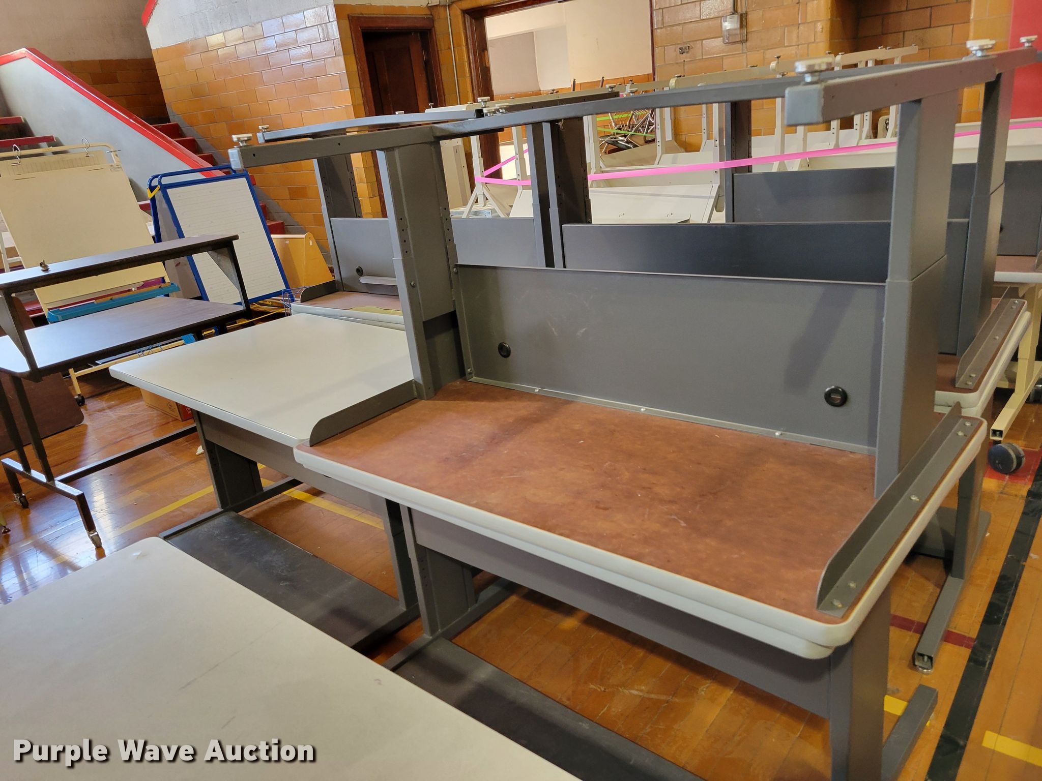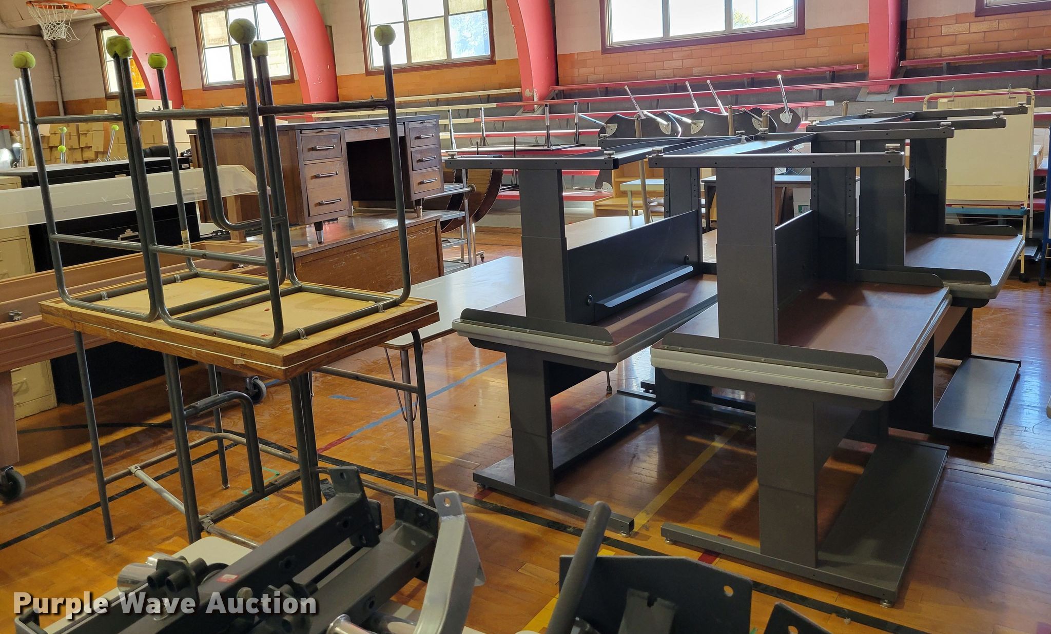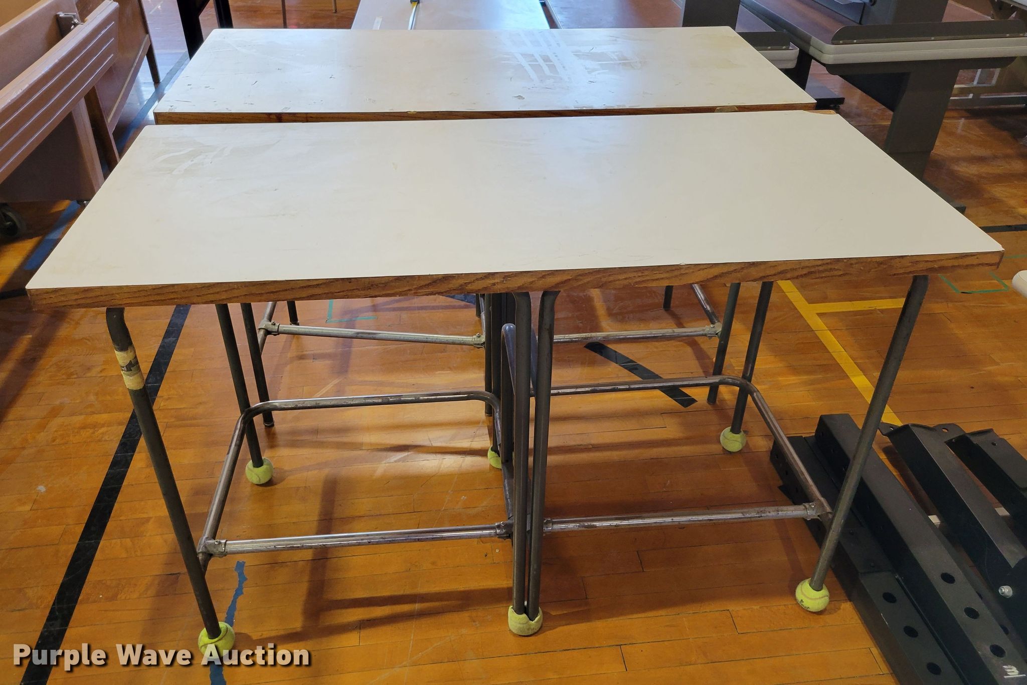 Purple Wave is selling a used Furniture in Iowa. This item is a (14) tables with the following: 57"L x 23"W x 29"H, 48"L x 29.5"W x 30"H, 60"L x 30"W x 27"H, (2) 55"L x 24"W x 36"H, (7) 48"L x 30"W x 27"H, (2) folding tables, 48"L x 30"W x 30"H, (2) carts, 31"L x 36"W x 40"H, 22"L x 24"W x 38"H