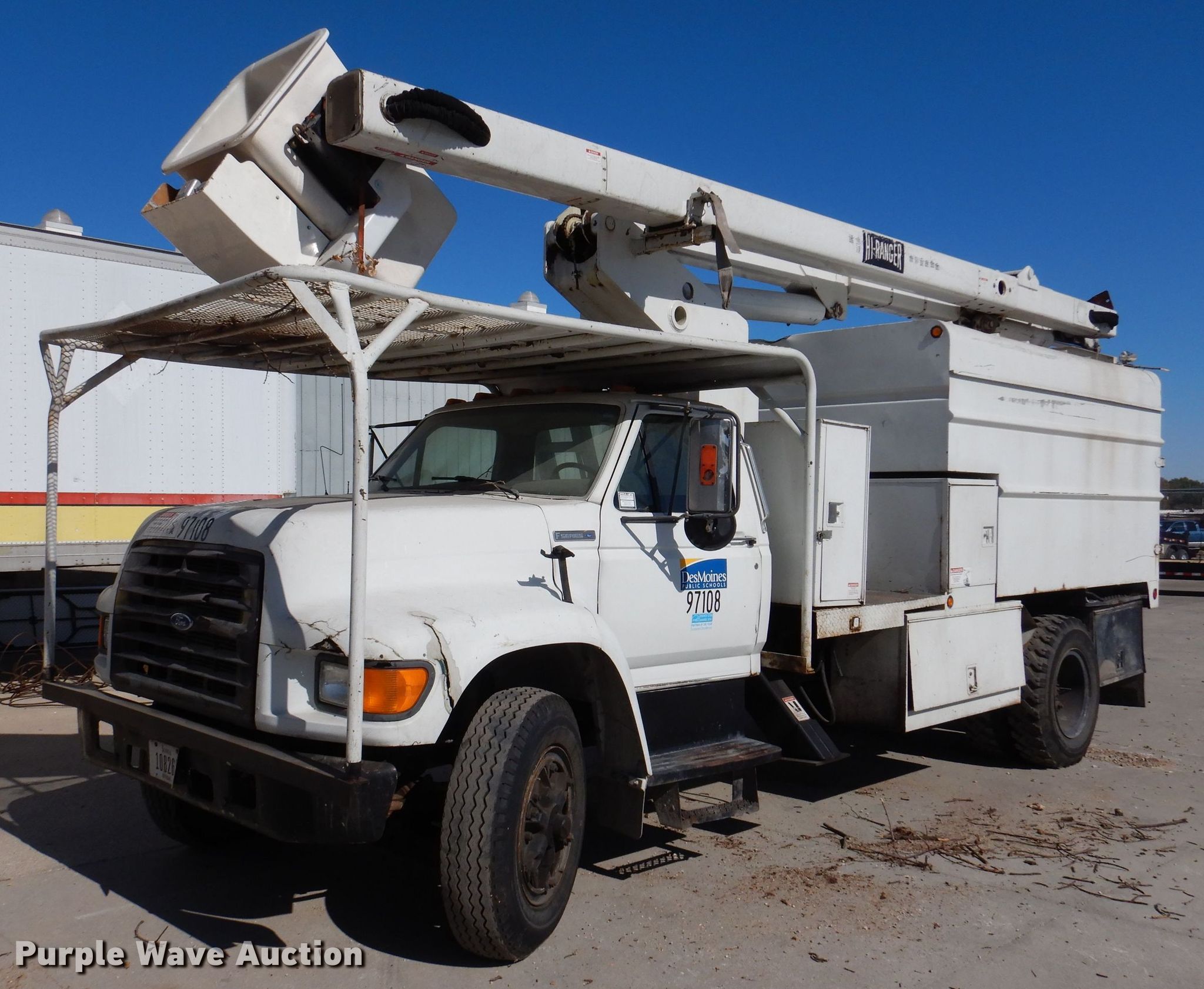1997 Ford F800 forestry bucket truck. Miles: 75,687 on odometer, VIN: 1FDNF80CXVVA36037. Engine Cummins B5.9, Serial: 45438591, Displacement: 5.9L, Cylinders: 6, Fuel type: Diesel, HP: 175. Transmission Manual, Speed: 5. Chassis Axles: Single, Suspension: Spring, Brakes: Hydraulic, PTO, GVWR: 25,380 lbs, Wheelbase: 190". Interior Heat. Features Chip bed Simon-Telect XT-52, Serial: 129620755, 11' x 92" W, Boom 1997 Hi-Ranger XT52, Boom length: 52', Mast height: 10', Maximum lift capacity: 350 lbs, Maximum lift height: 62', Man basket, Boom controls Platform/ basket.. Tires Size: 9-20. Notes Non-operational bucket leveler, Outrigger hydraulic leak, Contents not included. Iowa title. Mileage has not been verified. Exempt will be written in the odometer disclosure on the title. Seller is a government entity who will be assigning and distributing the title. Please contact the seller for distribution questions. Des Moines Public Schools. 1917 Dean Ave. Des Moines, IA 50316