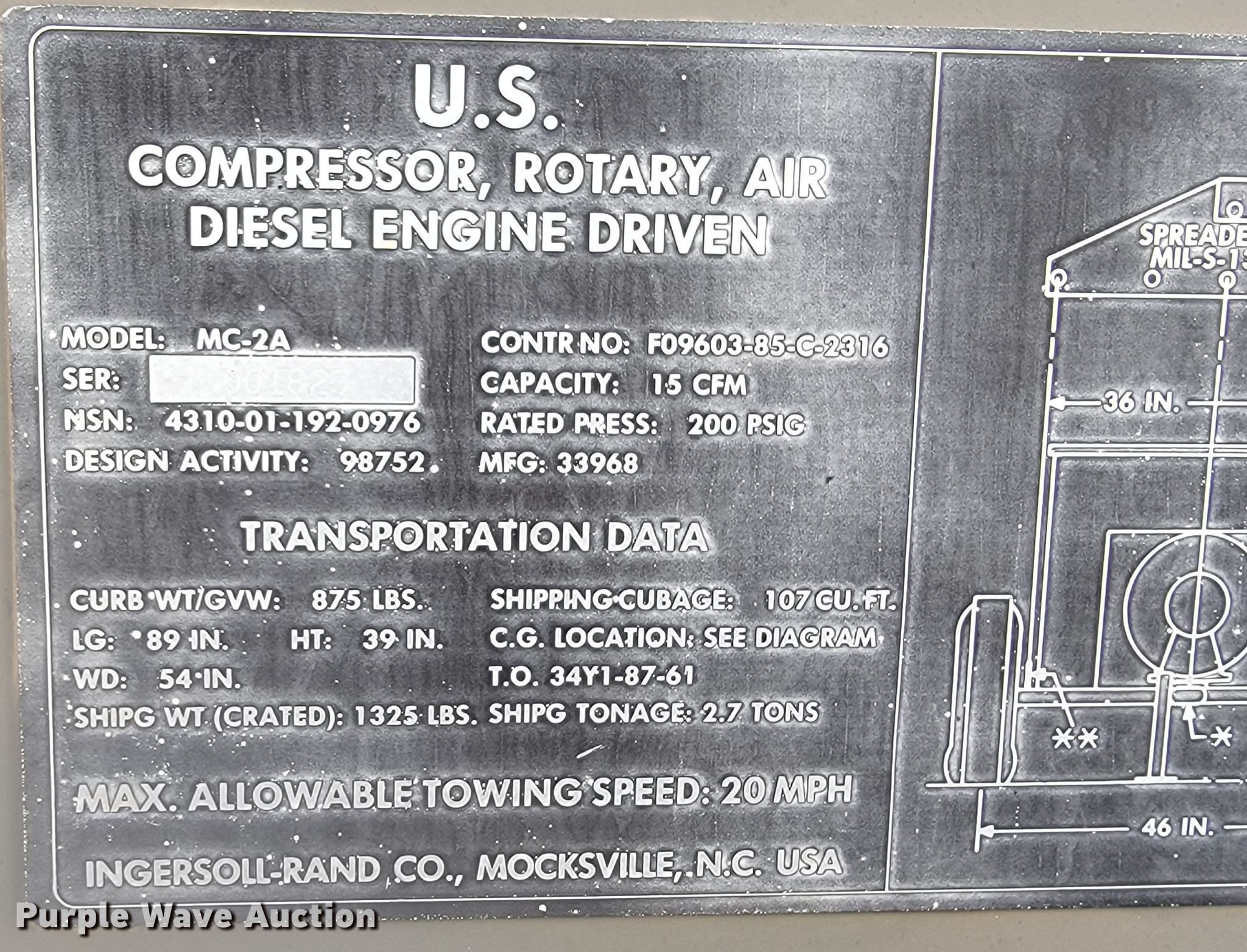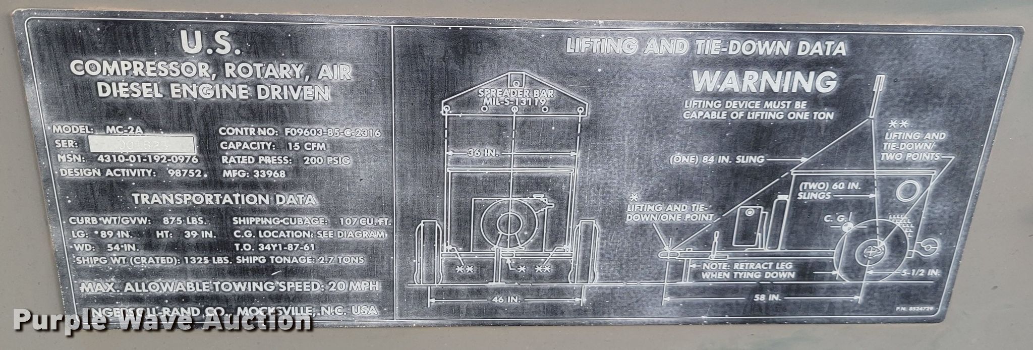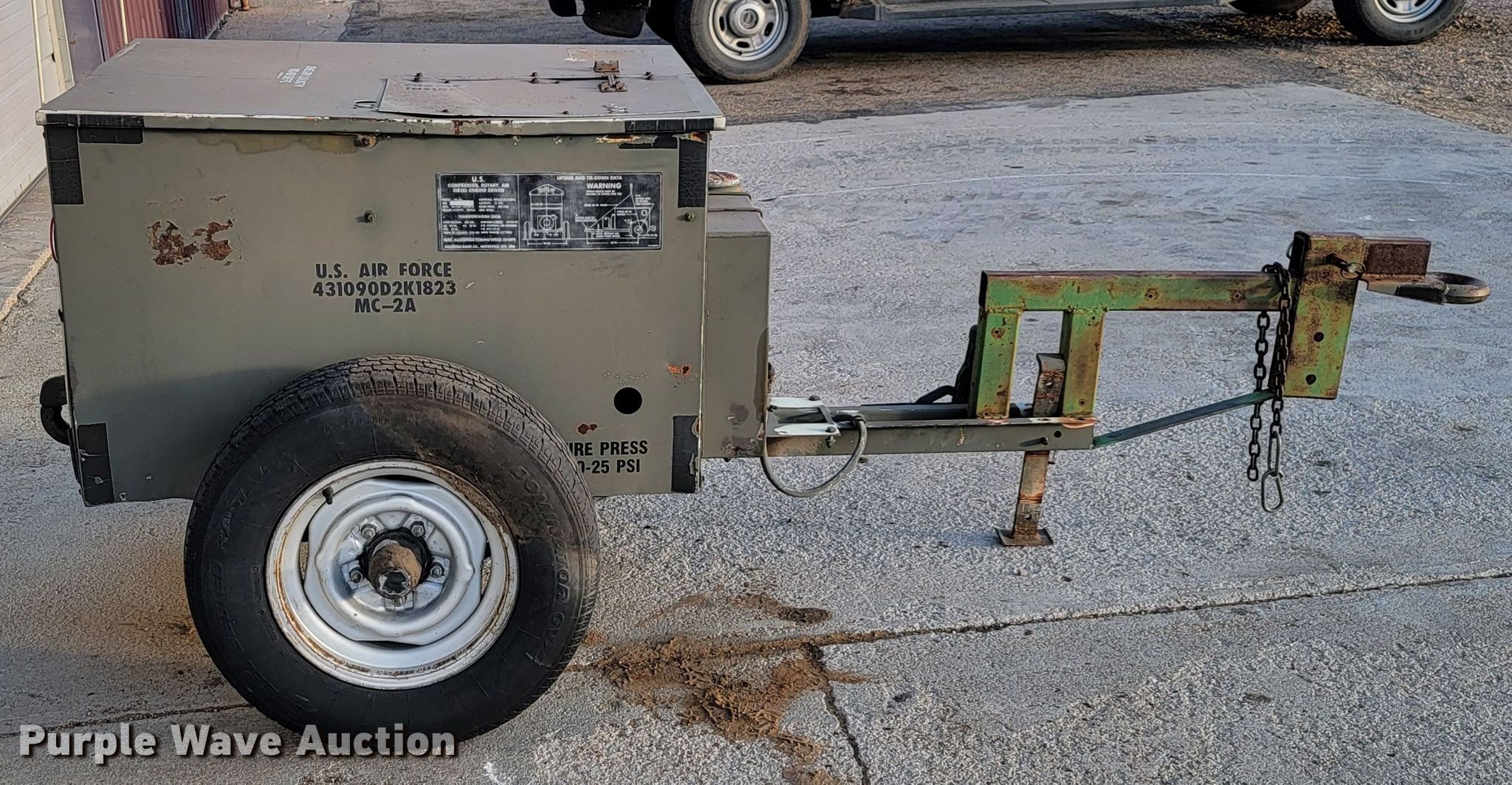 U.S. Compressor MC2A air compressor. Engine. Cylinders: 1, Fuel type: Diesel. Features CFM: 15, PSI: 200. Trailer Suspension: Spring, Axles: Single, Tire size: P215/75R15. Transfer of ownership documentation will be a bill of sale. Cherry County Road Department. Mullen, NE 69152