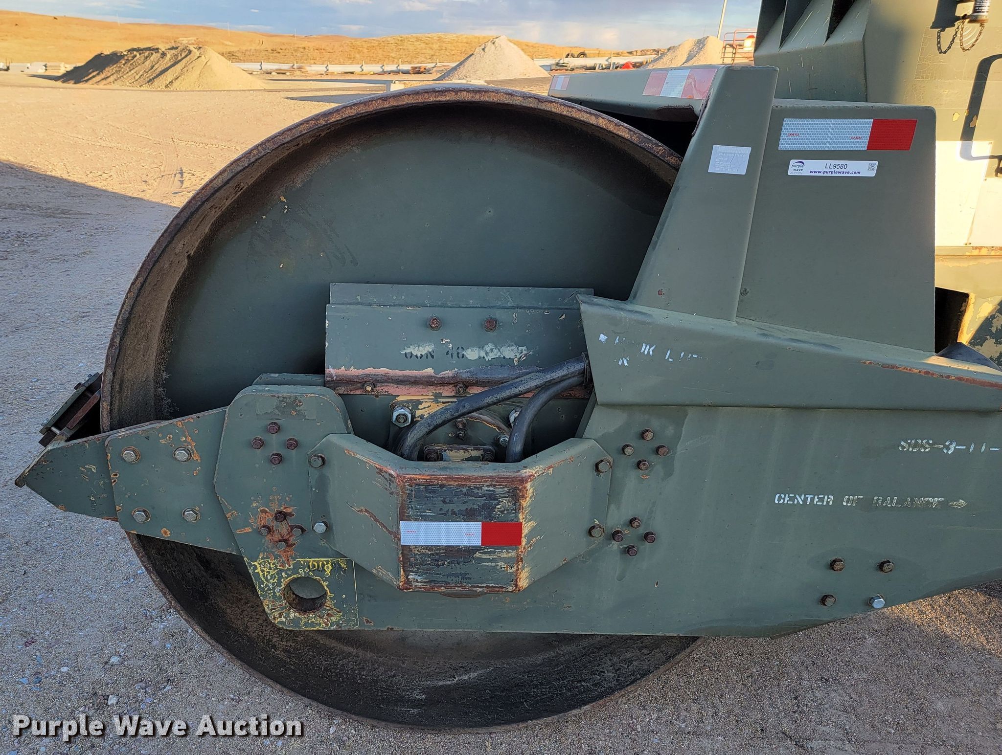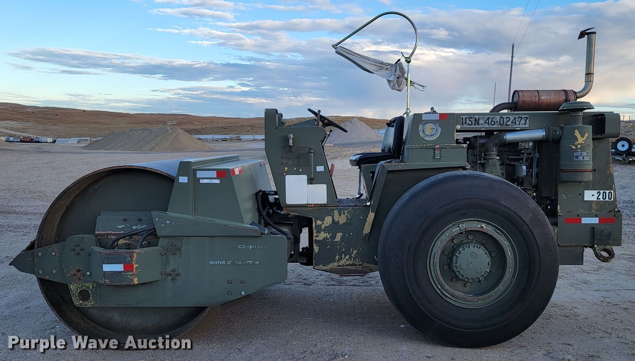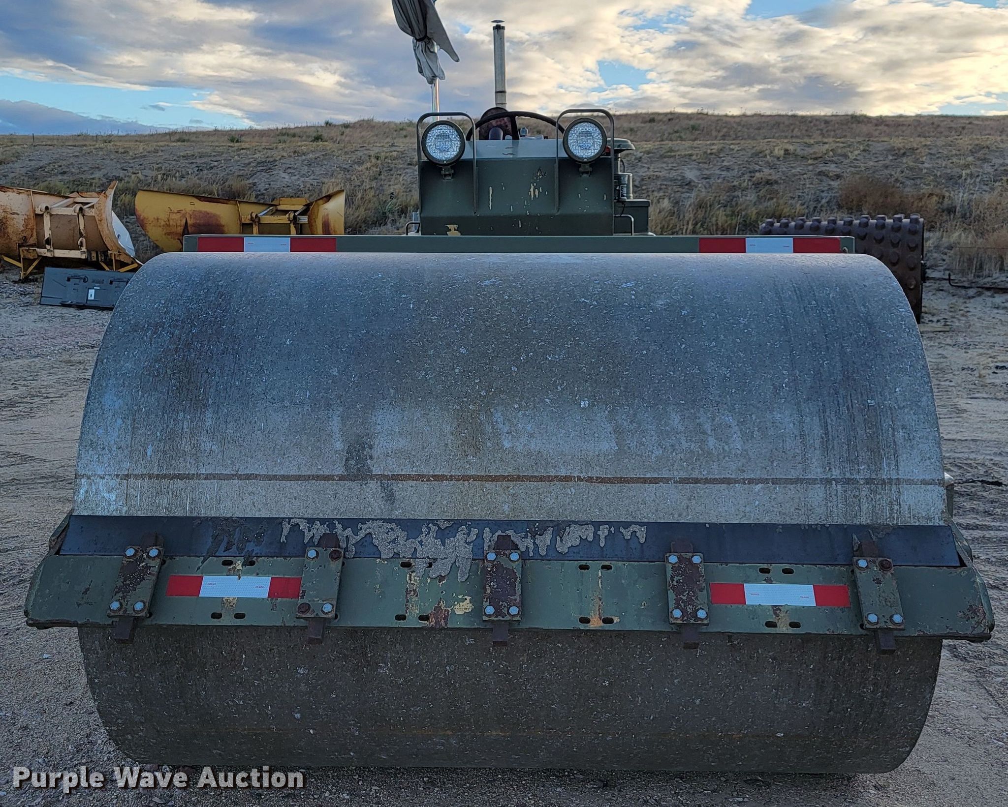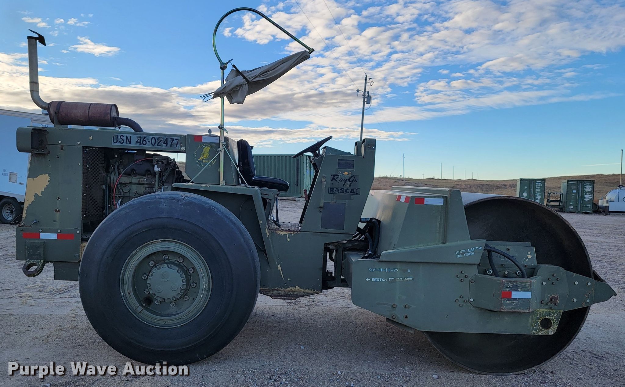 Raygo Rascal single drum roller. Hours: 18 on meter, Serial: 18B0178. Engine Detroit Diesel, Cylinders: 4, Fuel type: Diesel. Transmission Hydrostatic. Features Drum: Smooth, Vibratory system: Single, Front drum Width: 80", Diameter: 59", Drum scrapers: Front. Tires Size: 20.5-25. Notes Additional padfoot drum. Cherry County Road Department. Mullen, NE 69152